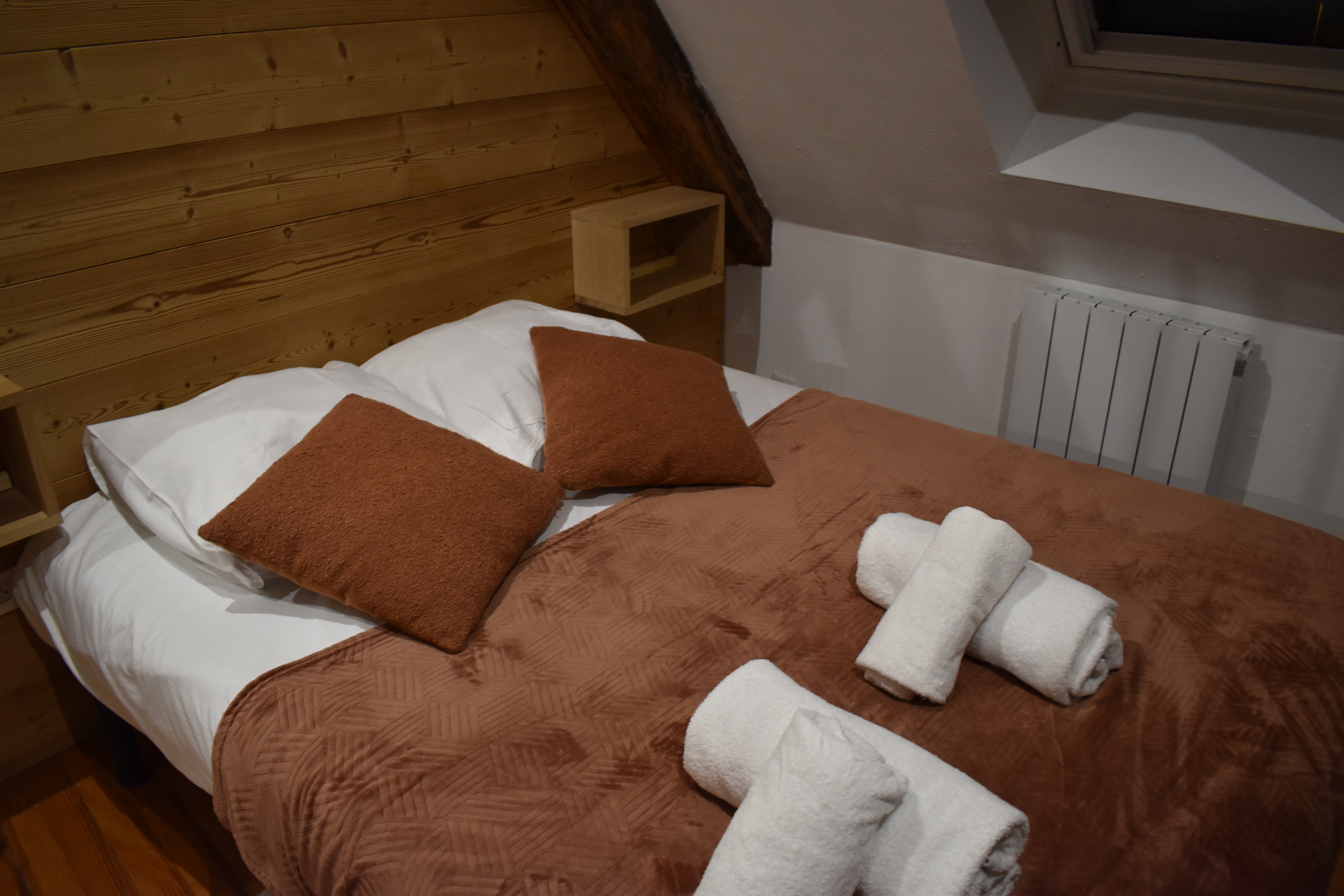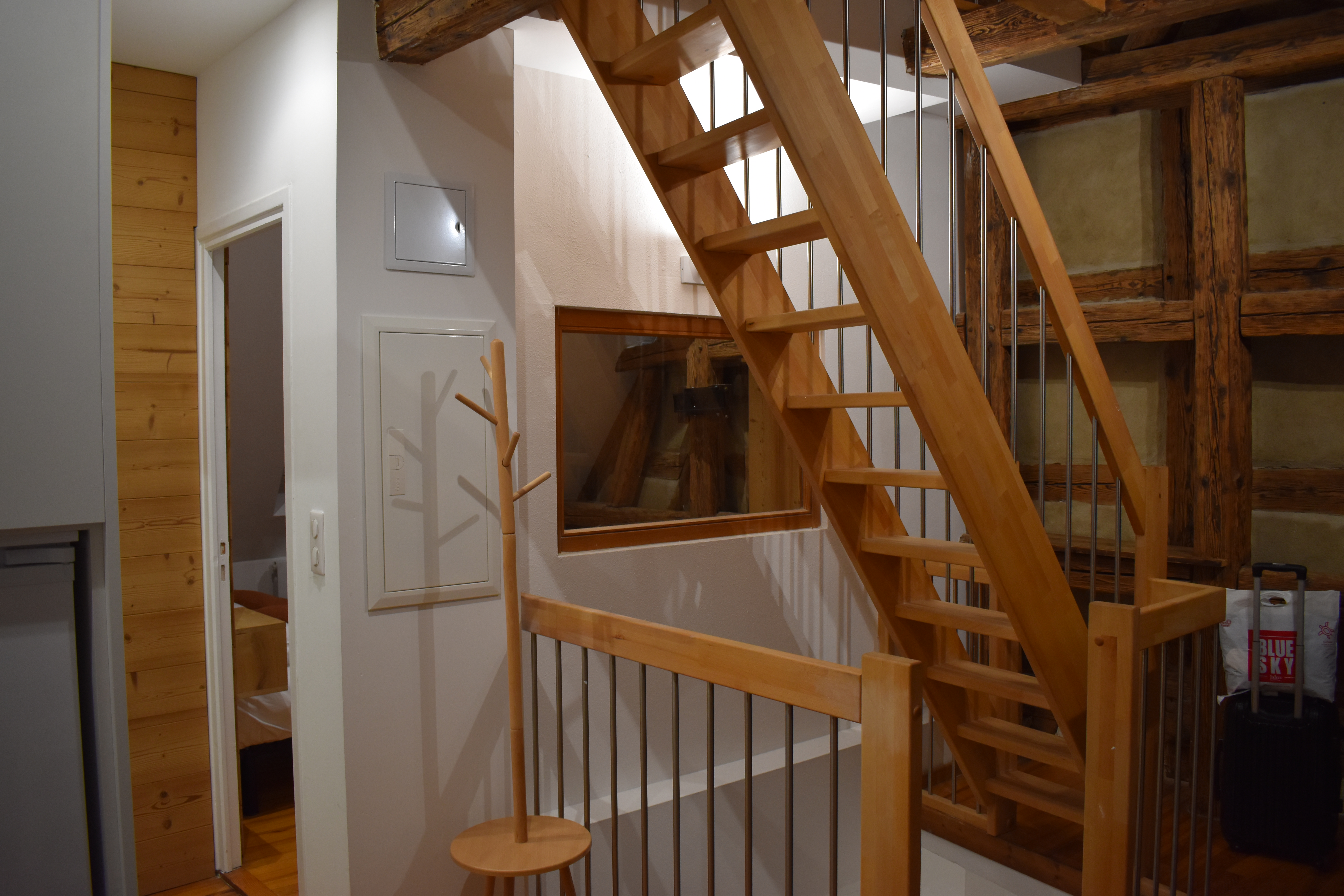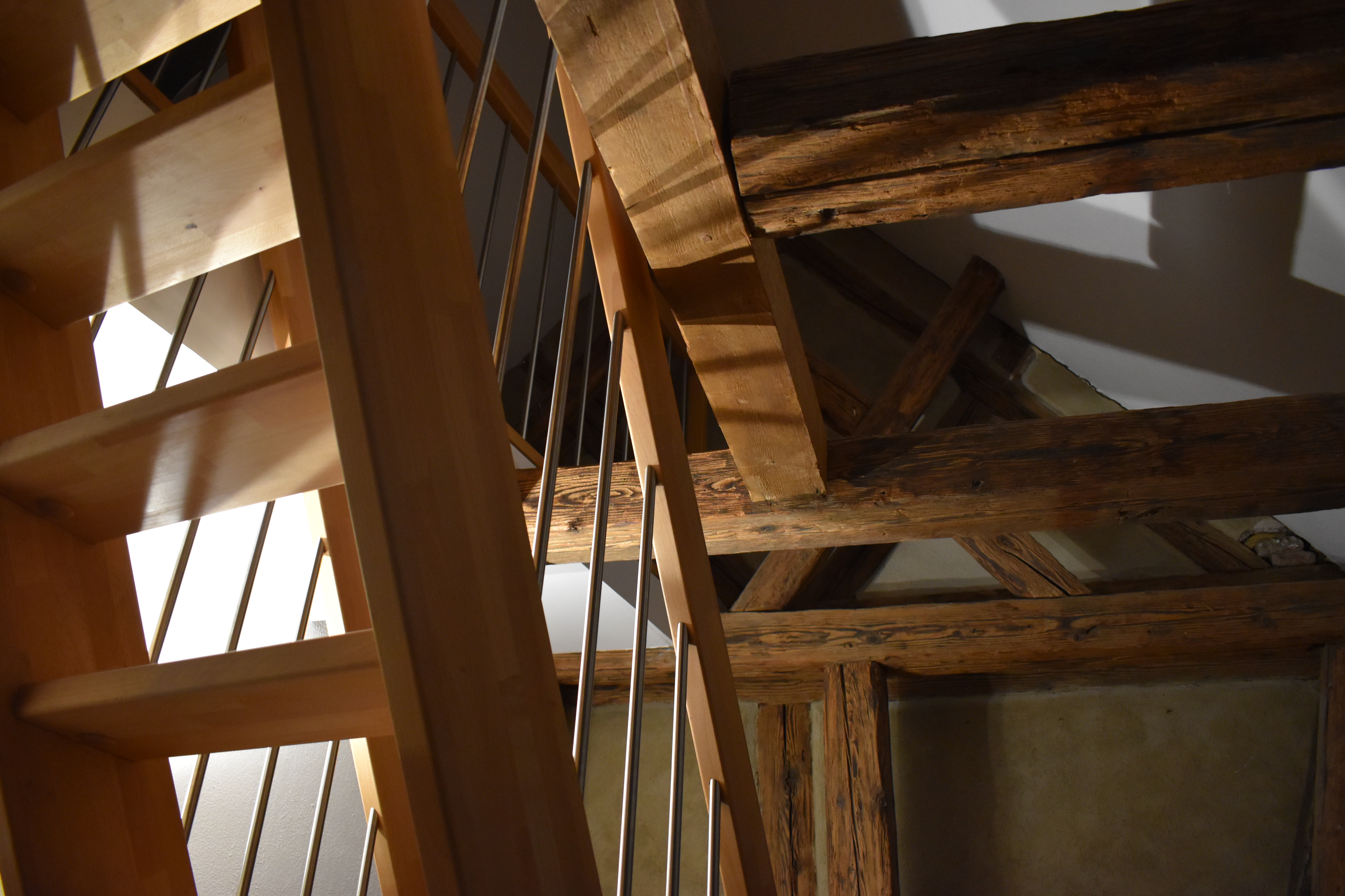 アパートの中に入ると、外観から見える木組みの骨格を家の中からも見ることができた。 最上階の部屋なので、尖った屋根の形に合わせて壁が斜めにせり出している。 木組みの家を存分に堪能できるいい部屋だ。