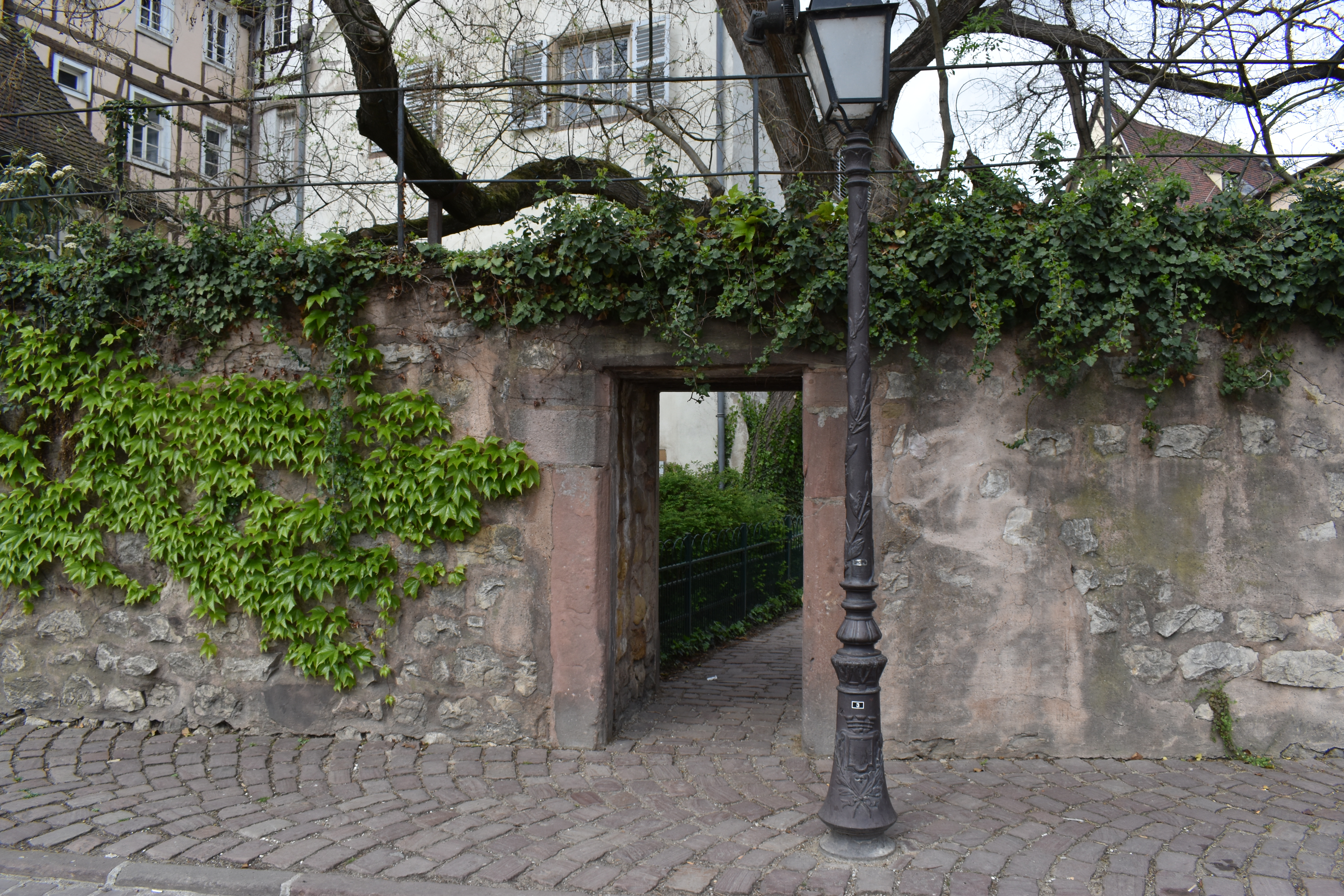 広場の喧騒とは打って変わって、人気の少ない閑静な空間があった。 こういう喧騒から隔絶された空間は好みだ。 正面に向かって進んでいくと、蔦のはっている壁に人が1人通れるくらいのトンネルが開いていた。 ここはごちうさの作中で神沙姉妹が通ったトンネルである。