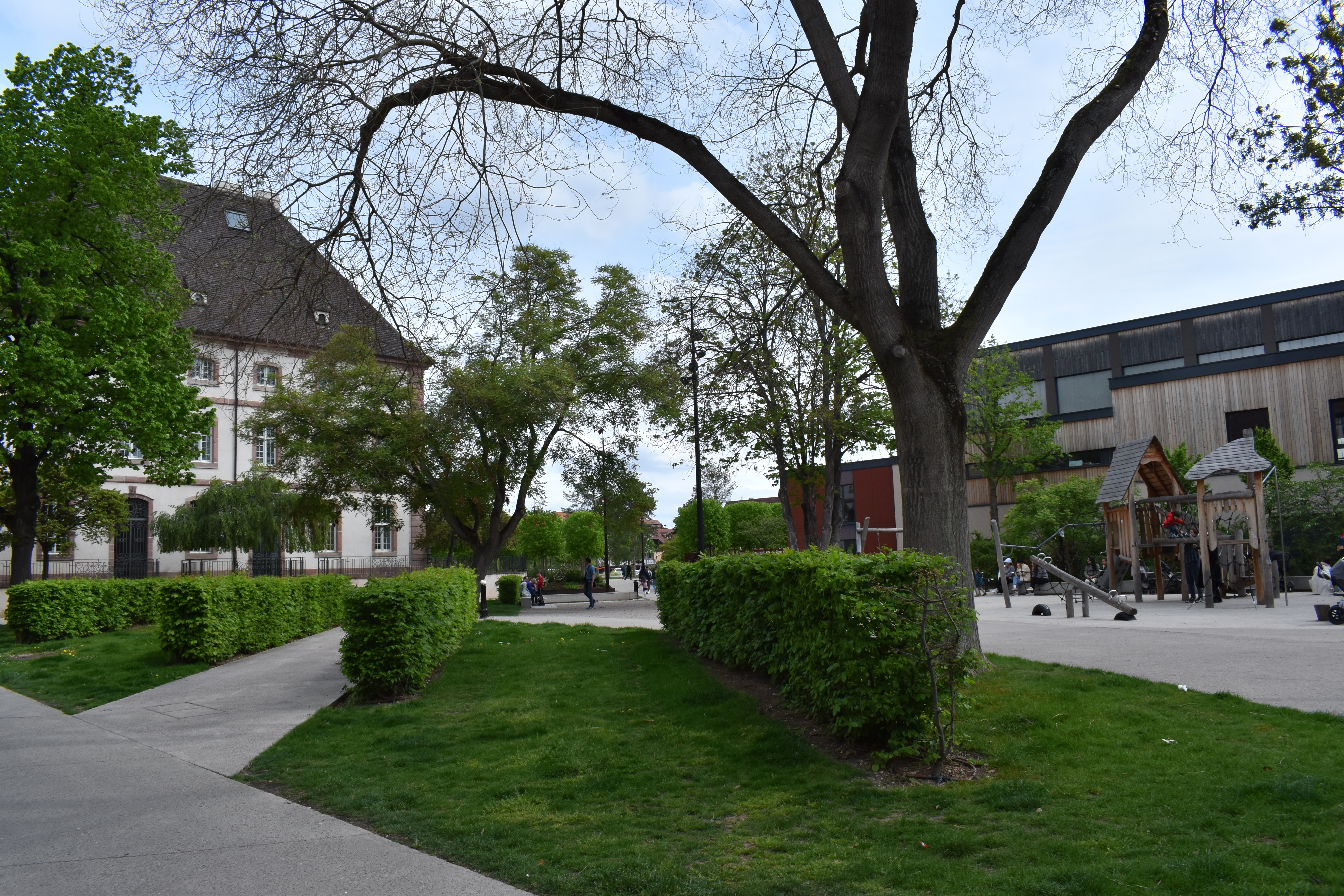 トンネルを潜ると、目の前には緑でいっぱいの開けた公園が現れた。 公園の中には遊具があり、地図を見ると遊び場ということだ。 通りに対して斜めに伸びている道がおしゃれだ。 このモンターニュ・ヴェルト通り (Rue de la Montagne Verte) を左側へ歩いていくと、次の目的地がある。