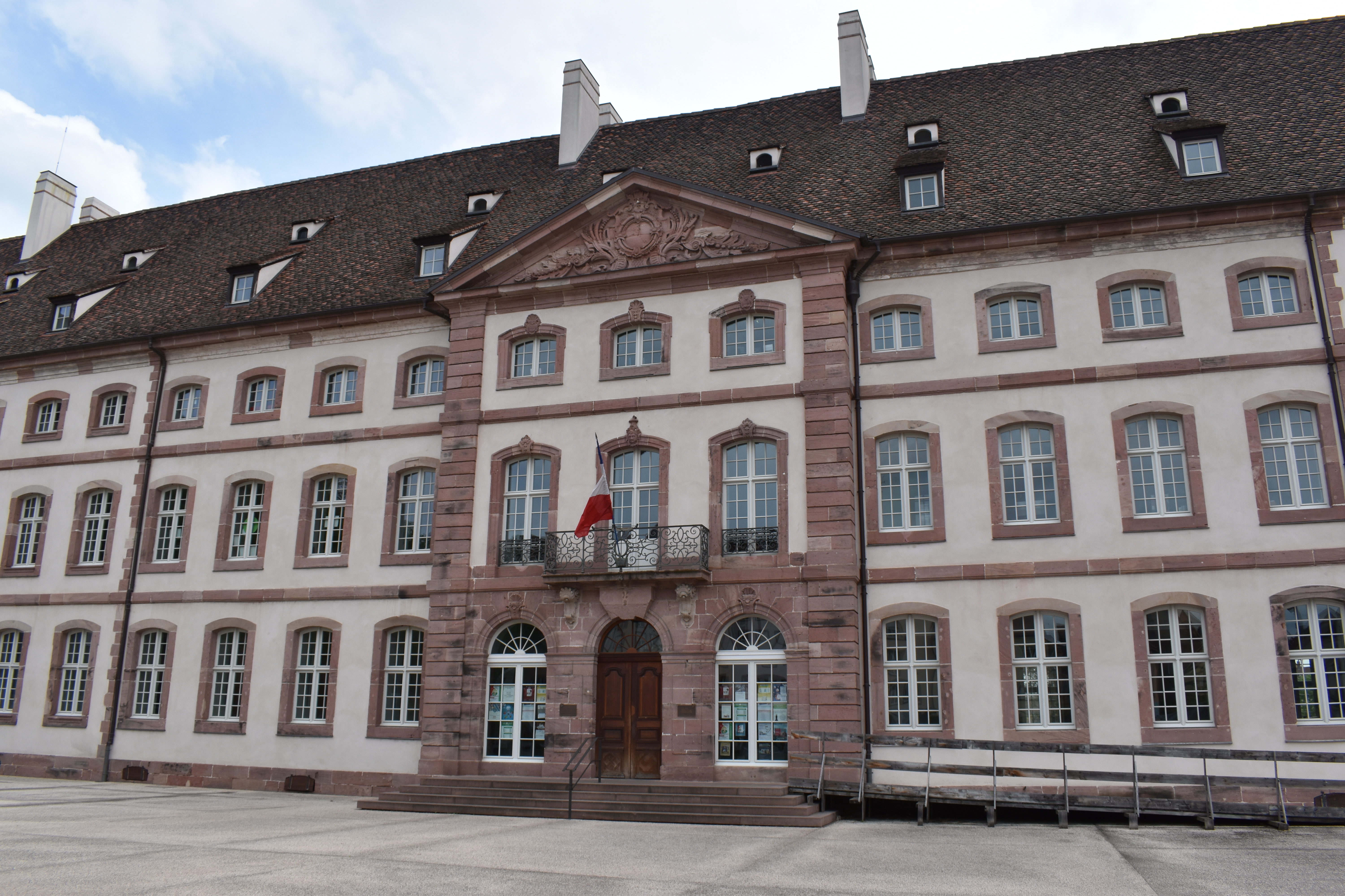 公園に到着した。 これは昨晩プロジェクションマッピングが投影されていた建物、ポール・エドモンド・キュルチュール・エドモンド・ゲレ (Pôle Média Culture Edmond Gerrer) という名前の図書館である。 ごちうさの作中では、ココアと千夜、そしてチノが通う高校のモデルになっている。