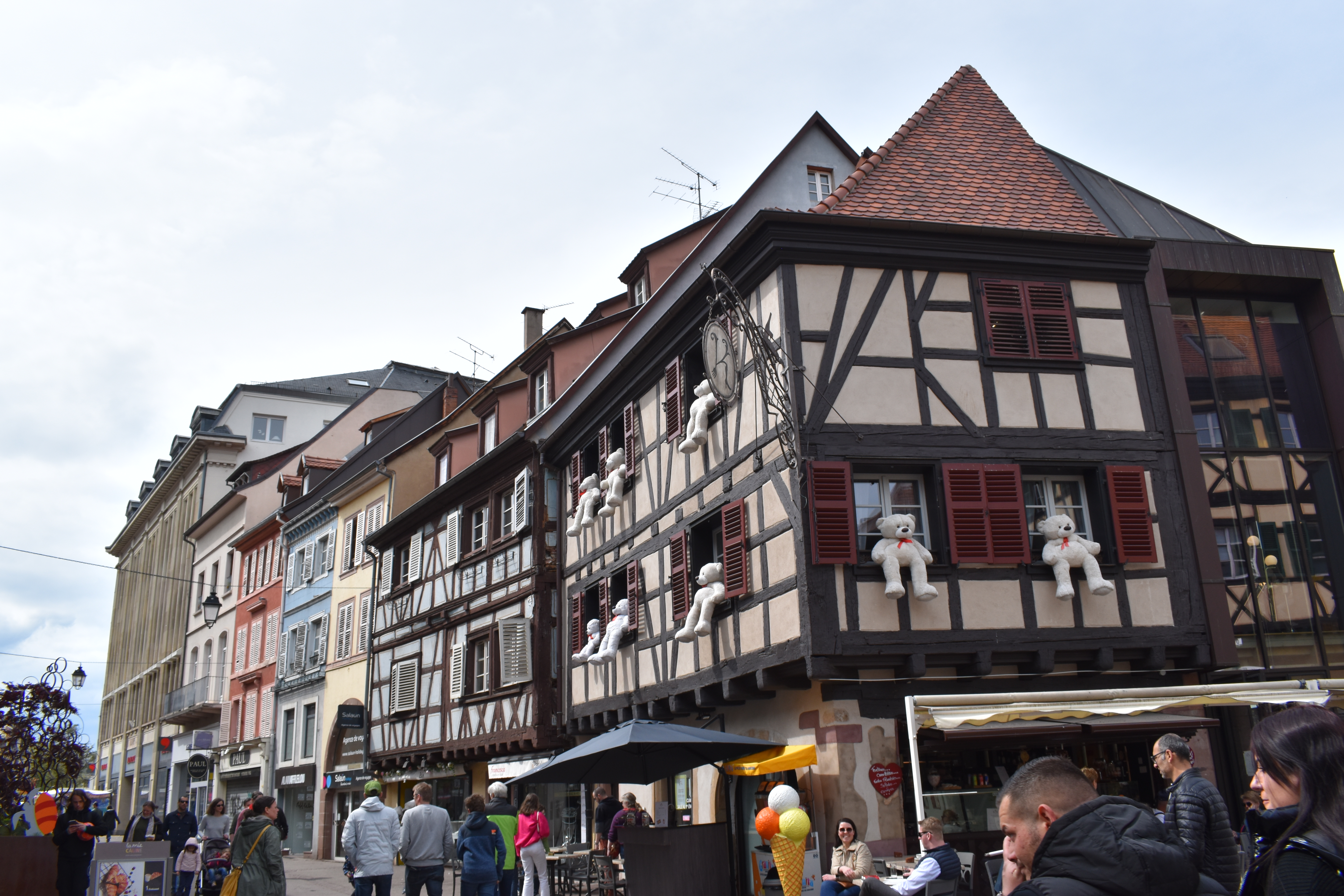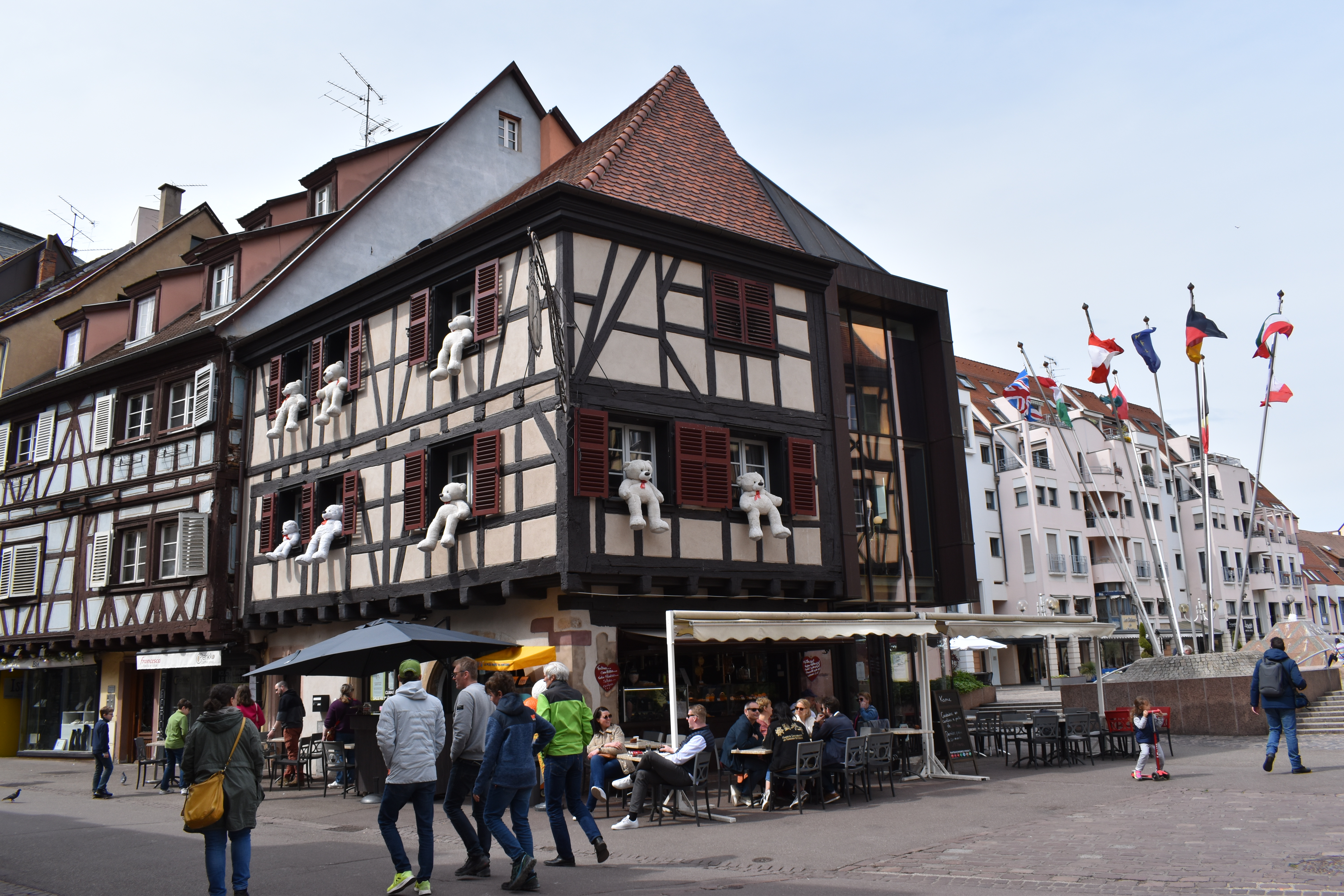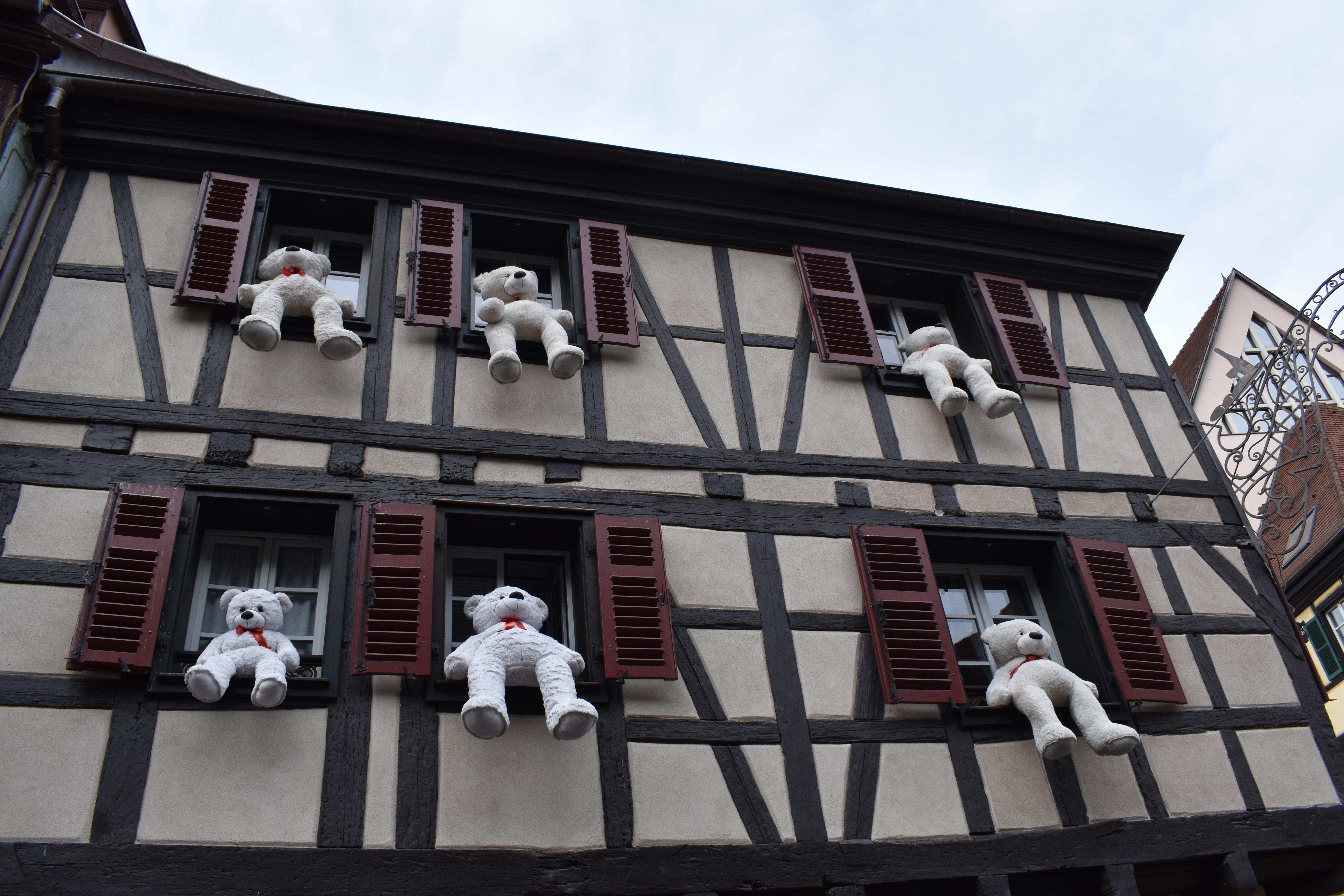 木組みの家と熊のぬいぐるみの相性の良さは抜群である。 この建物はスタバのすぐ近くにあるので、コルマールに寄った際は是非テラス席に座り、この建物を眺めてメルヘンな気分を味わいながらコーヒーを飲んでいただきたい。