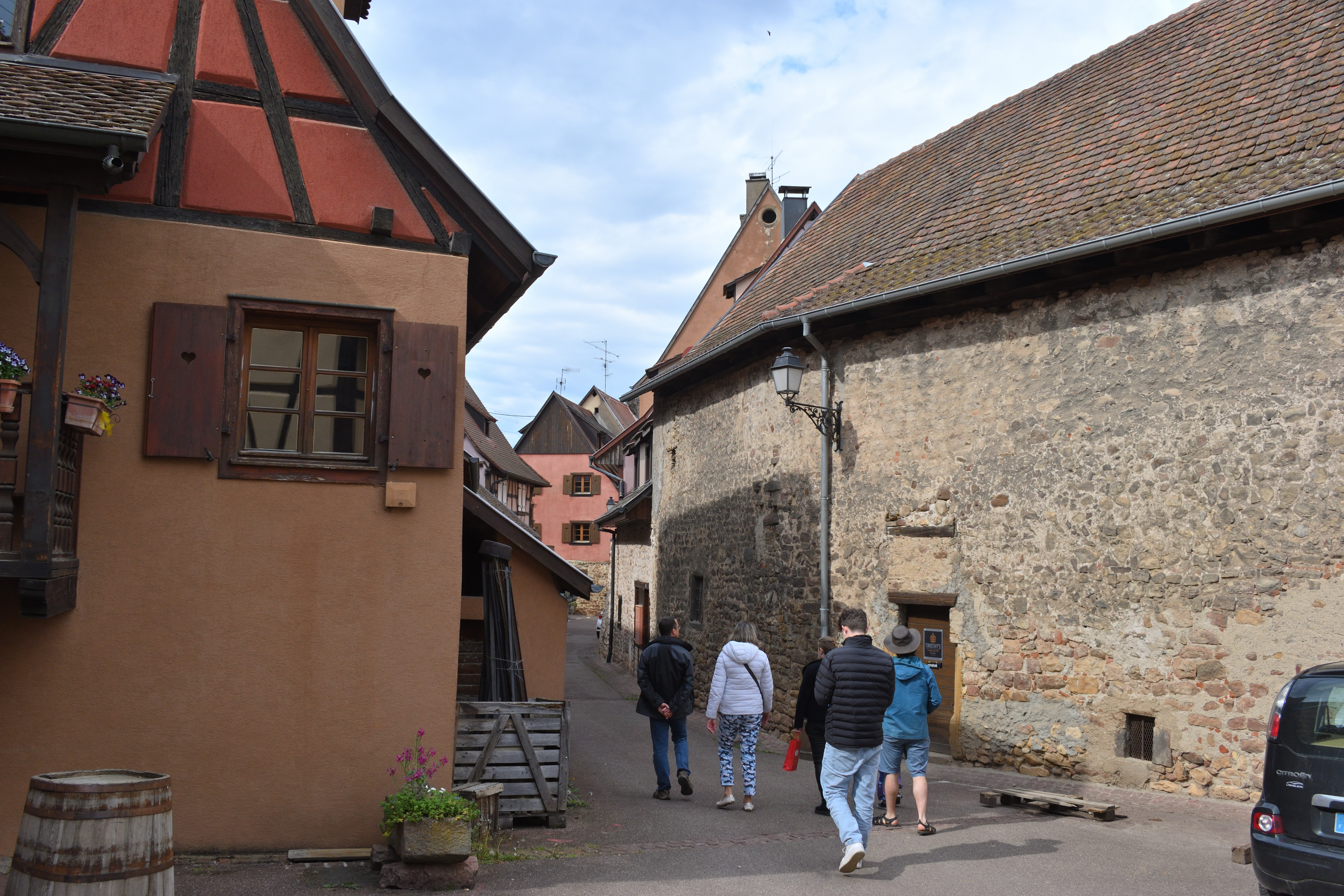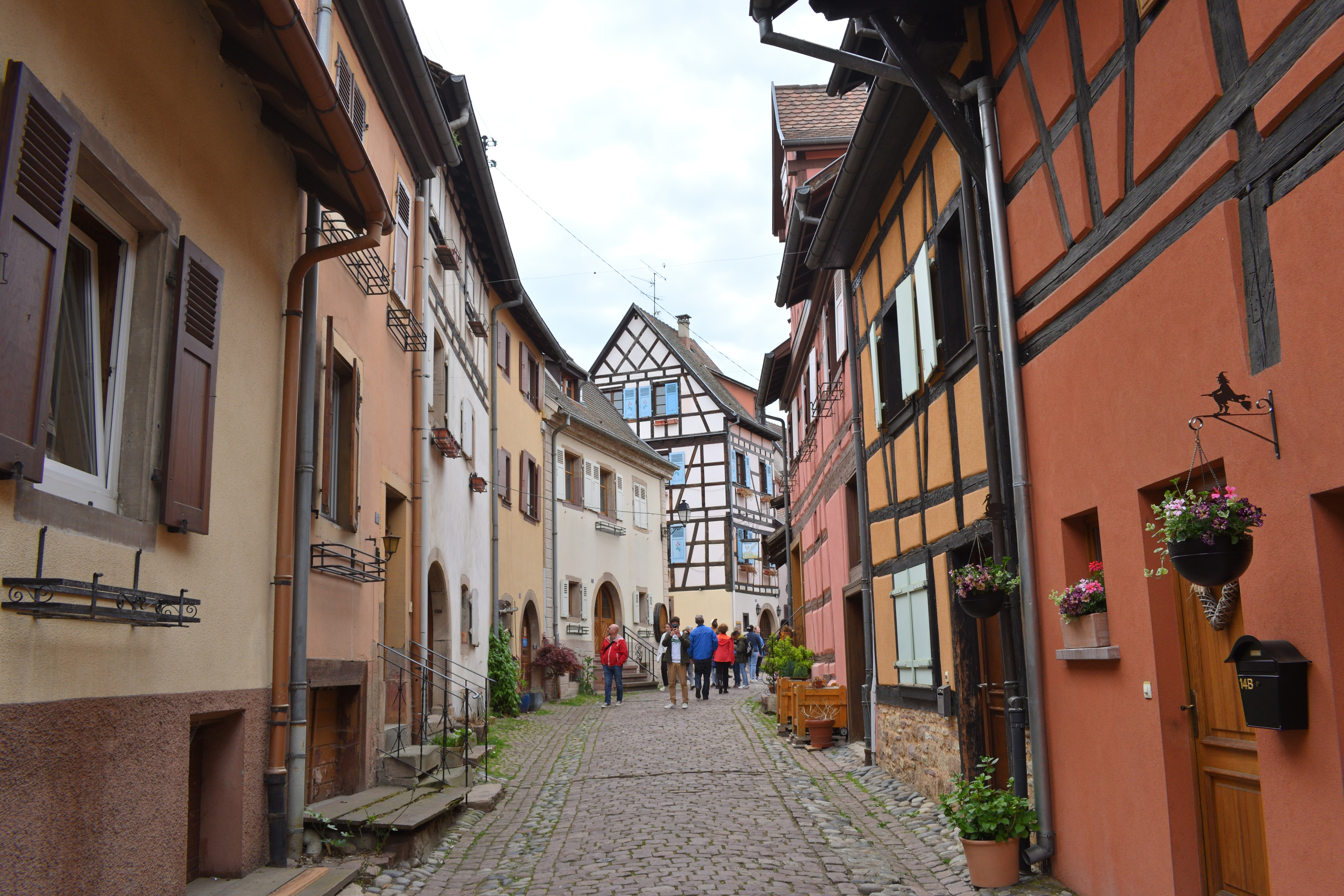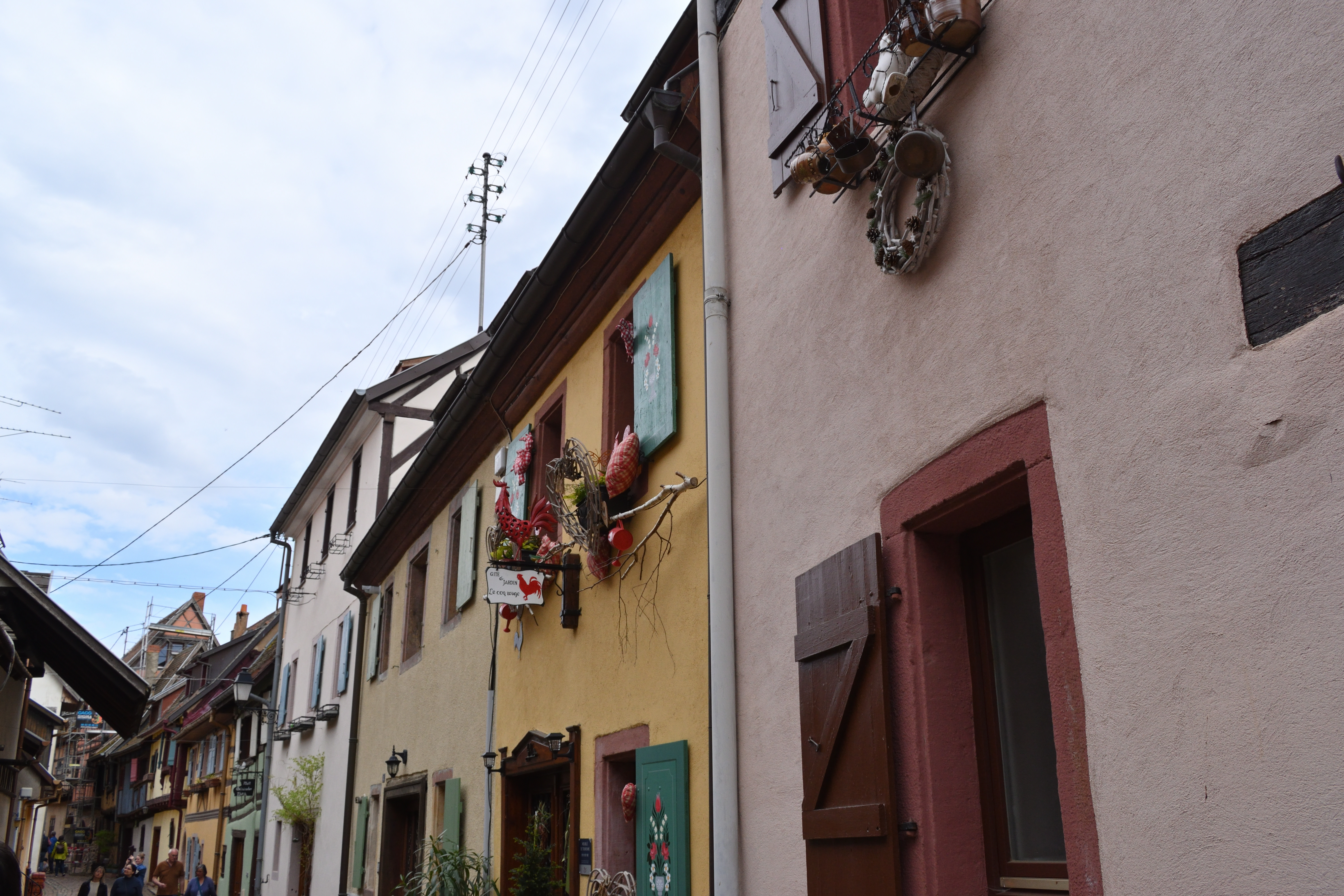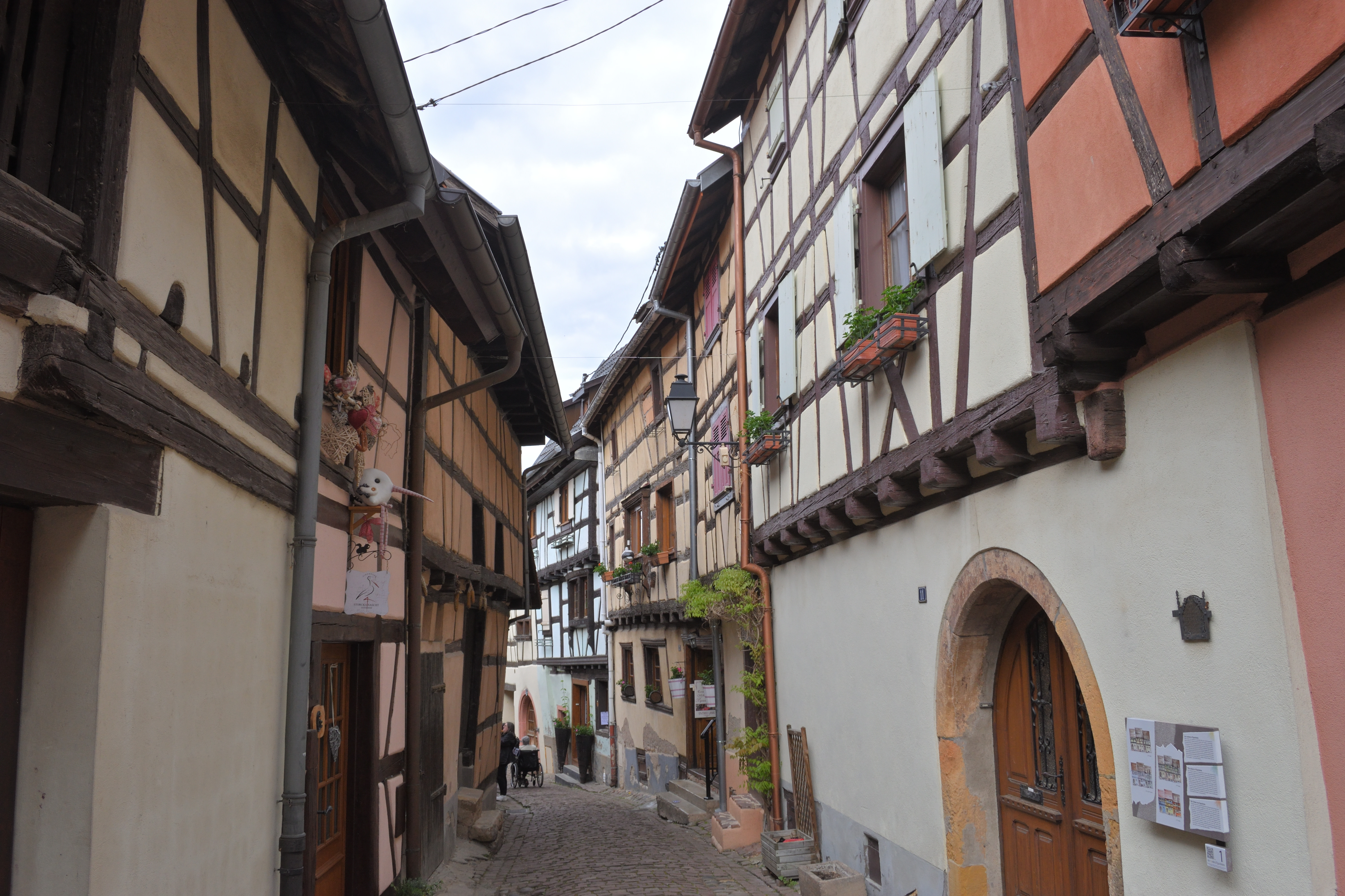 細い道の両側には色とりどりの木組みの家が建っており、とても可愛らしい雰囲気だ。 家の形や色はコルマールのポワソヌリ通りに並んでいる家と似ているが、こちらの方が少し古さを感じる。