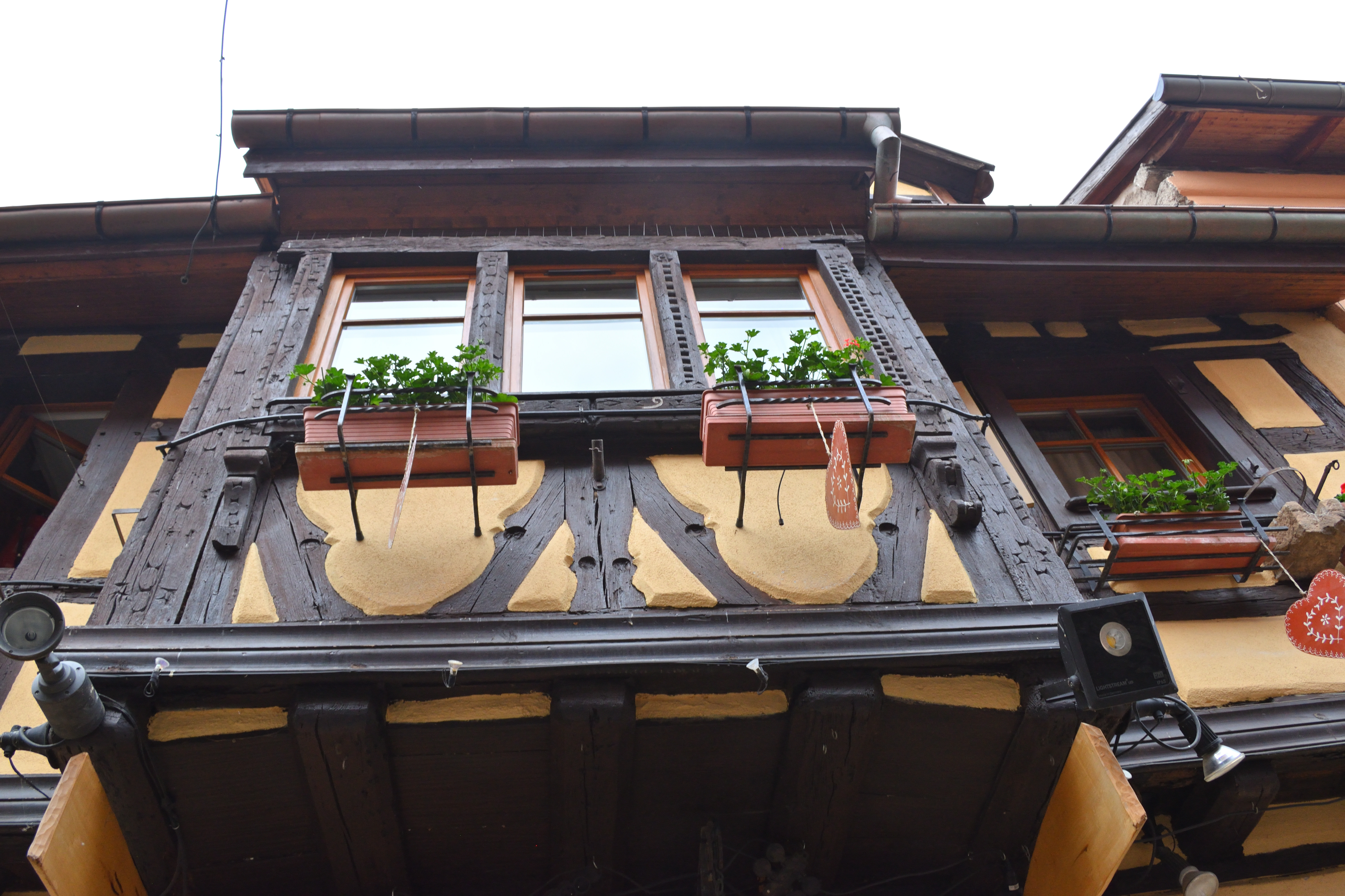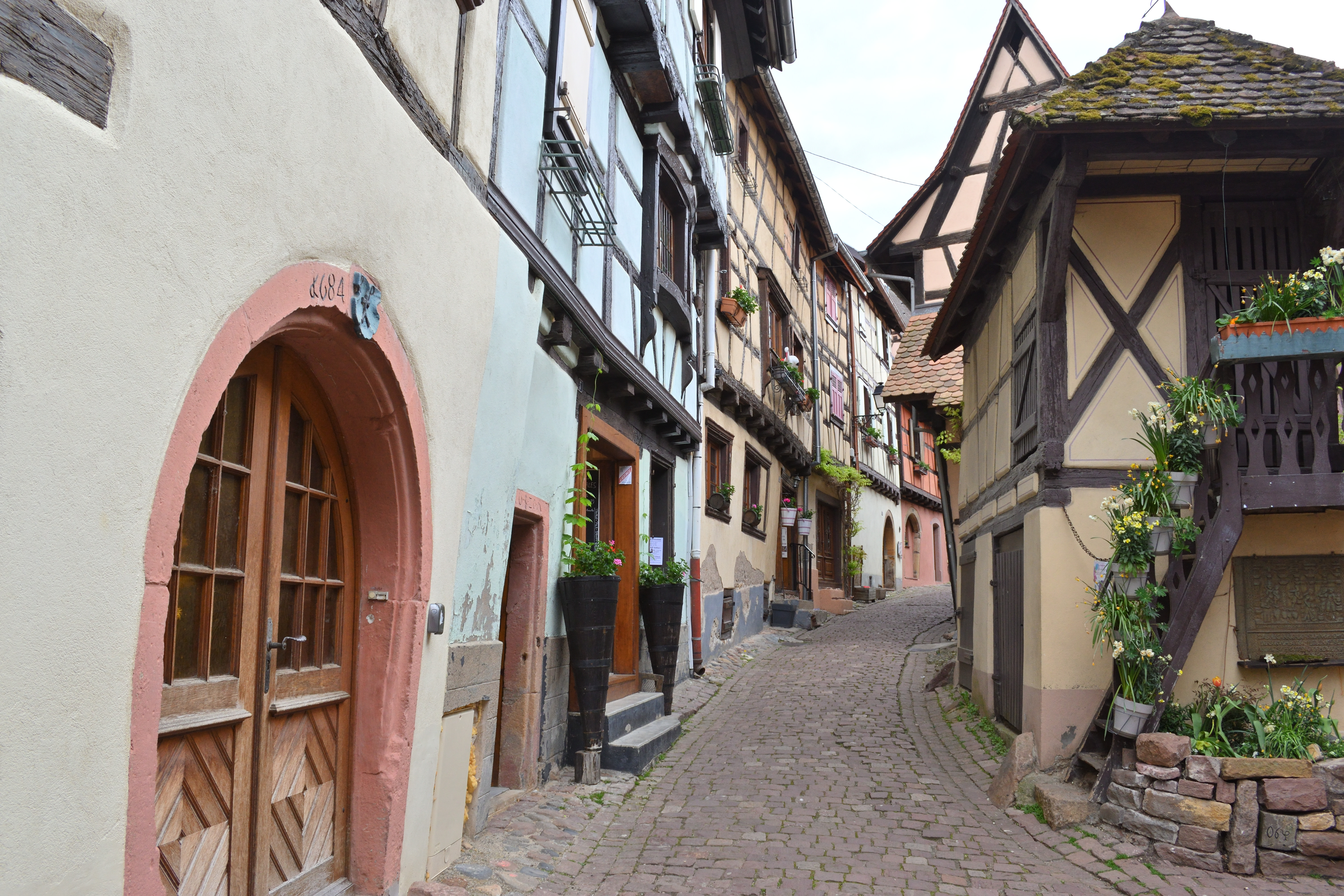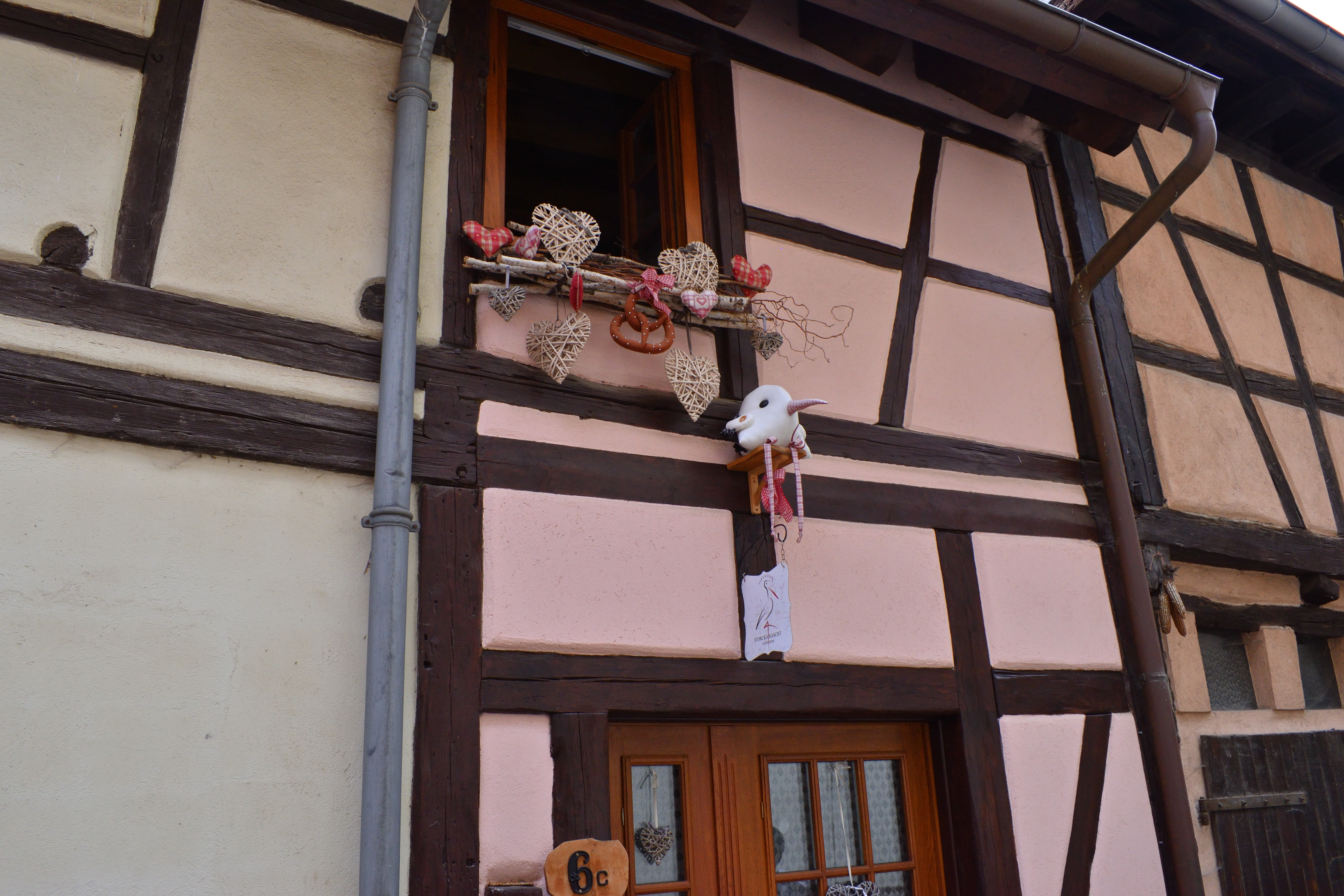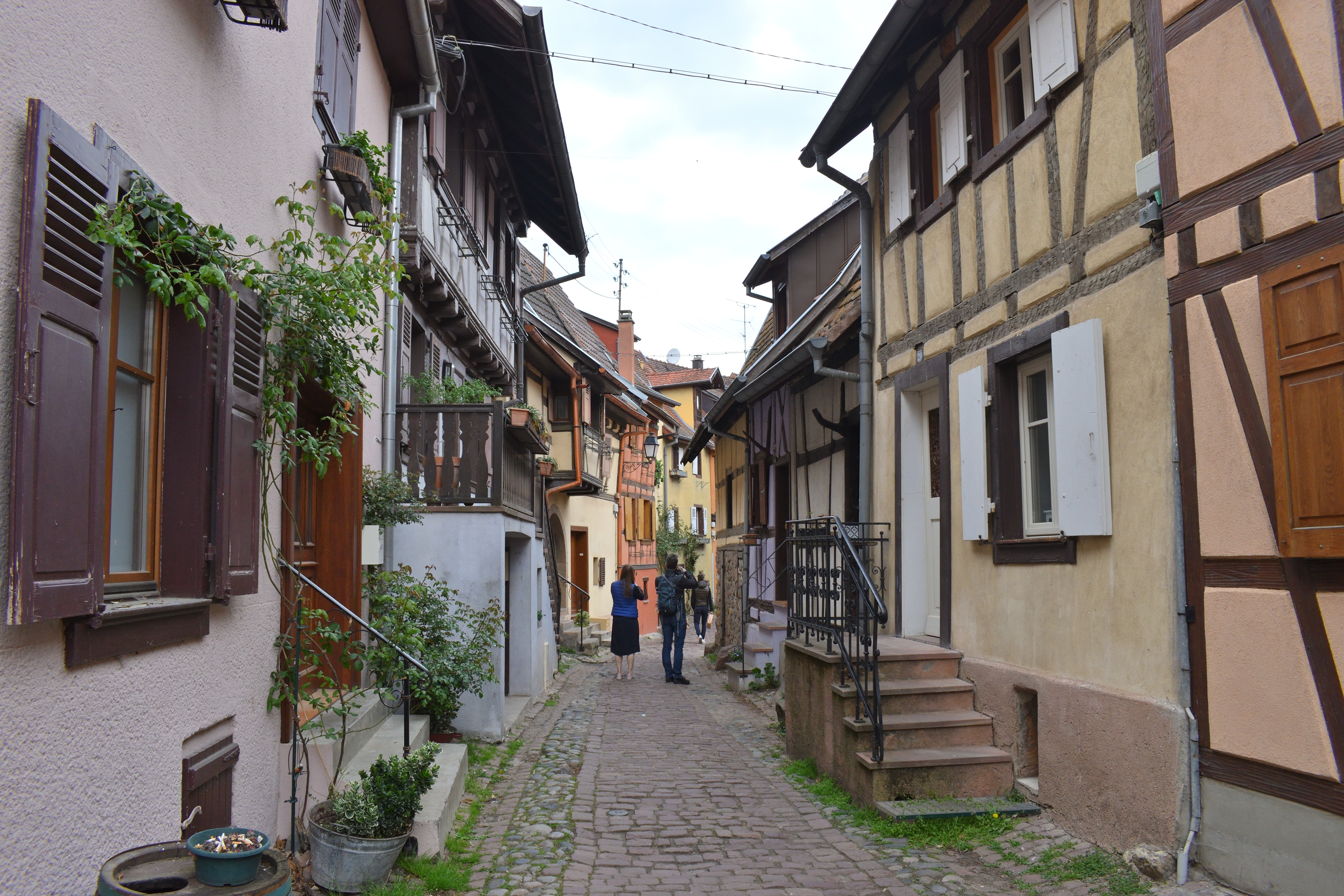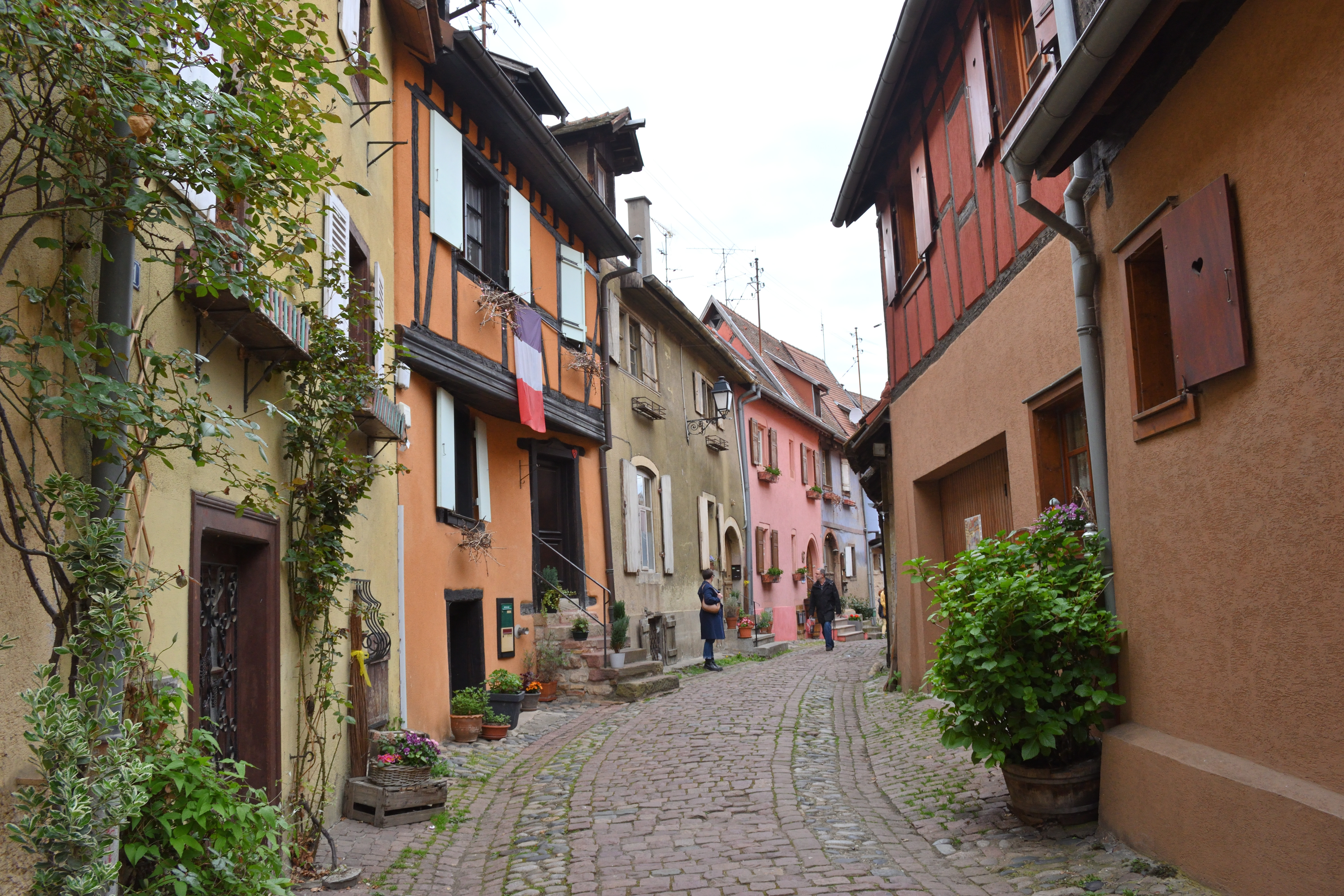細い道の両側には色とりどりの木組みの家が建っており、とても可愛らしい雰囲気だ。 家の形や色はコルマールのポワソヌリ通りに並んでいる家と似ているが、こちらの方が少し古さを感じる。