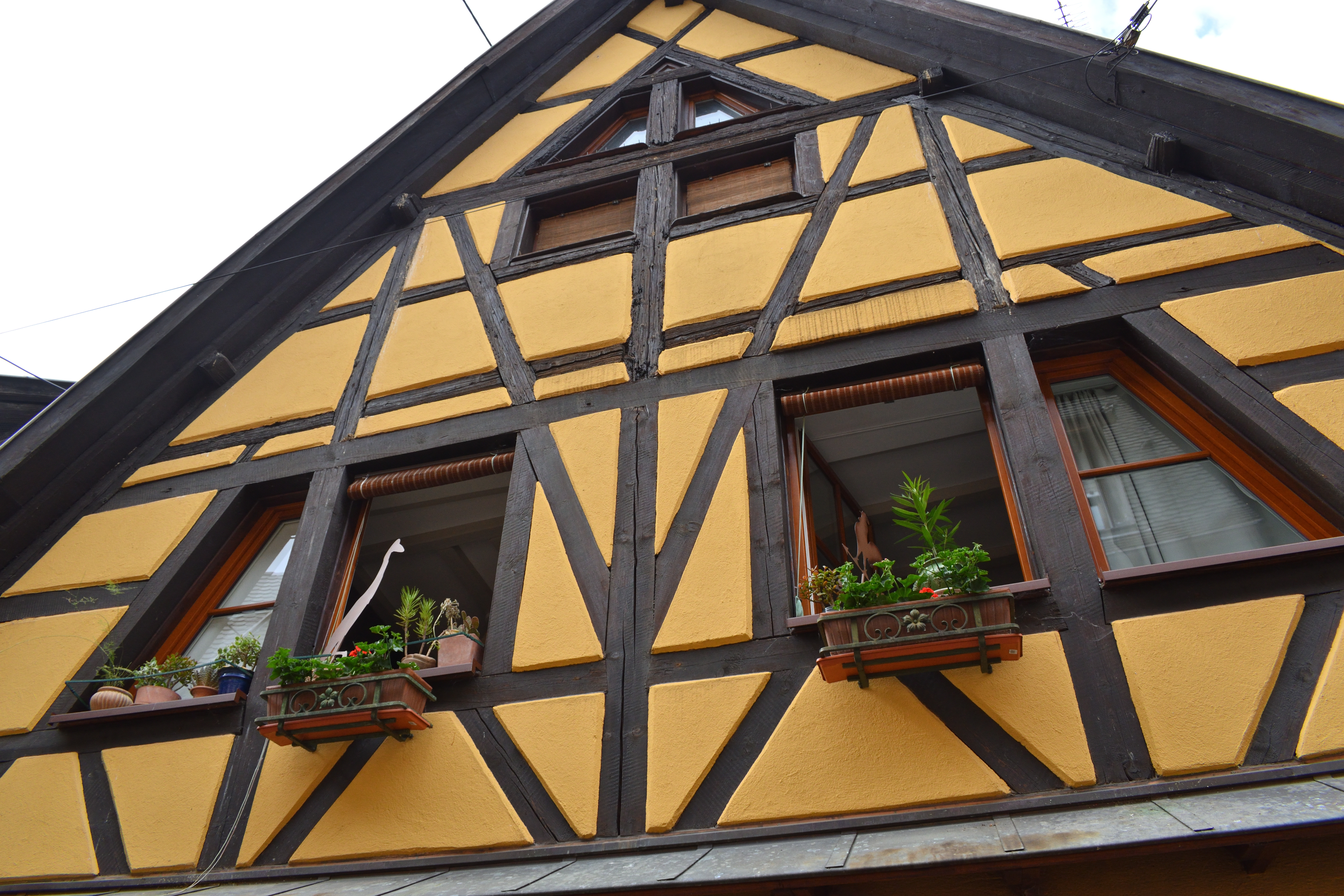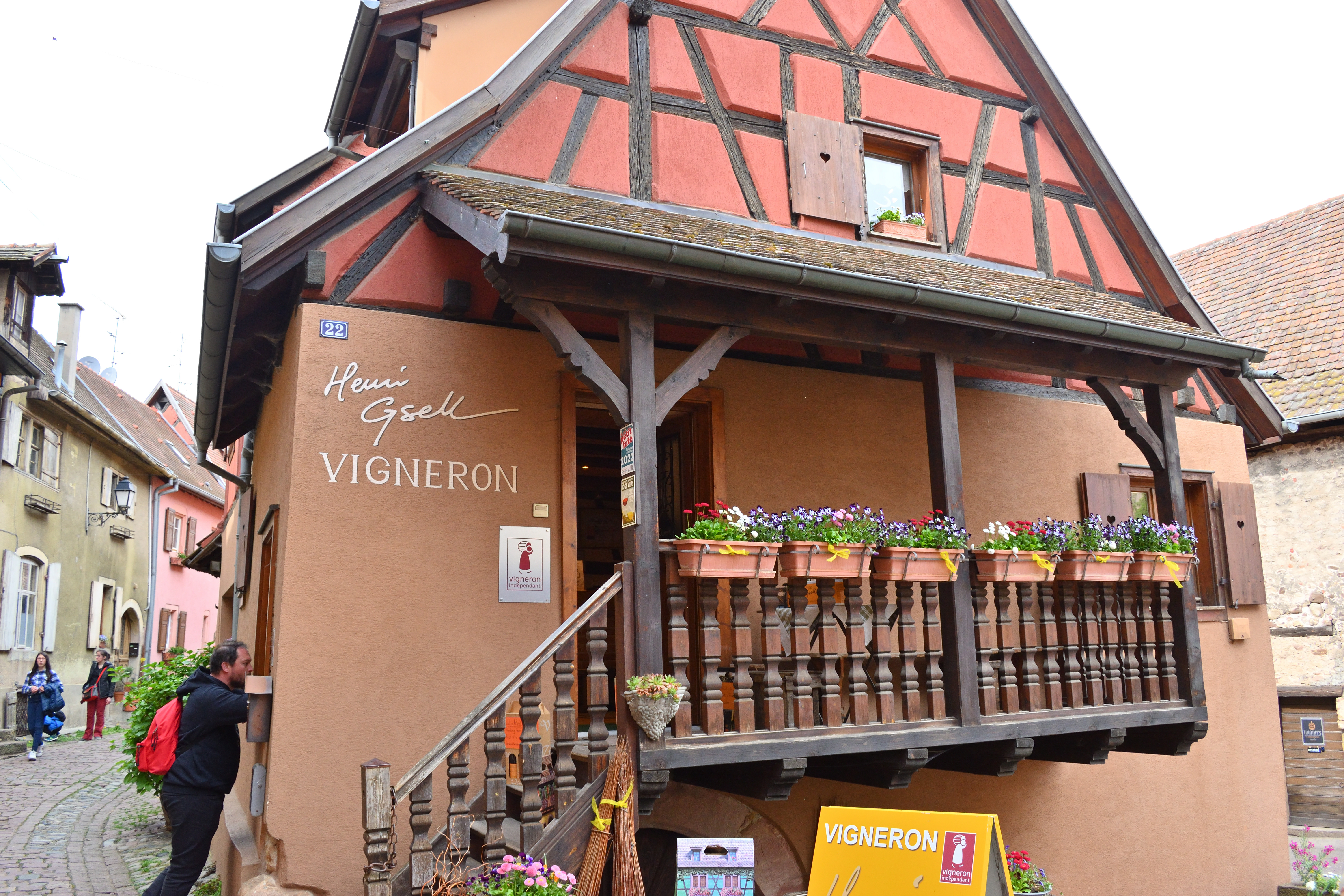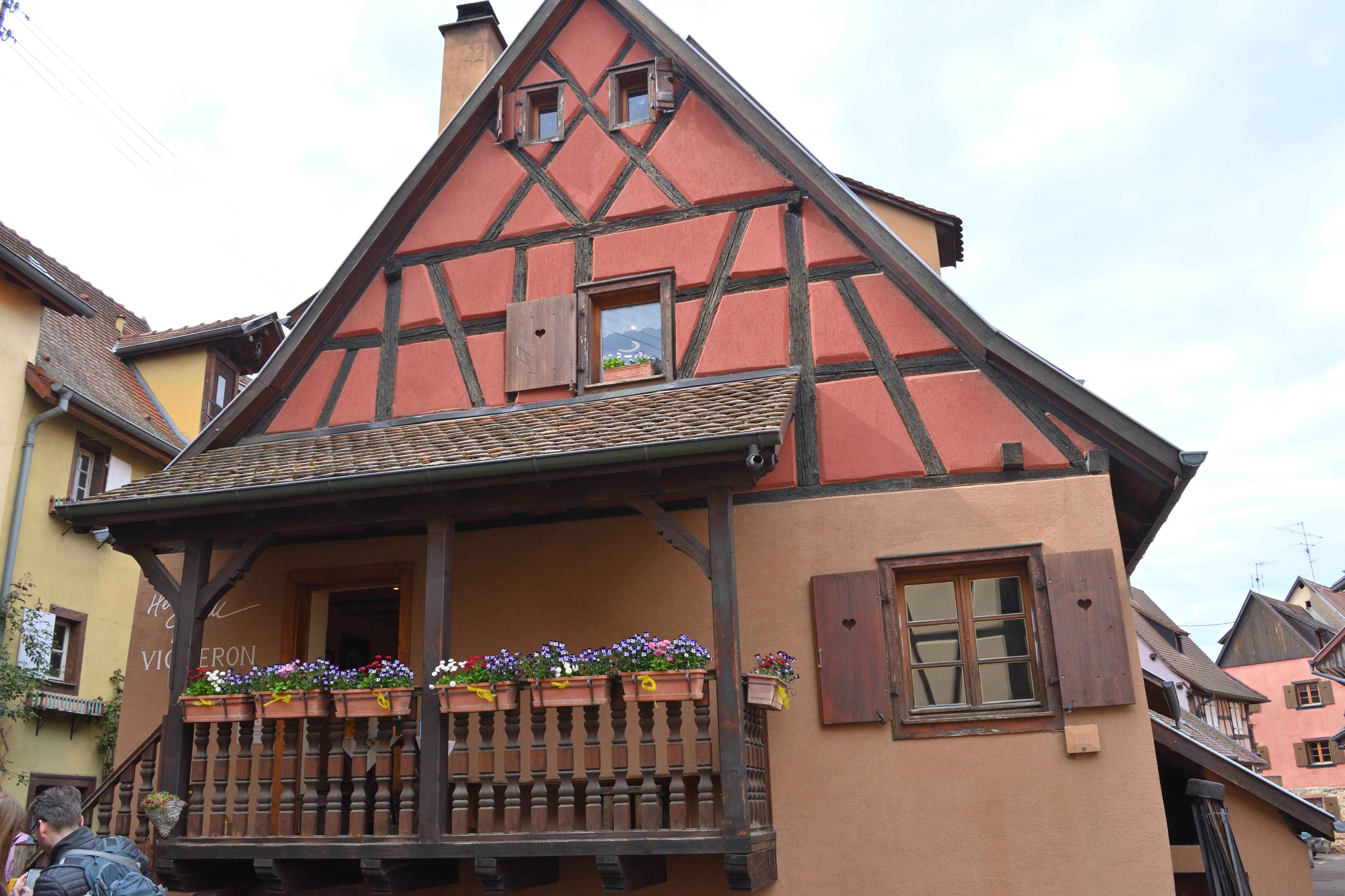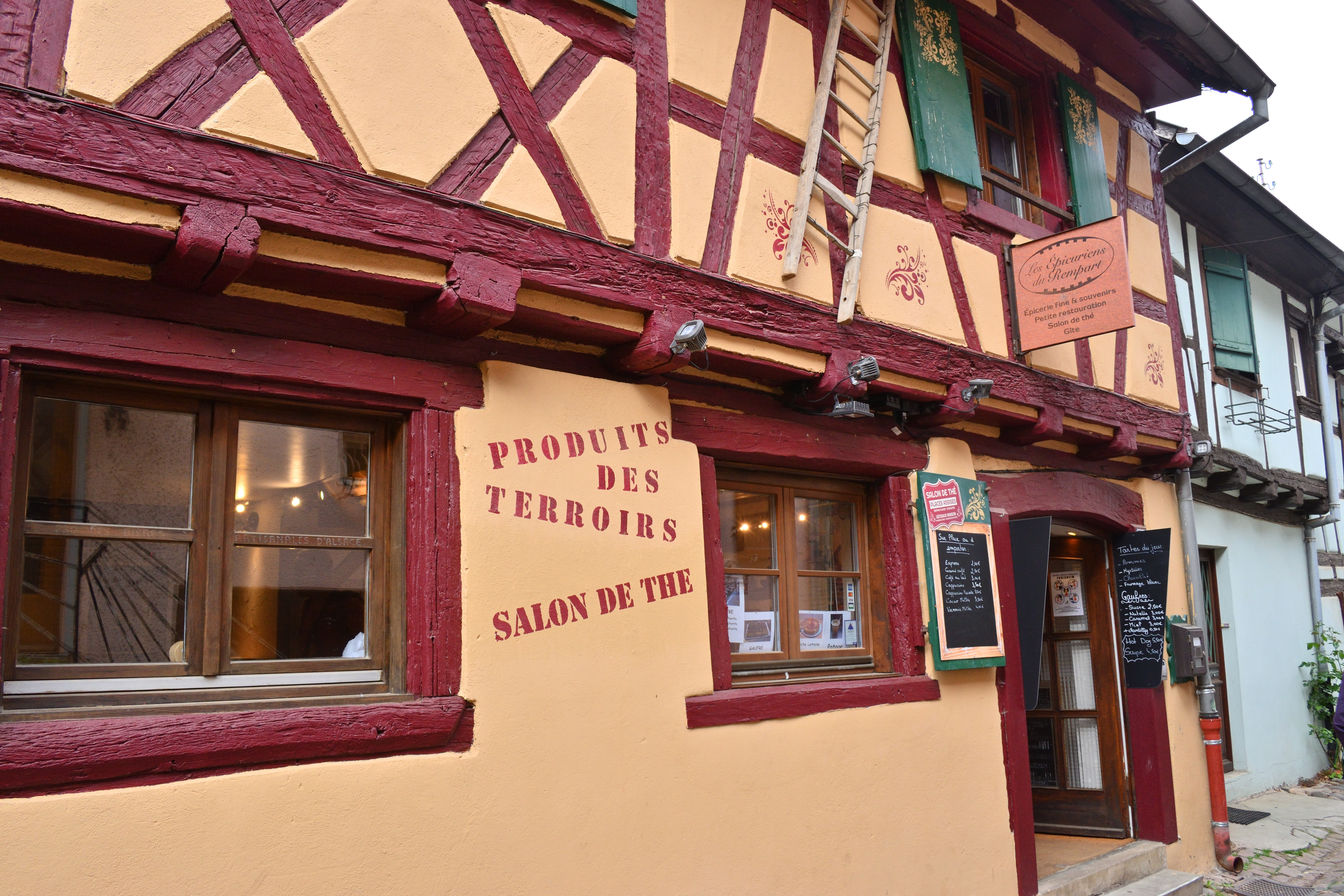 細い道の両側には色とりどりの木組みの家が建っており、とても可愛らしい雰囲気だ。 家の形や色はコルマールのポワソヌリ通りに並んでいる家と似ているが、こちらの方が少し古さを感じる。