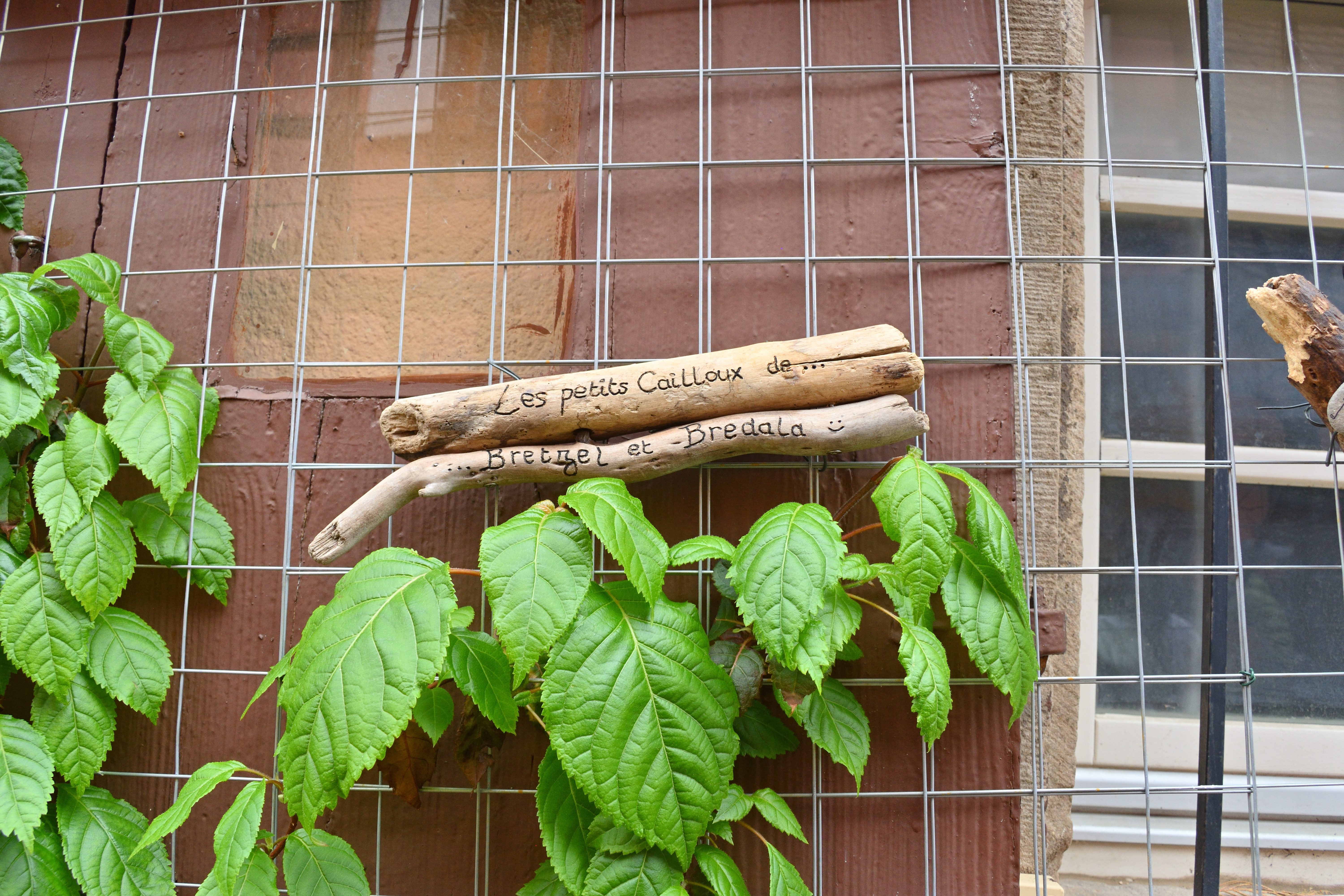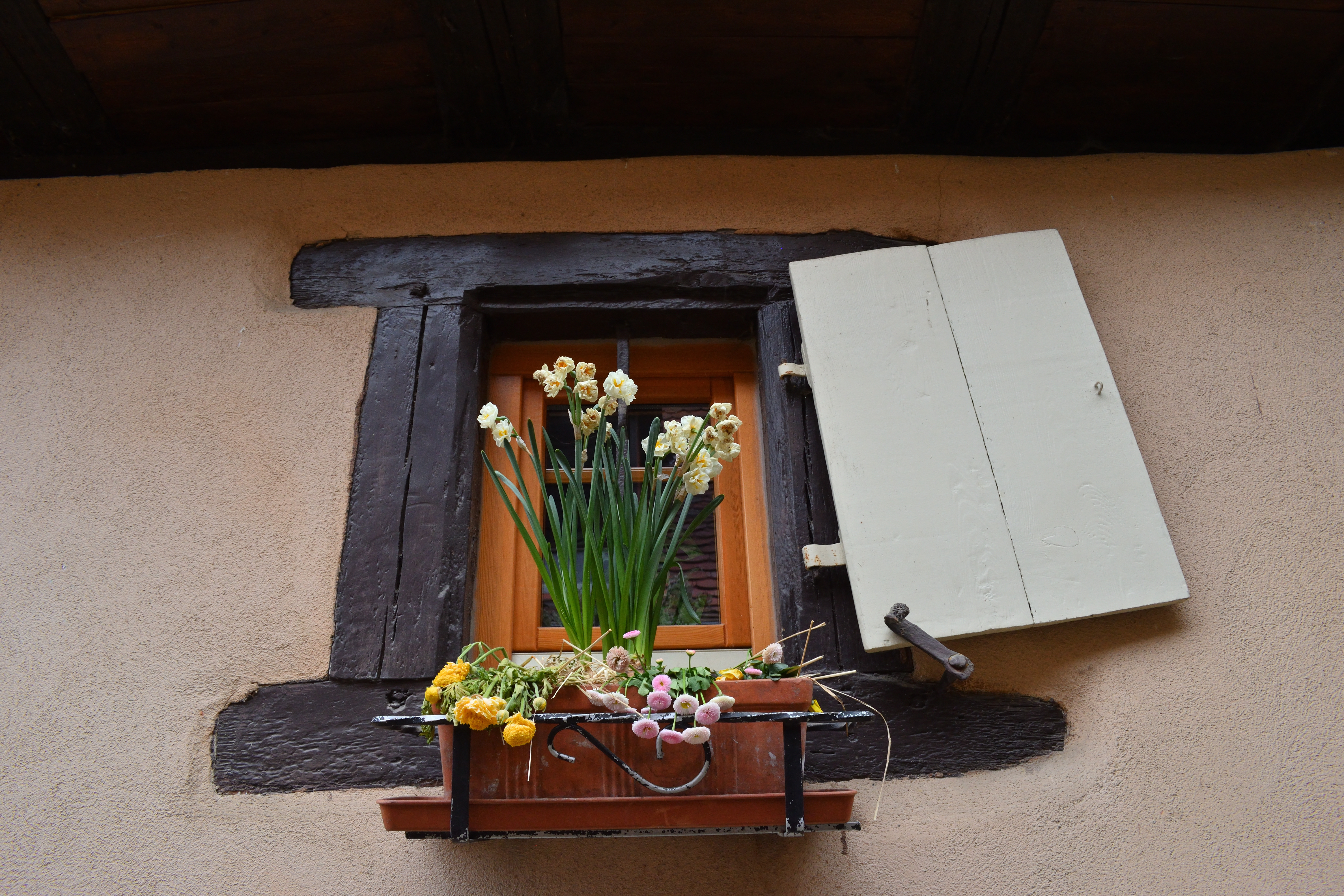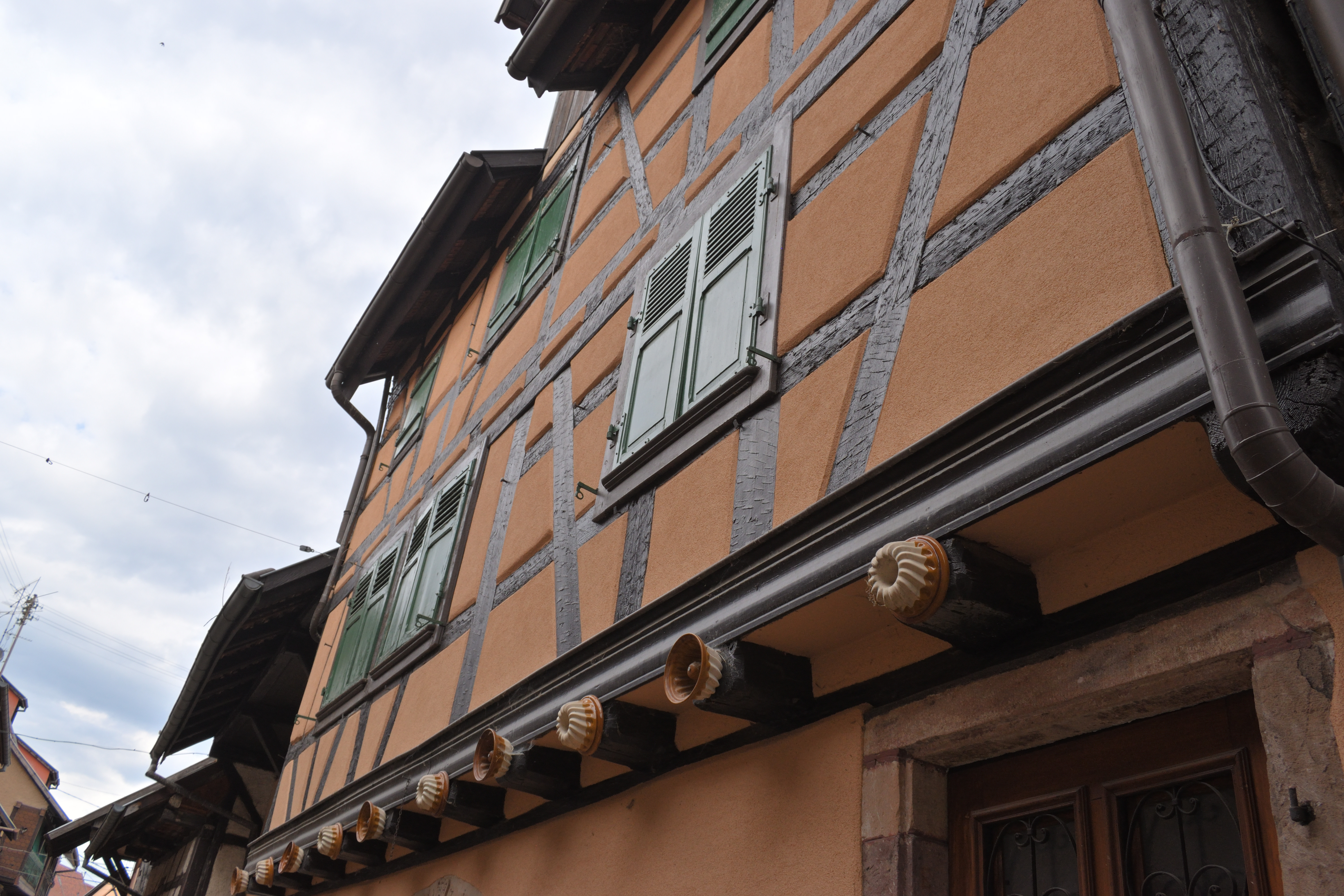 こちらの家の軒下に飾られている陶器の器は、アルザス地方でよく食べられている「クグロフ」(Kugelhopf) という焼き菓子の焼き型だ。 飾り方がユニークで面白い。