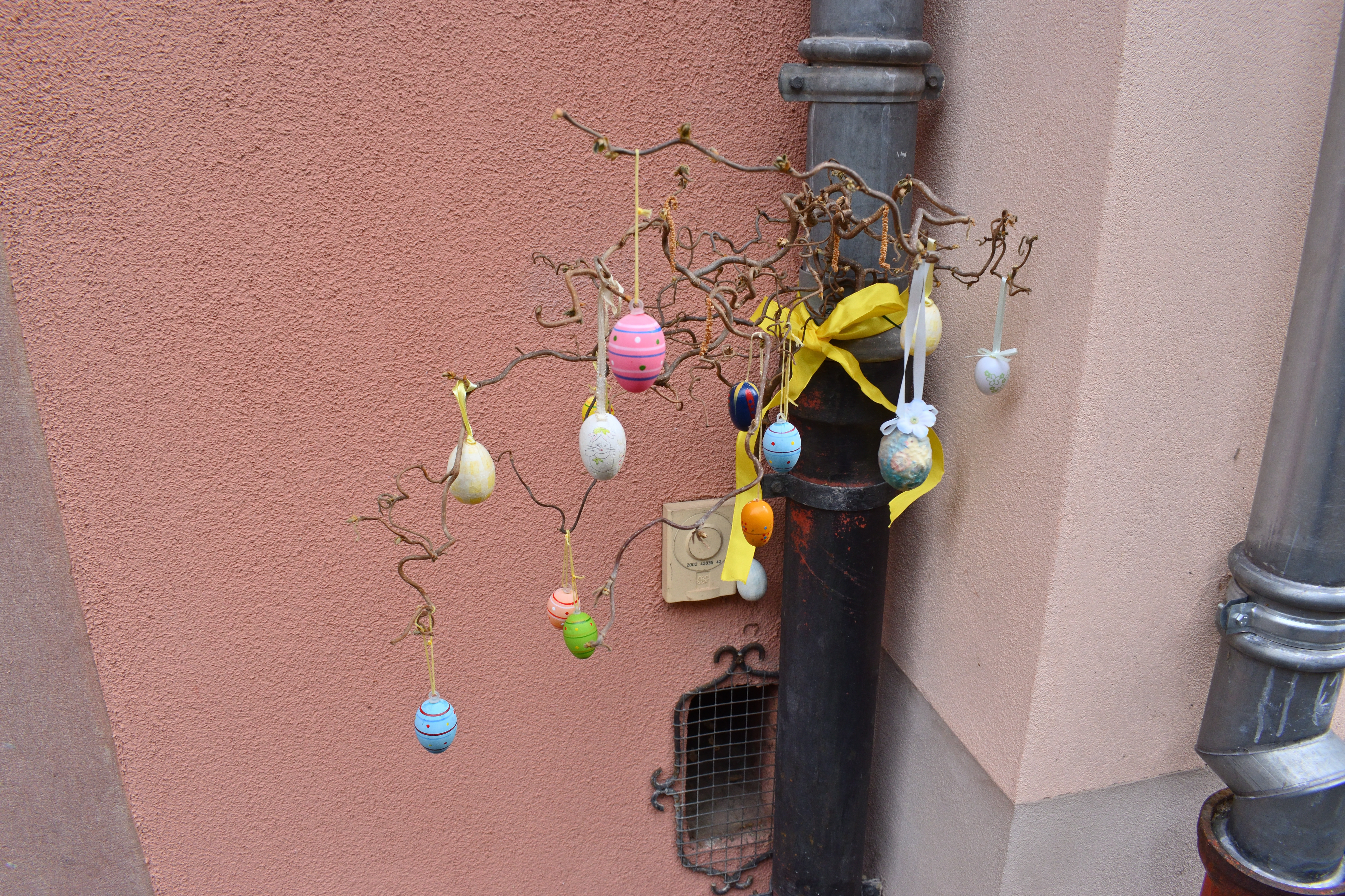 入り口の上にイースターエッグと蝶の飾り付けがある。 こんな可愛らしい飾り付けが見られるなんて、この時期に来て正解だ。
