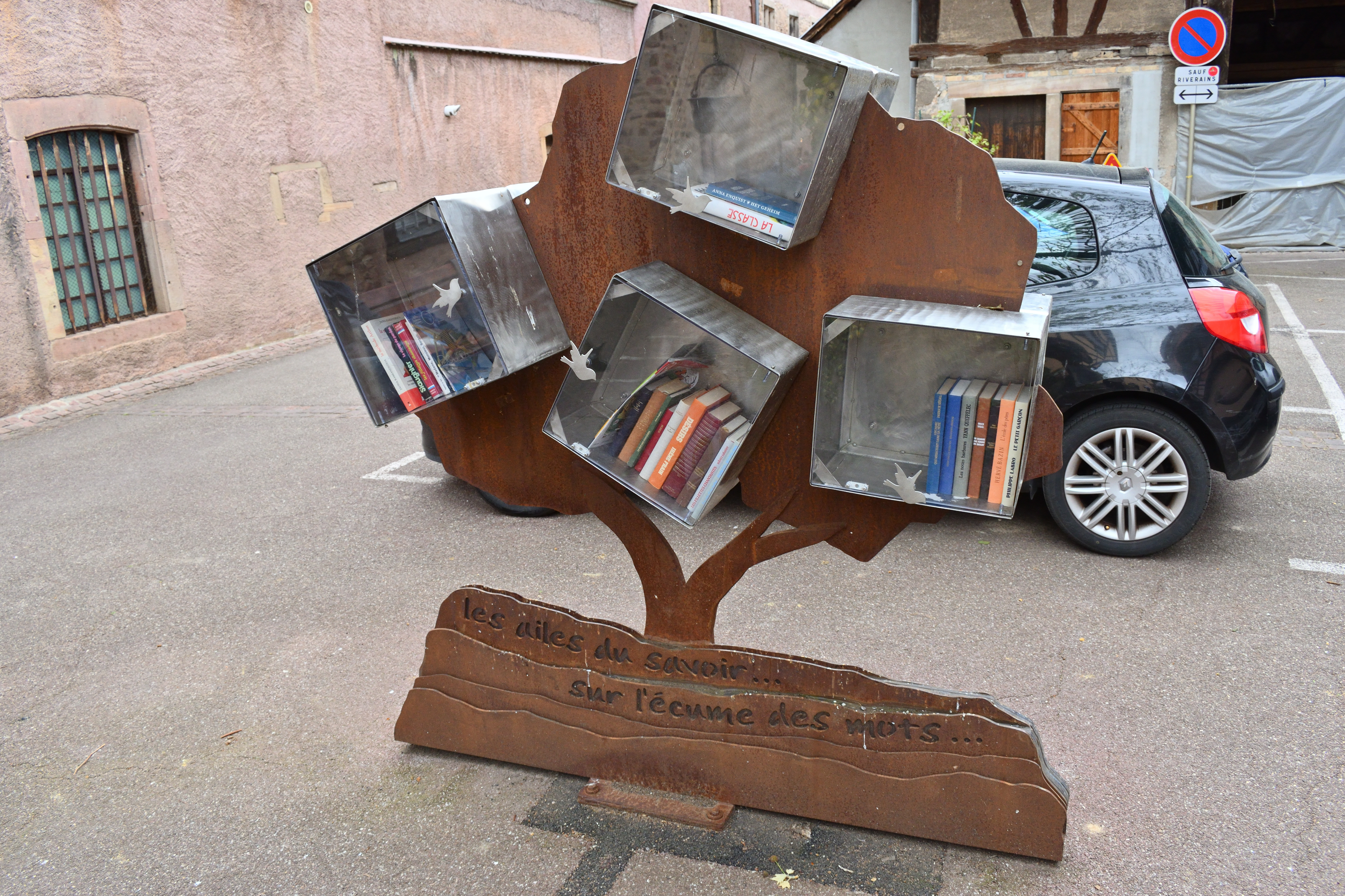 広場の横にはまた面白い形をした本棚があった。 エギスハイムの飾り付けは一つとして同じものがなく、どれもがユニークだ。