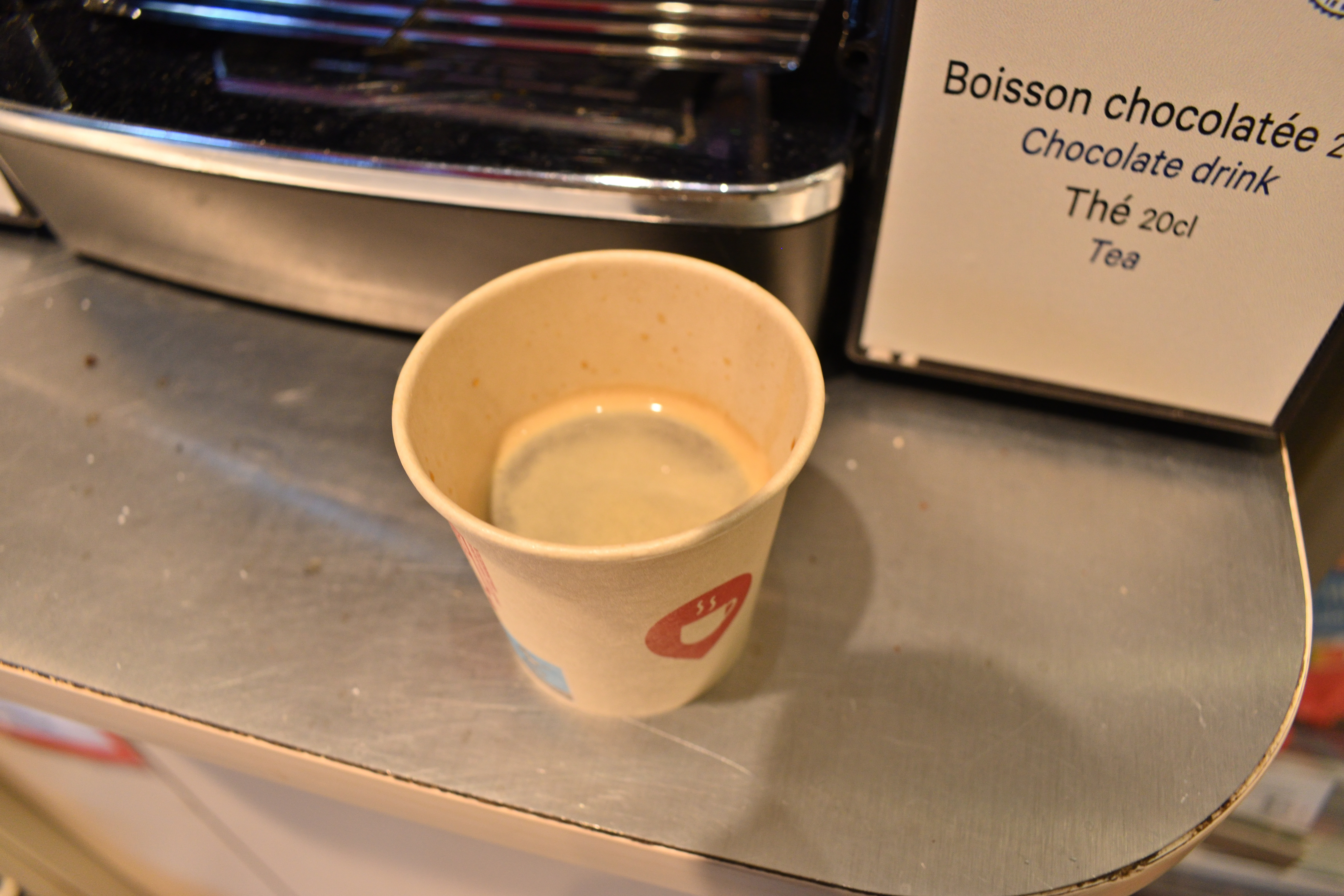 ここで仲間が一人で回りたいようだったので、別れて一人で行動することにした。 私はホールの中に入っていた “Relay” というコンビニに入って何か買うことにした。 コンビニの中を見てみるとフランスでもコーヒーを売っているようで、日本では見かけないエスプレッソが売っていたので、試しに買ってみることにした。 レジでエスプレッソをくださいと言うと、とても小さいカップを渡された。 自分でコンビニの入り口付近あるコーヒーマシンのボタンを押してコーヒーを注ぐのは日本のコンビニと同じ方式だ。