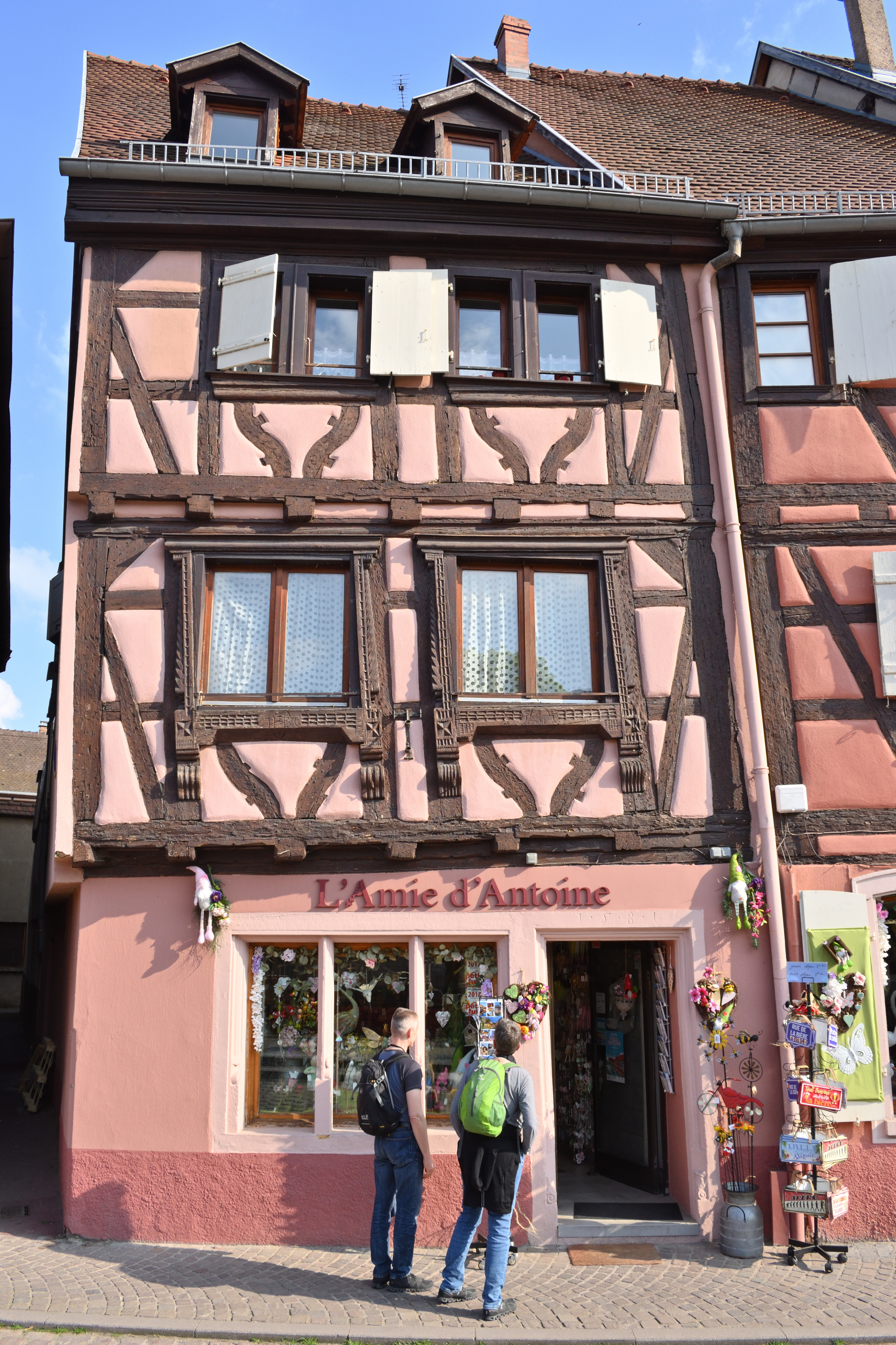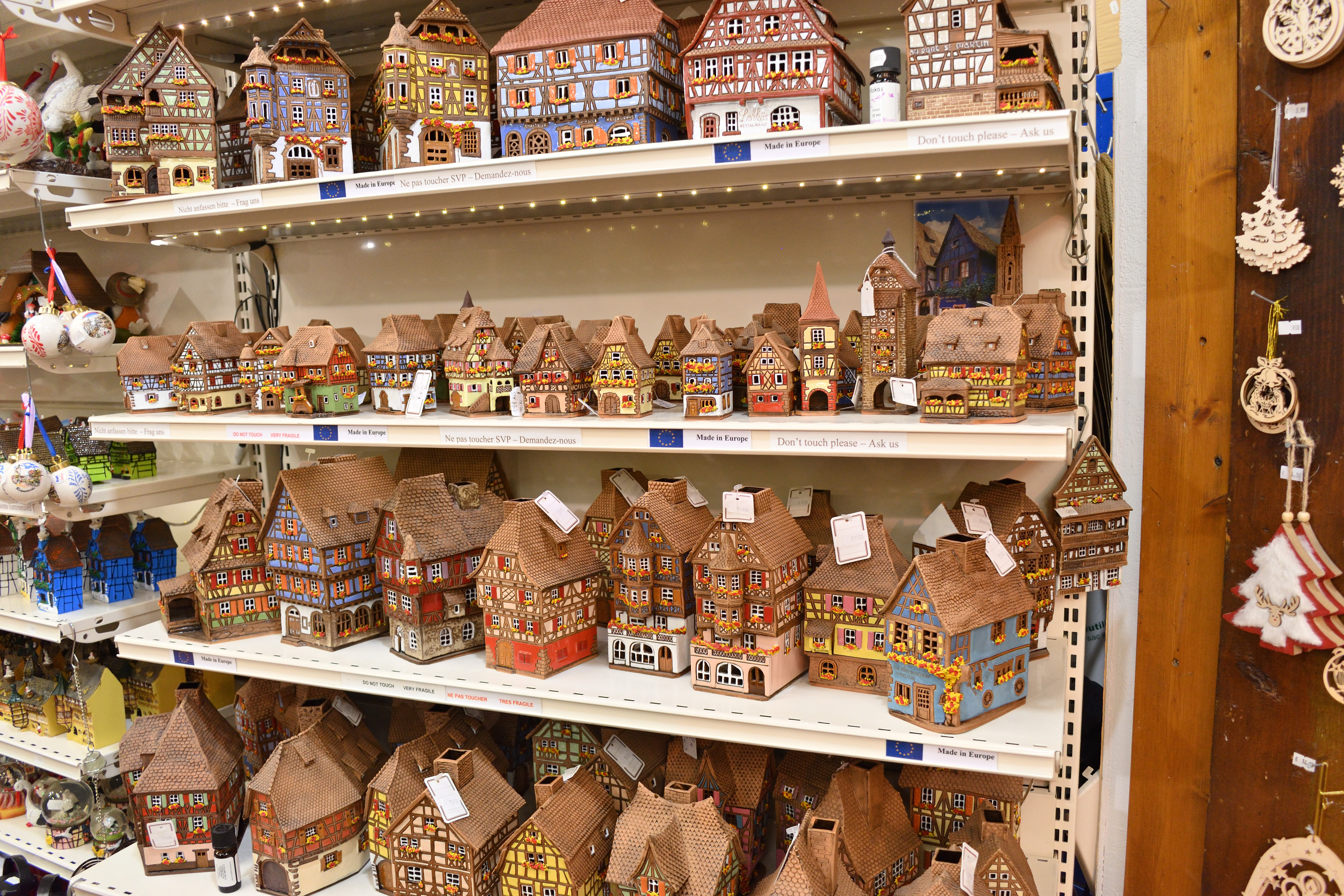 すぐ近くにはお土産屋さんがあったので入ってみると、木組みの家のミニチュアがたくさん並んでいた。 全部買えばリクヴィールの村を再現できそうだ。