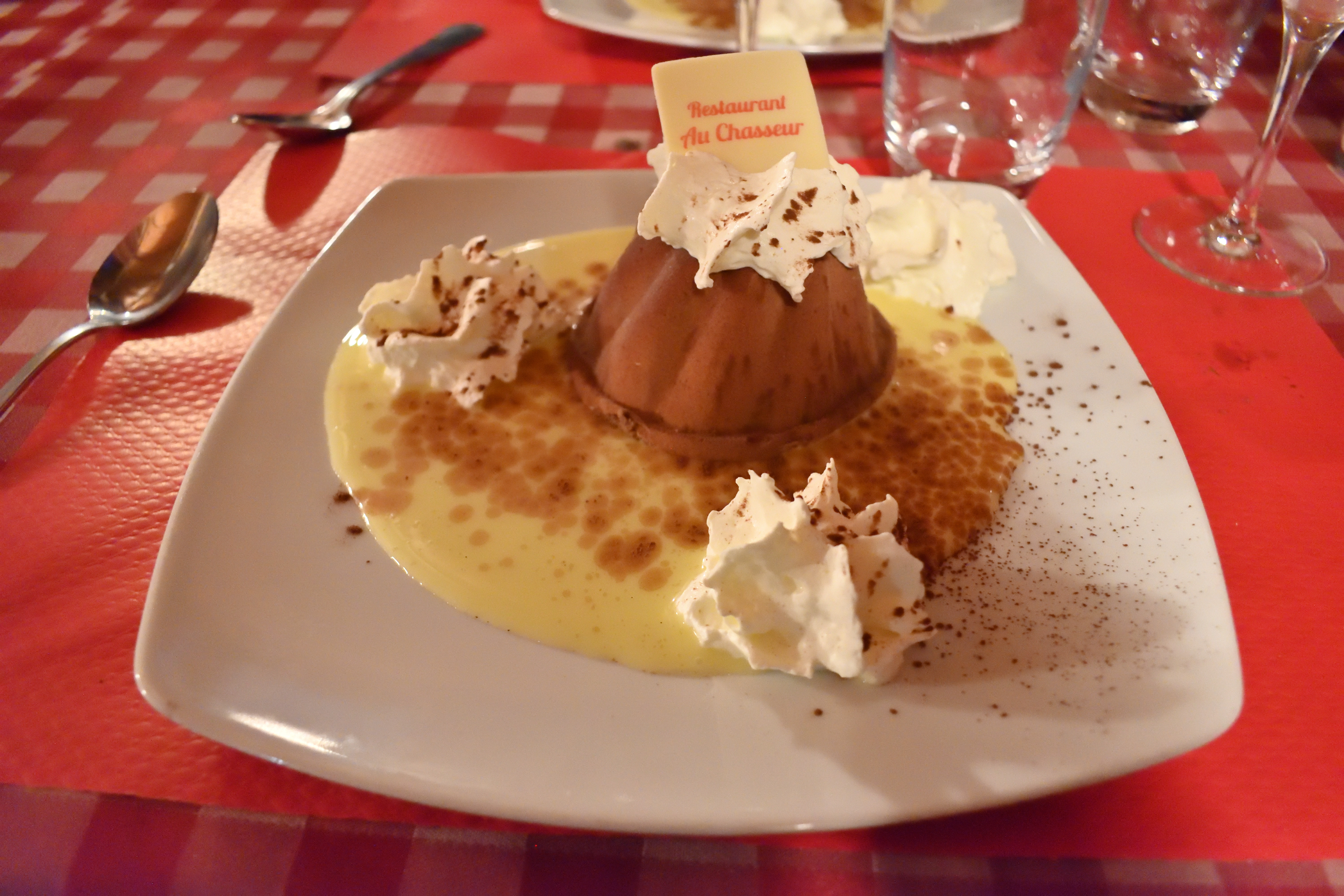 最後にデザートのアイス・クグロフが出てきた。 私たちは普通のクグロフにアイスが添えられているものを想像していたのだが、出されたものは周りにココアパウダーがまぶしてあり、クグロフの具材であるドライフルーツが使われたバニラアイスだった。 アイスの上にはレストランの名前が記されたホワイトチョコレートが乗せられていた。 おそらくこのレストランのオリジナルメニューなのだろう。 クグロフで使われるドライフルーツの味がアクセントになり、非常に美味しかった。
