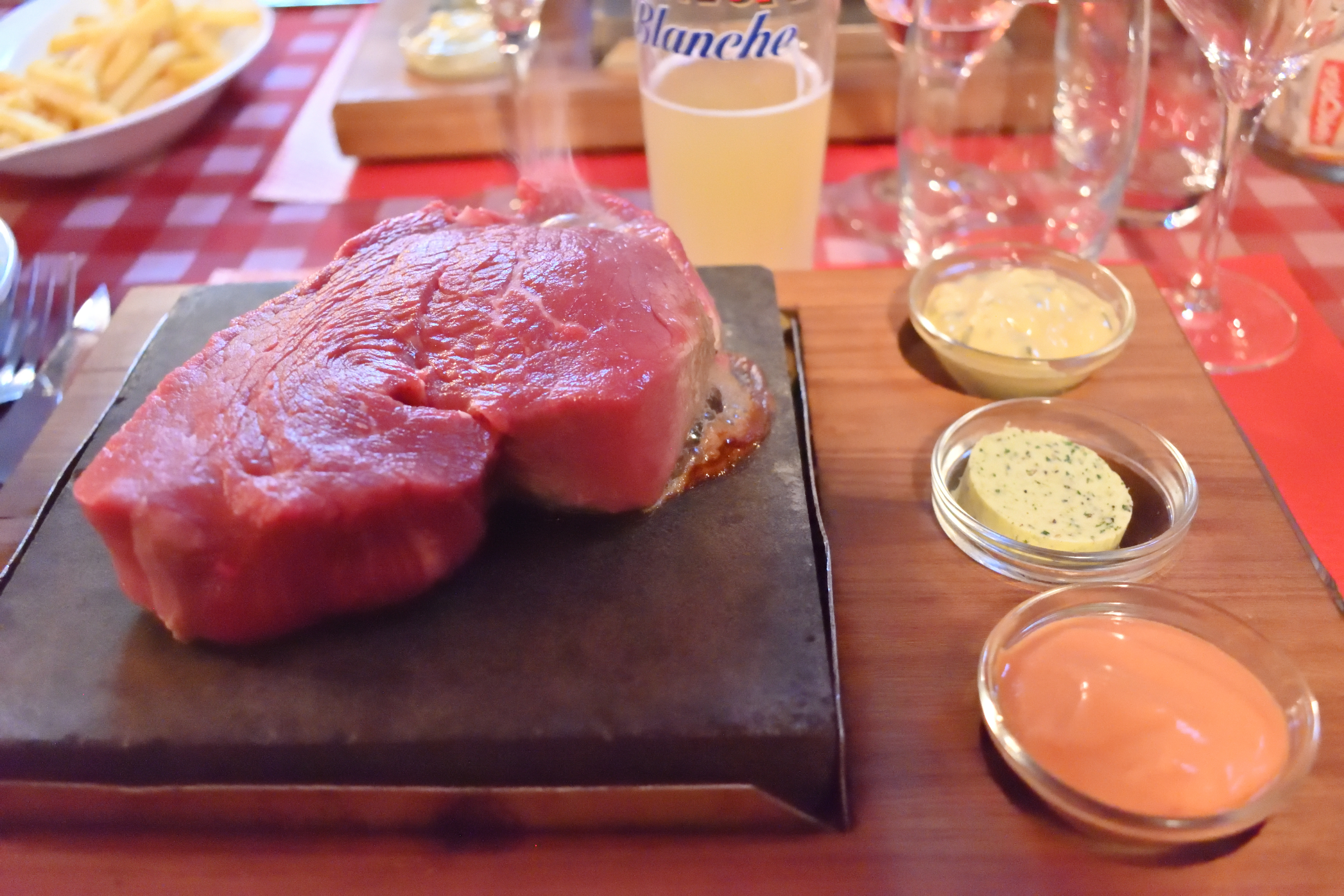 いよいよ肉が出てくる番になると、店員の若いマダムが全員に布のエプロンをかけてくれた。 紙エプロンではなく布のエプロンをかけてくれる豪華な対応に、私は感激した。 またこのマダムが非常に愛想が良く、エプロンをかけてくれたことにお礼を言うと、”Service!” と大きな声で返してくれた。 なんというか、役者かと思うくらい声にサービス精神を乗せてくれるのだ。
