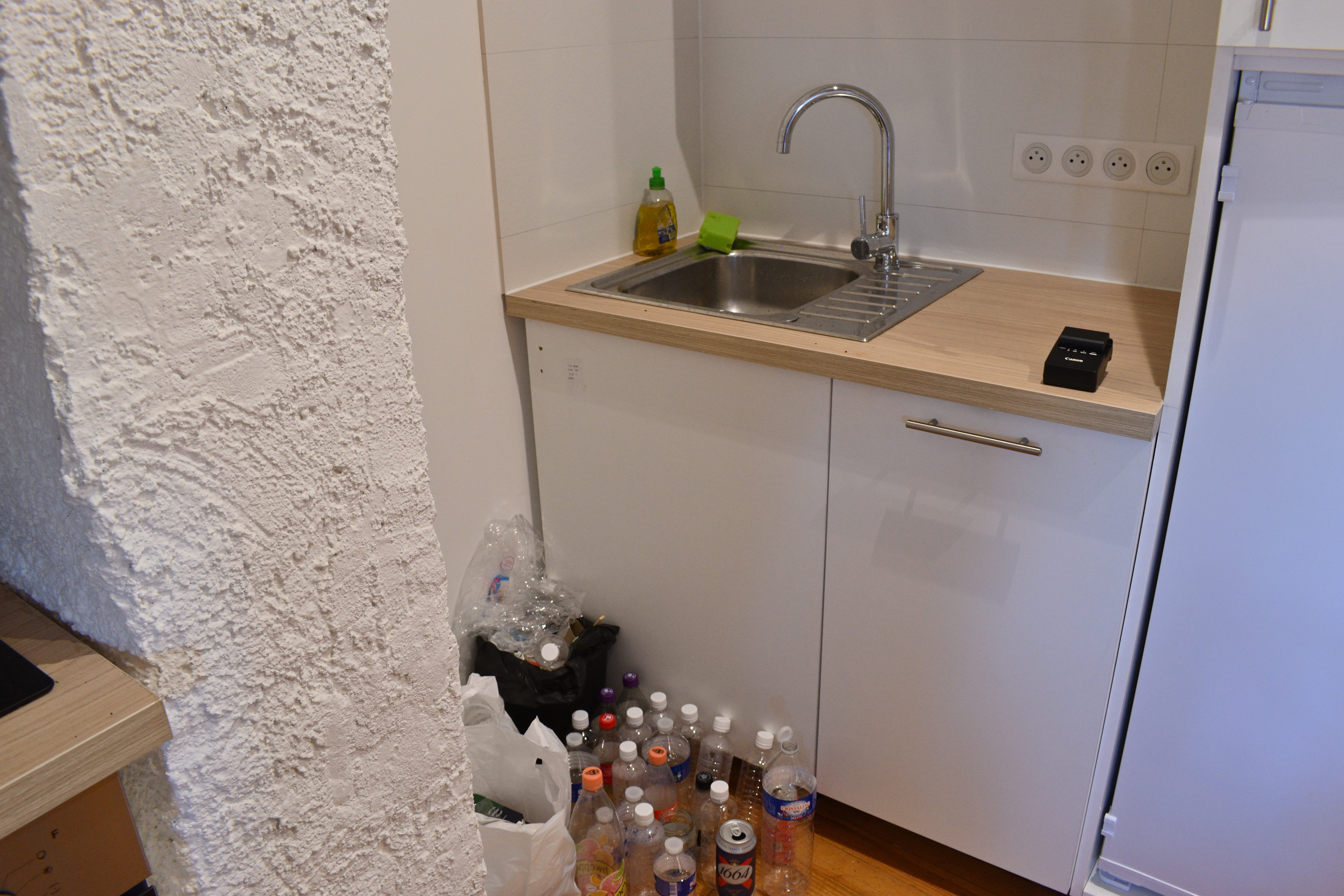 自炊で使った調理器具は元の場所に戻し、ゴミは部屋の隅にまとめておく。