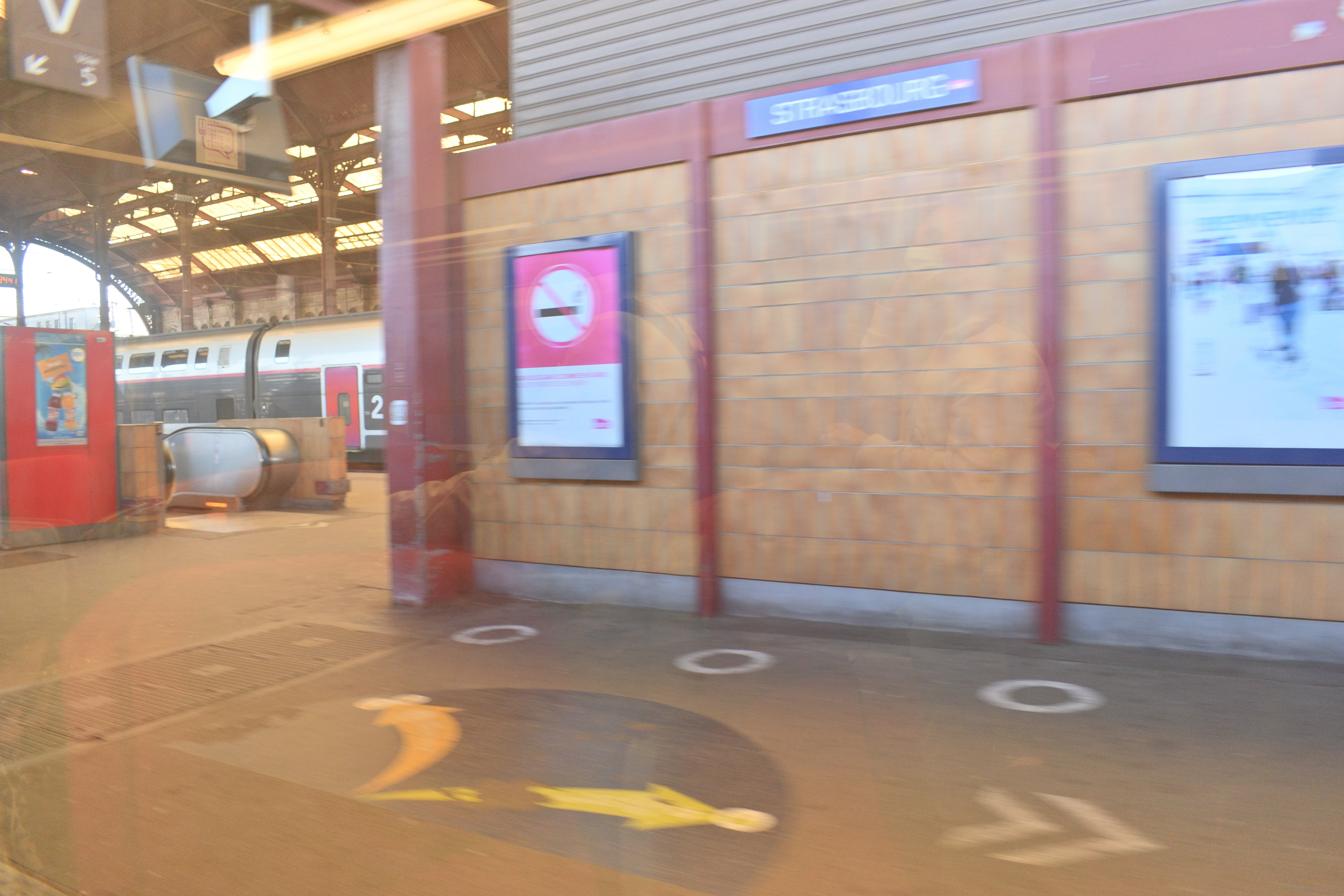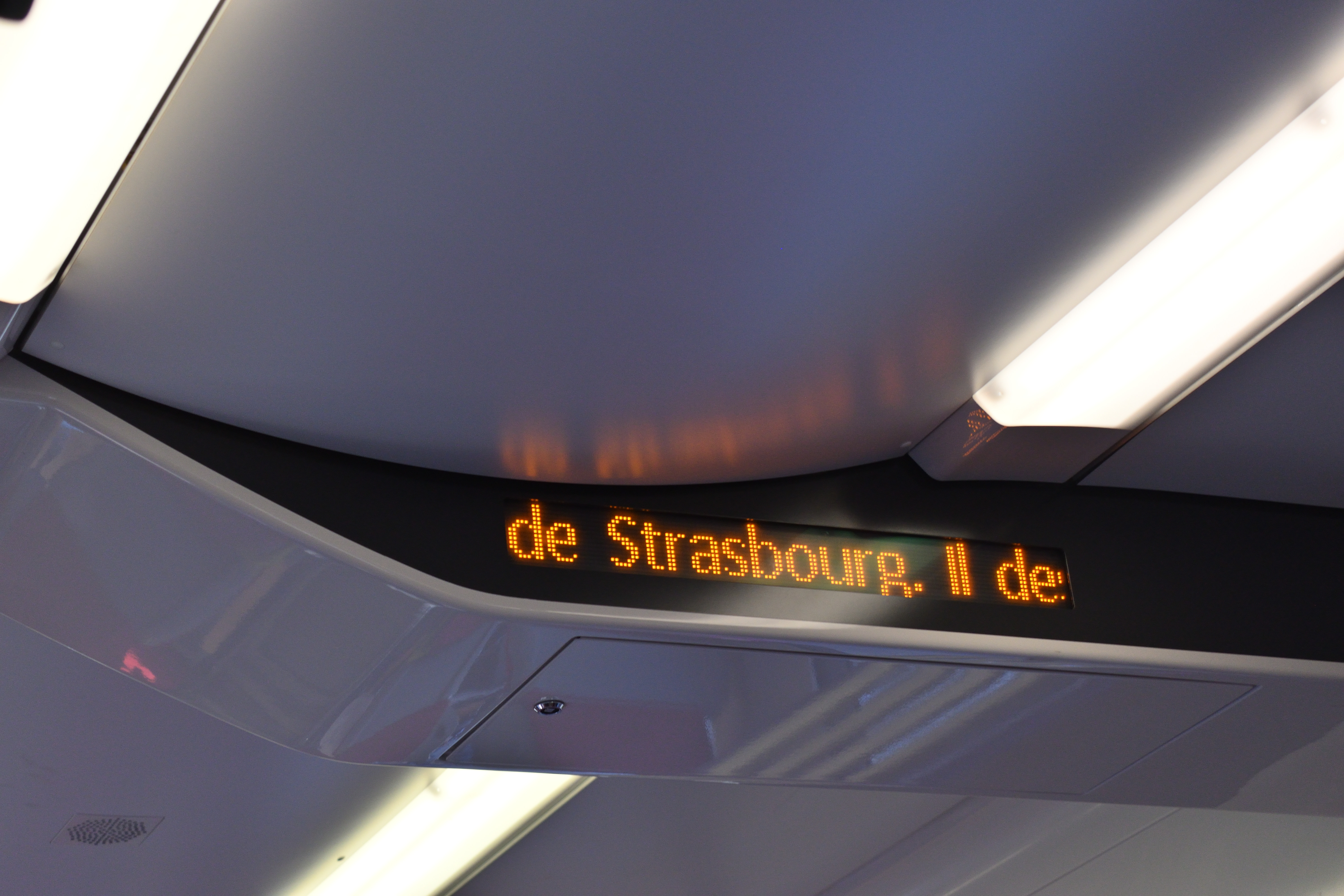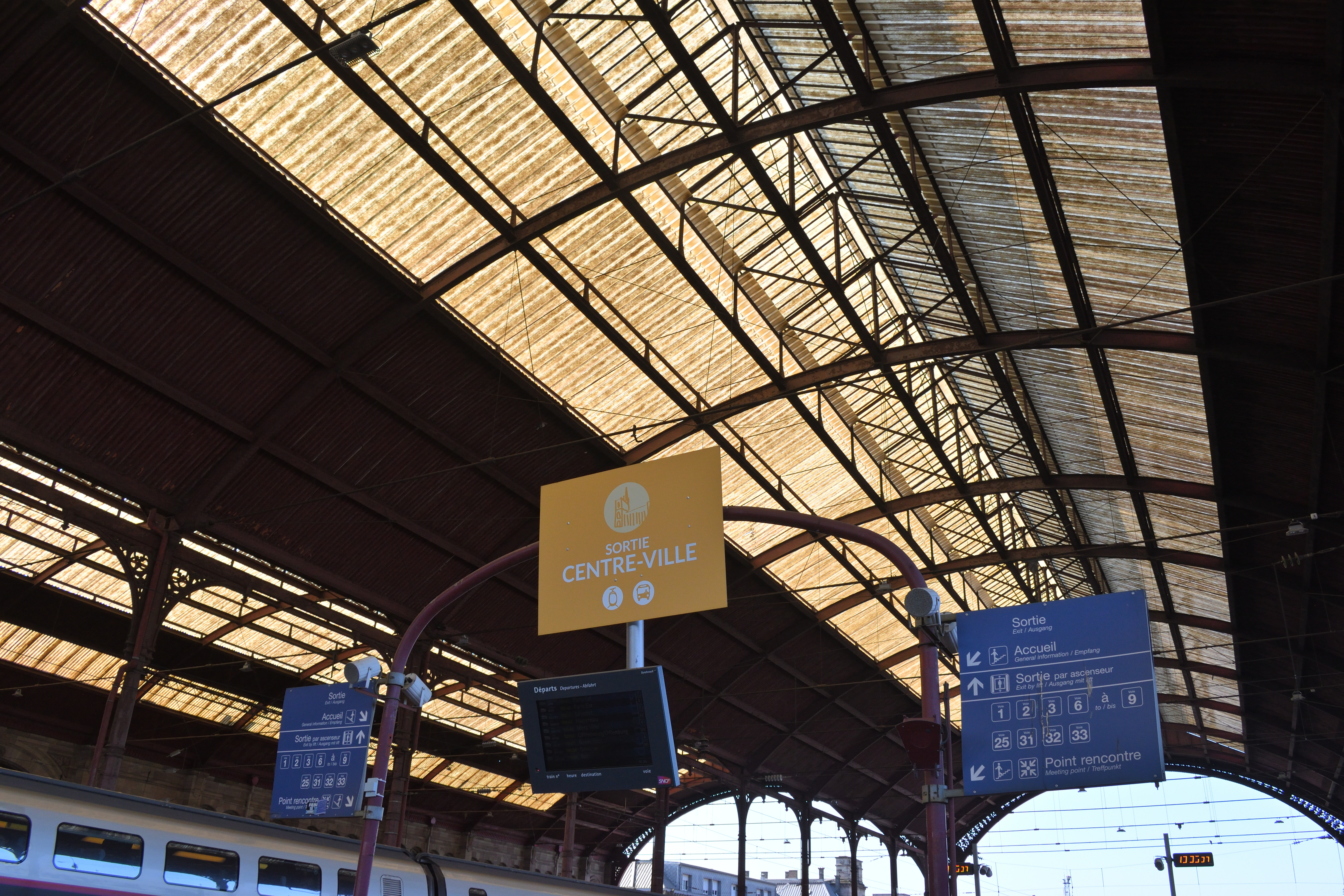 駅のホールのホーム側には液晶パネルがあり、列車の時刻が表示されていた。 いくつかストラスブール行きの列車が表示されている。 またパリ東駅行きの列車はTGVで、日本でいう新幹線にあたる列車だが、同じ時刻表に表示されていた。 日本では新幹線はホームも在来線と完全に別仕様だが、フランスでは在来線とつながったホームから発着している。