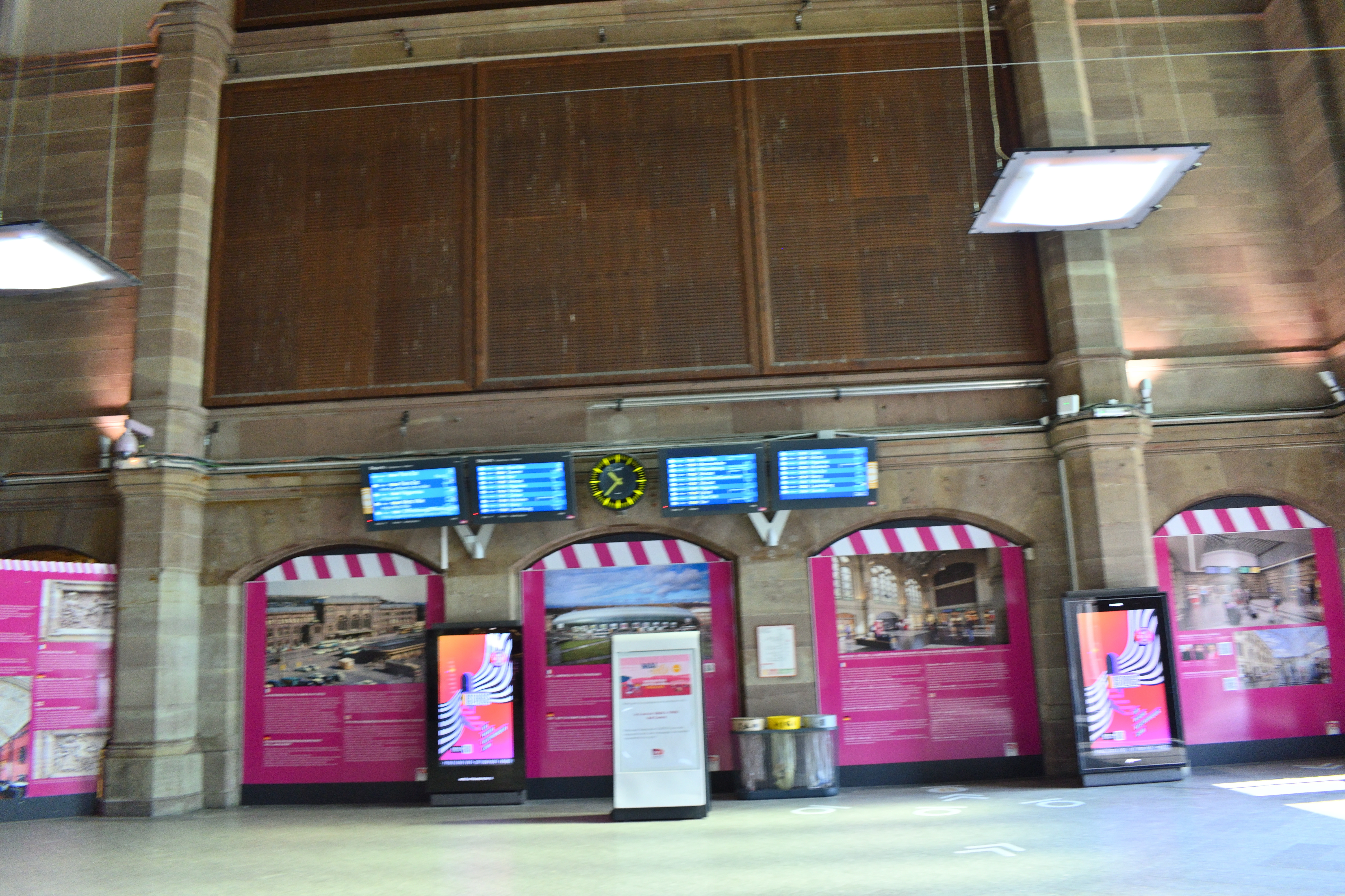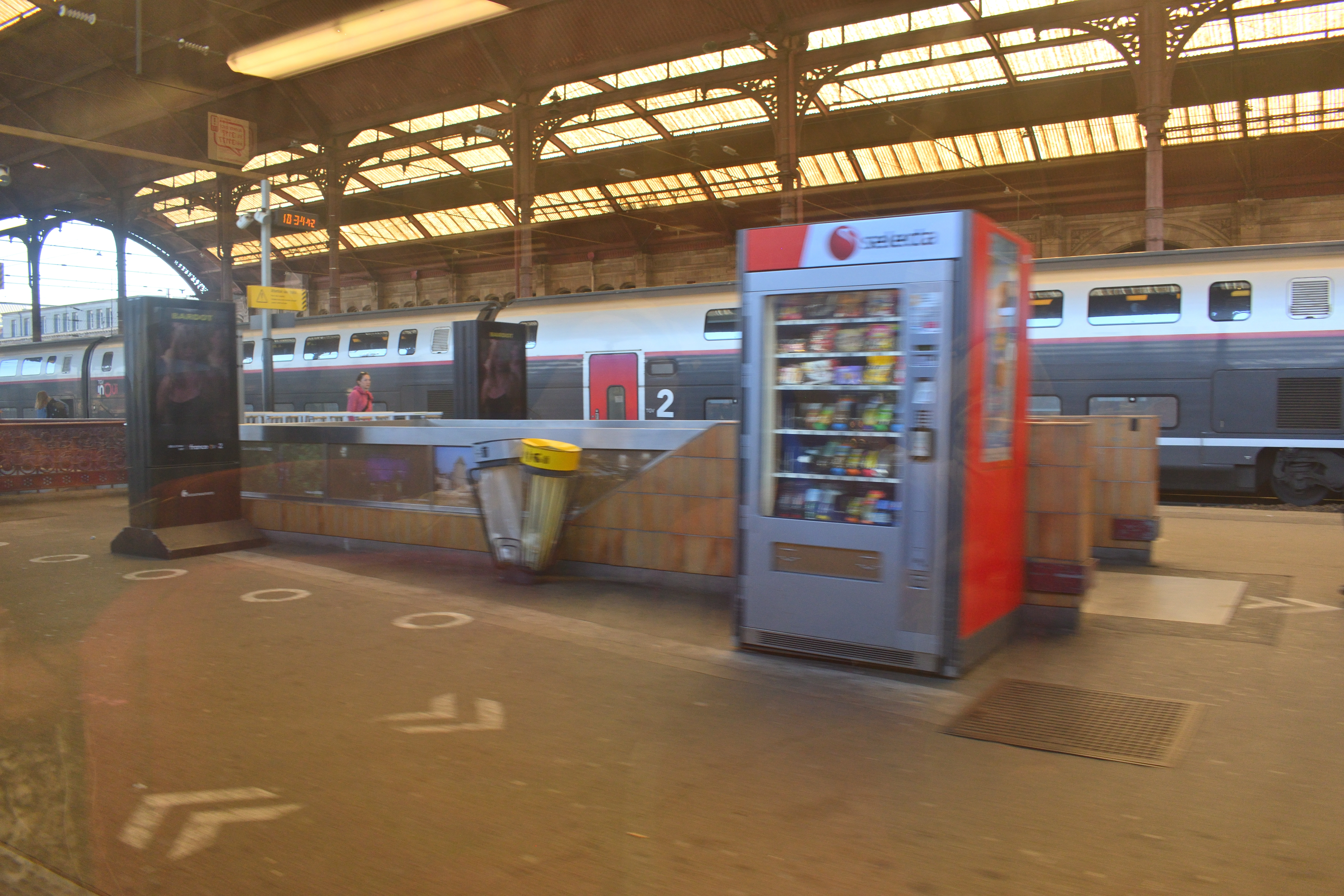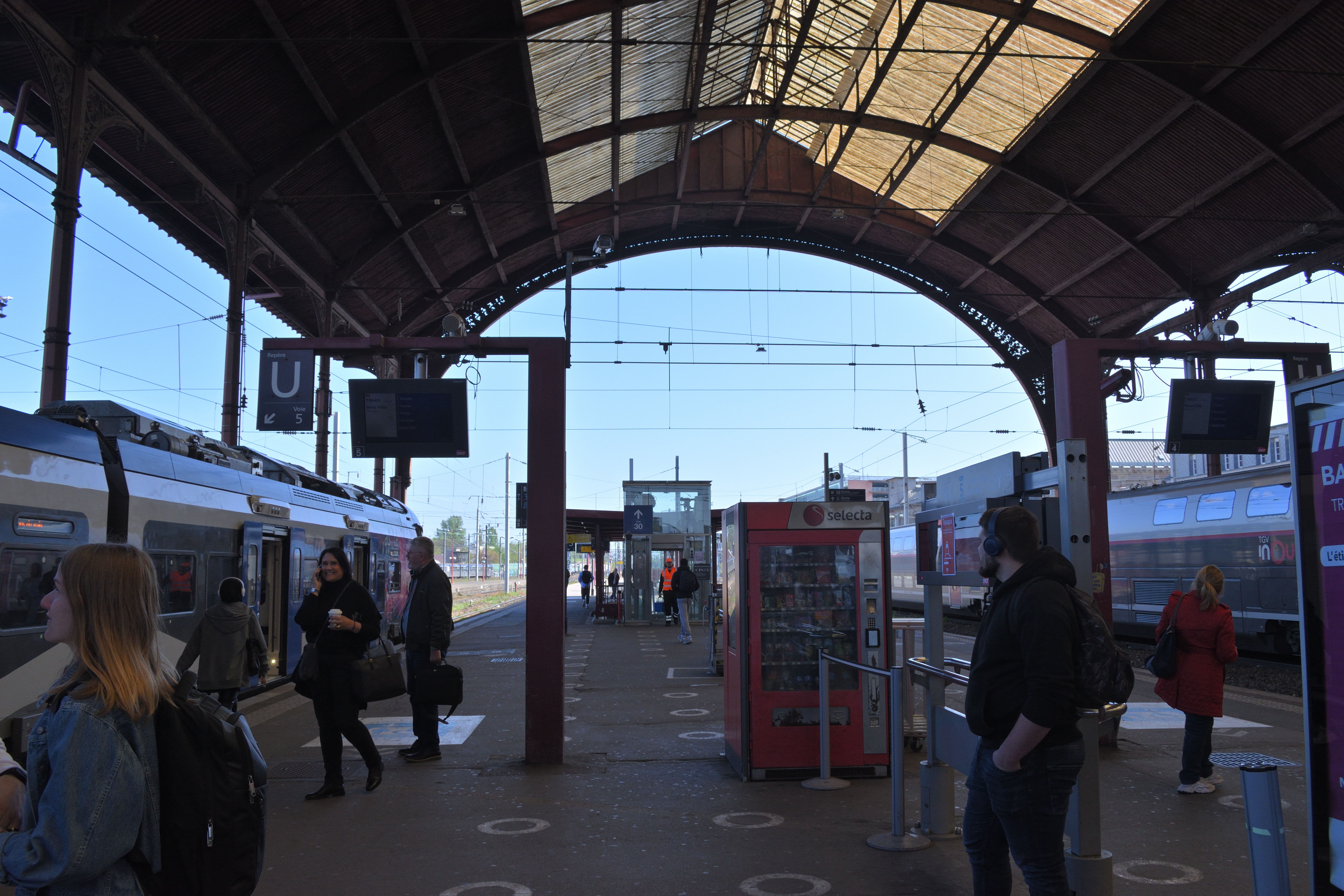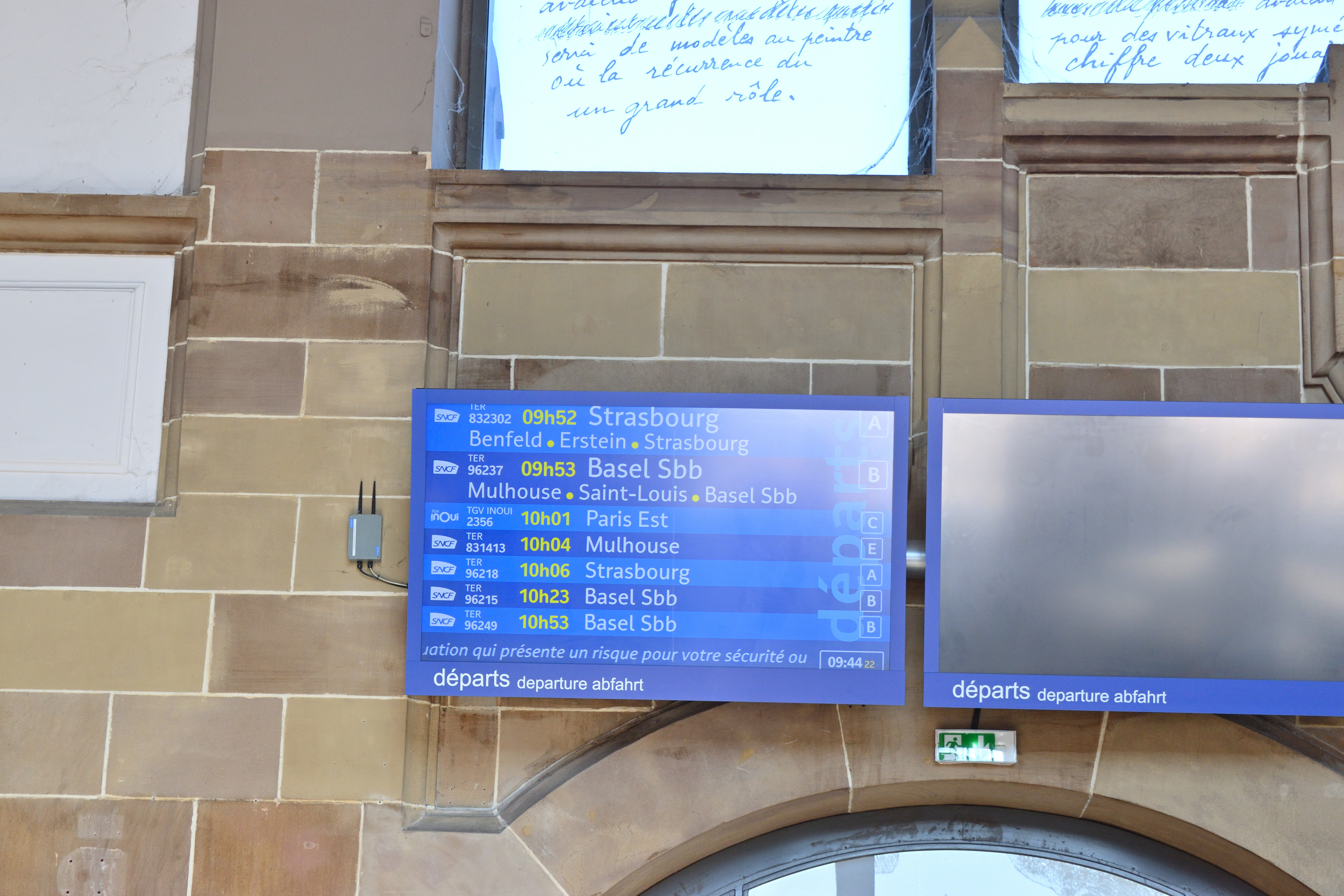 駅のホールのホーム側には液晶パネルがあり、列車の時刻が表示されていた。 いくつかストラスブール行きの列車が表示されている。 またパリ東駅行きの列車はTGVで、日本でいう新幹線にあたる列車だが、同じ時刻表に表示されていた。 日本では新幹線はホームも在来線と完全に別仕様だが、フランスでは在来線とつながったホームから発着している。