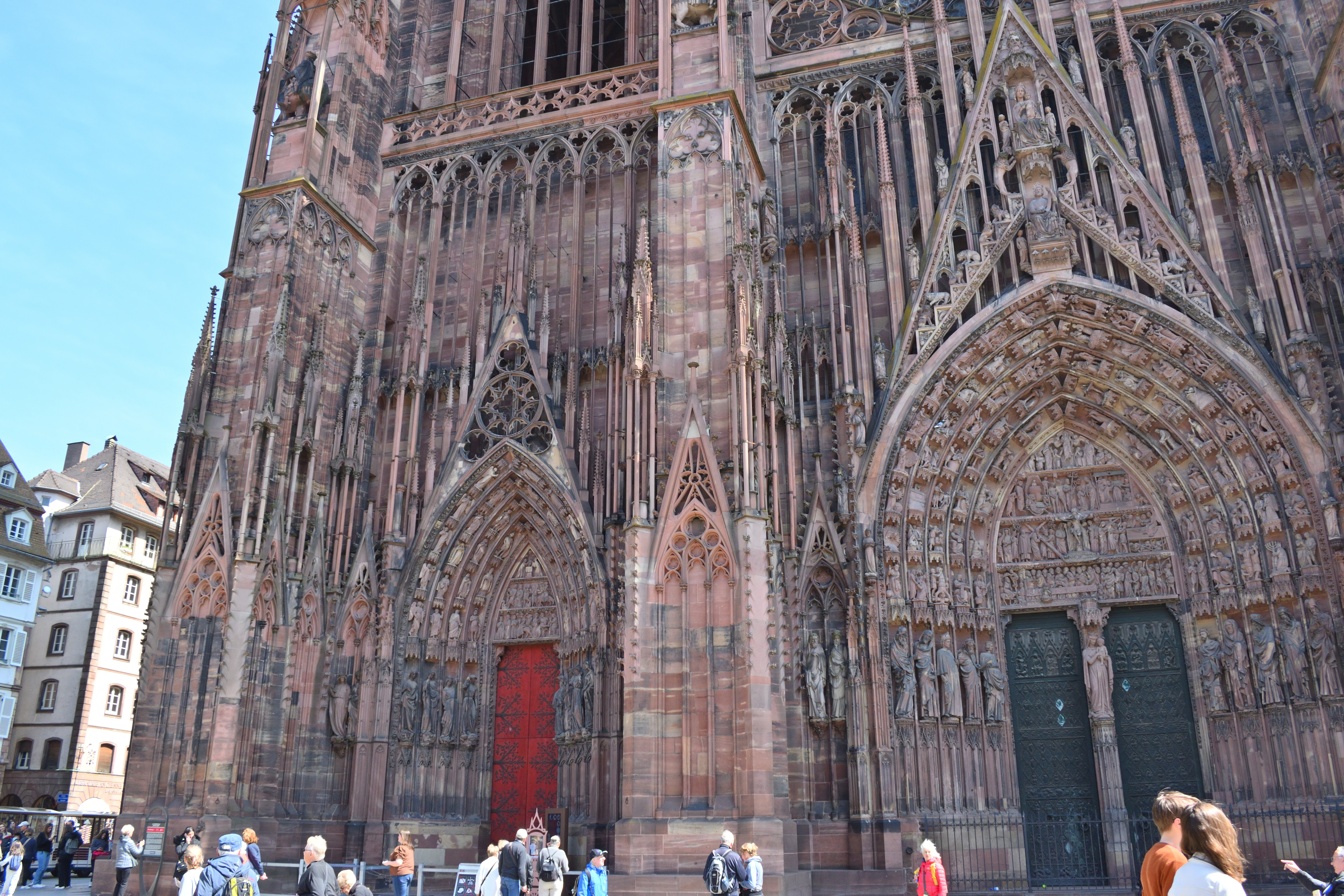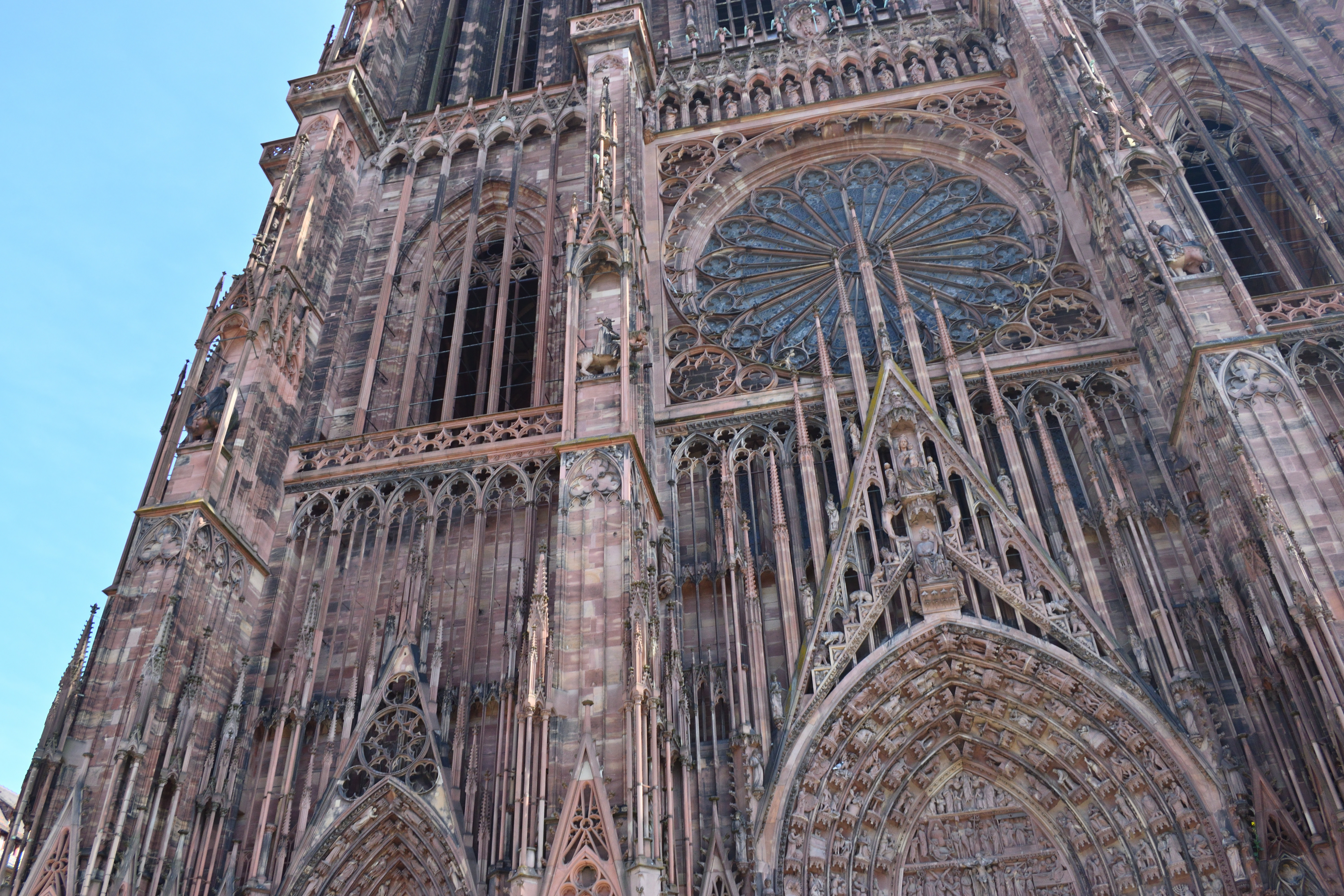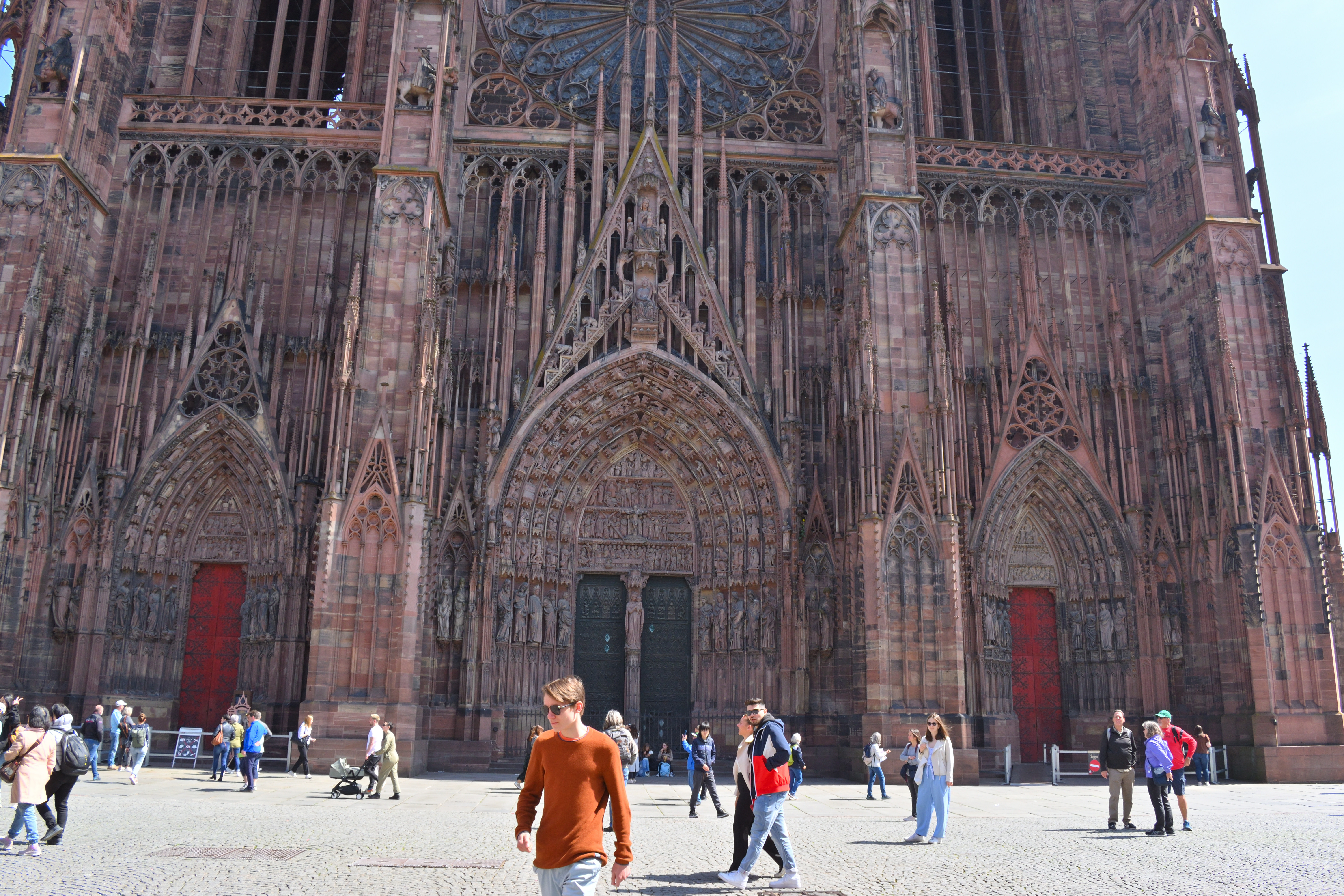 私たちはストラスブール駅から寄り道しながら歩くこと1時間ほどで、ノートルダム・ド・ストラスブール大聖堂 (Cathédrale Notre-Dame de Strasbourg) へと到着した。 ノートルダム大聖堂と言うとパリにある大聖堂を指すことが多いので、こちらはストラスブール大聖堂と呼ばれているようだ。 余談だがノートルダムという言葉は直訳すると「私たちの貴婦人」で、キリスト教では聖母マリアを指す言葉である。 なので、ノートルダムという言葉はフランス語圏で複数の大聖堂の名前に使われており、ノートルダム大聖堂と名前がついているものはフランスの中だけでも10箇所以上ある(wikipedia)。
