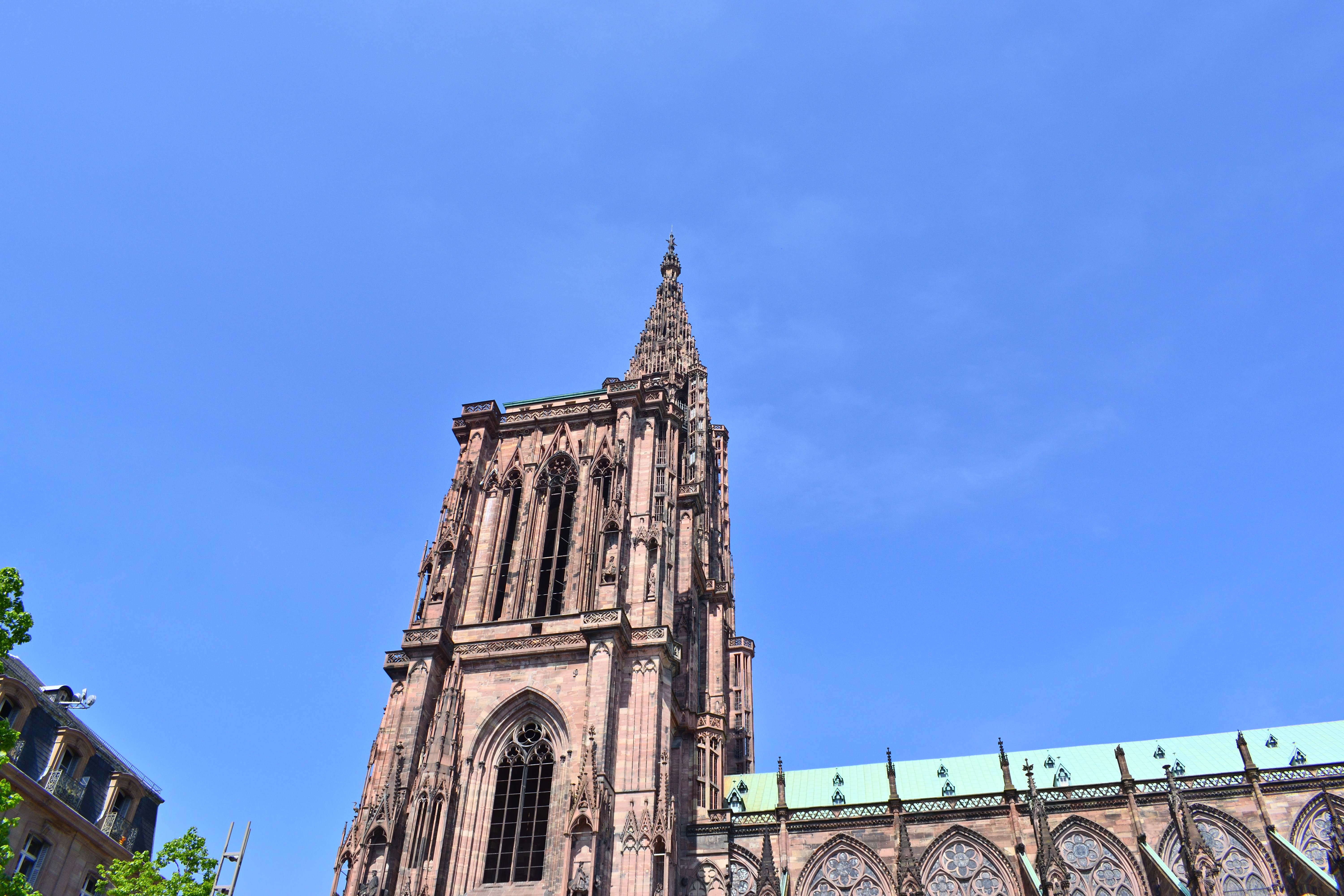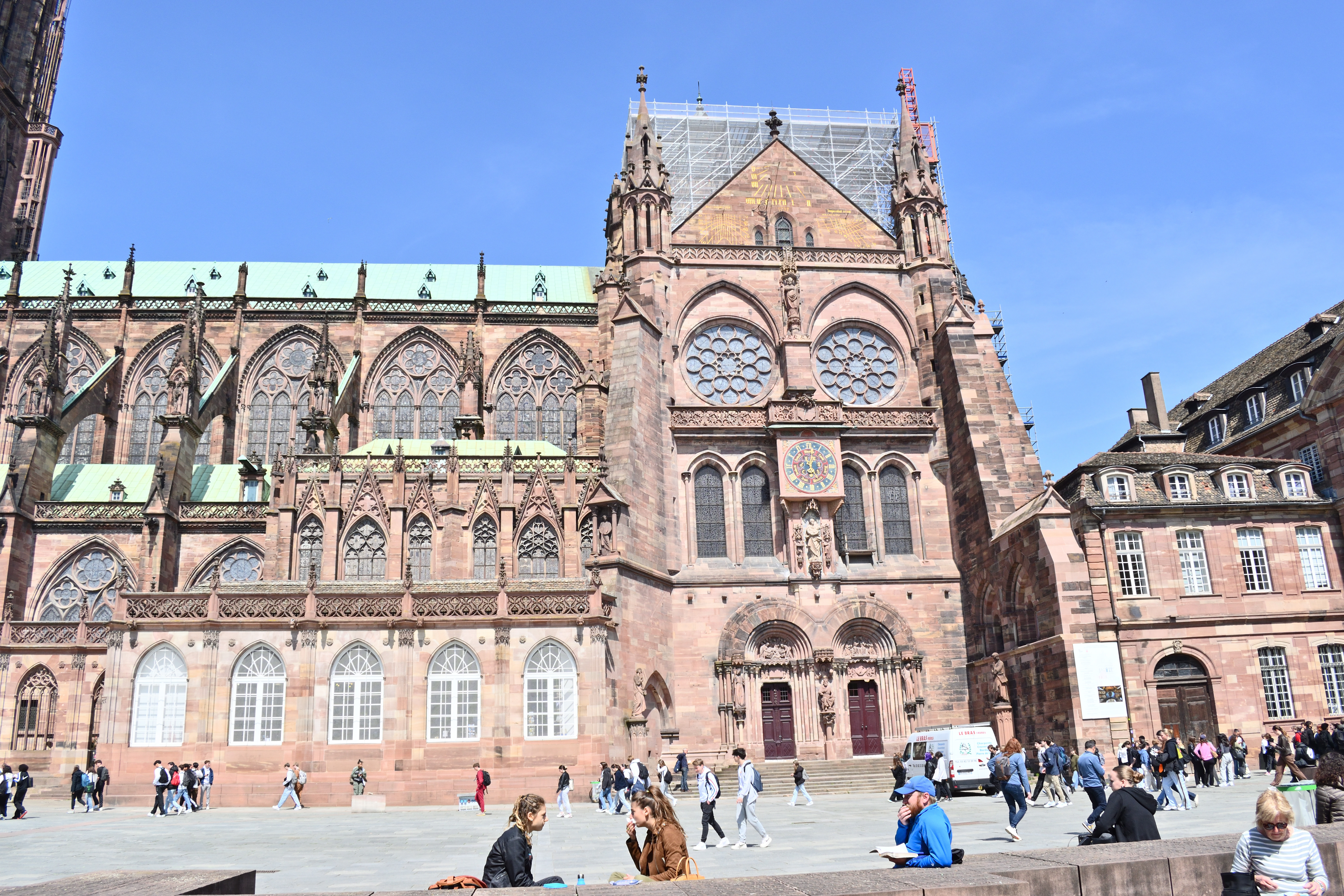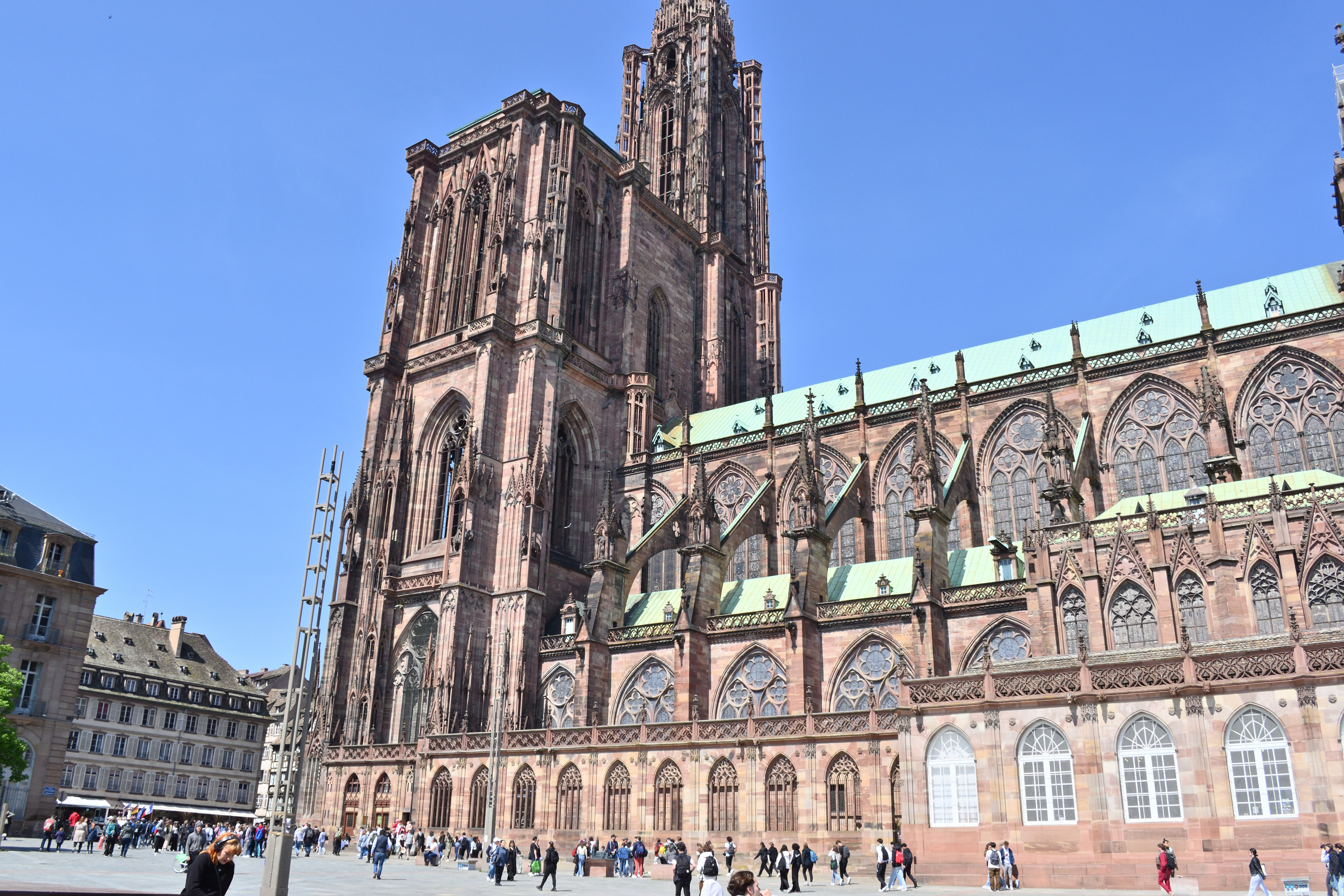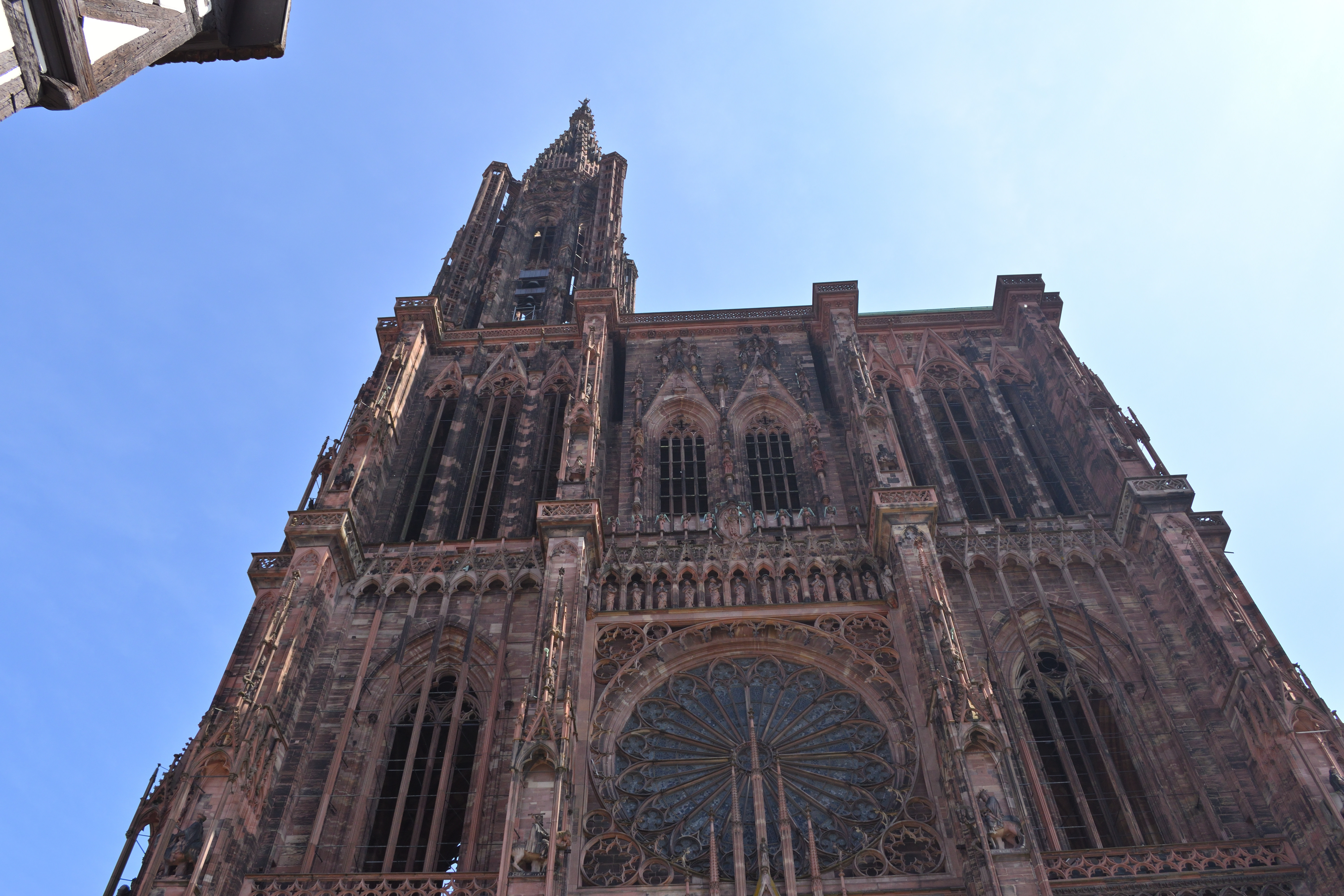 私たちはストラスブール駅から寄り道しながら歩くこと1時間ほどで、ノートルダム・ド・ストラスブール大聖堂 (Cathédrale Notre-Dame de Strasbourg) へと到着した。 ノートルダム大聖堂と言うとパリにある大聖堂を指すことが多いので、こちらはストラスブール大聖堂と呼ばれているようだ。 余談だがノートルダムという言葉は直訳すると「私たちの貴婦人」で、キリスト教では聖母マリアを指す言葉である。 なので、ノートルダムという言葉はフランス語圏で複数の大聖堂の名前に使われており、ノートルダム大聖堂と名前がついているものはフランスの中だけでも10箇所以上ある(wikipedia)。