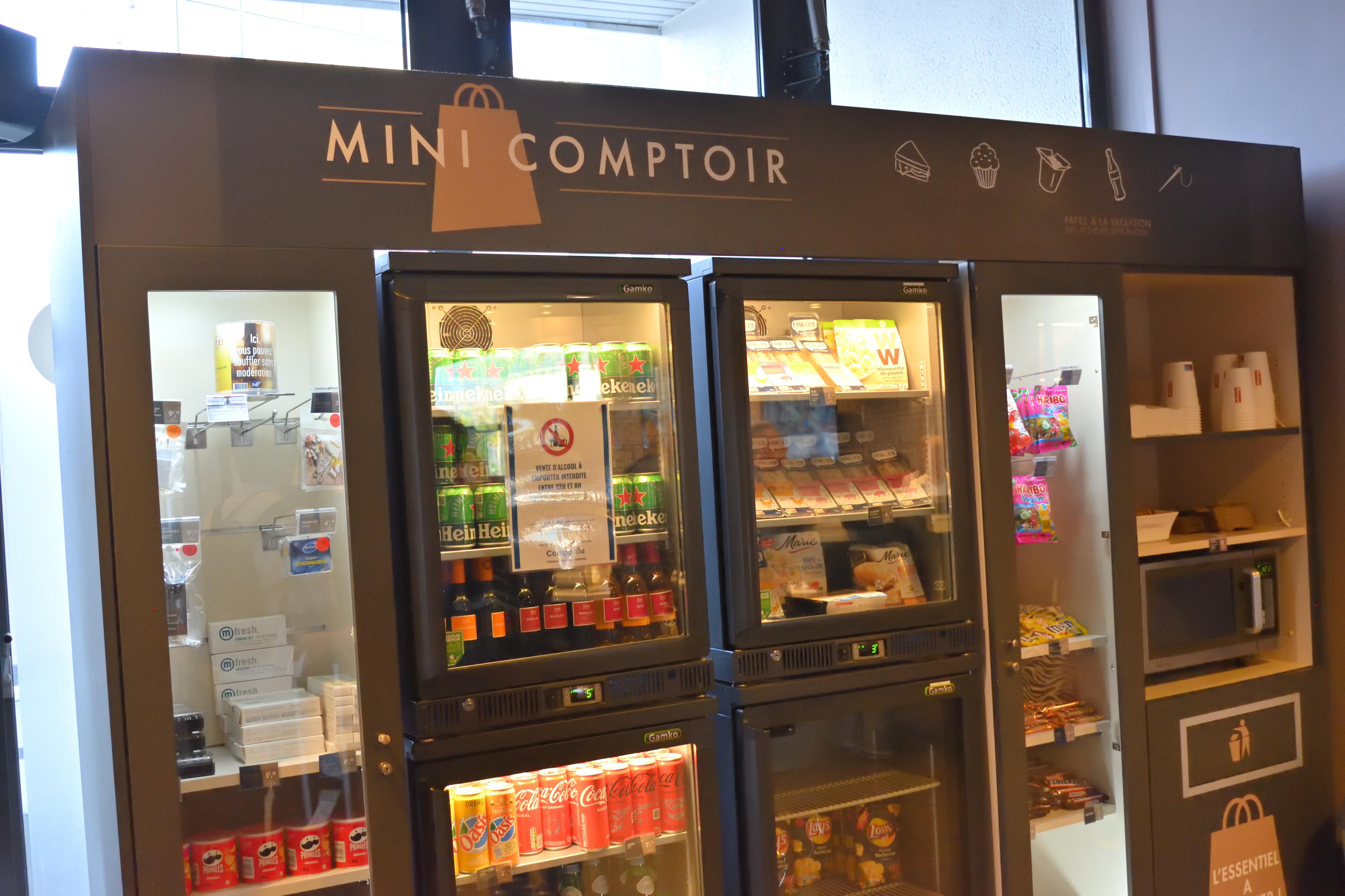 フロントの近くには冷蔵庫があり、いつでもフロントで食べ物が買えるようになっていた。