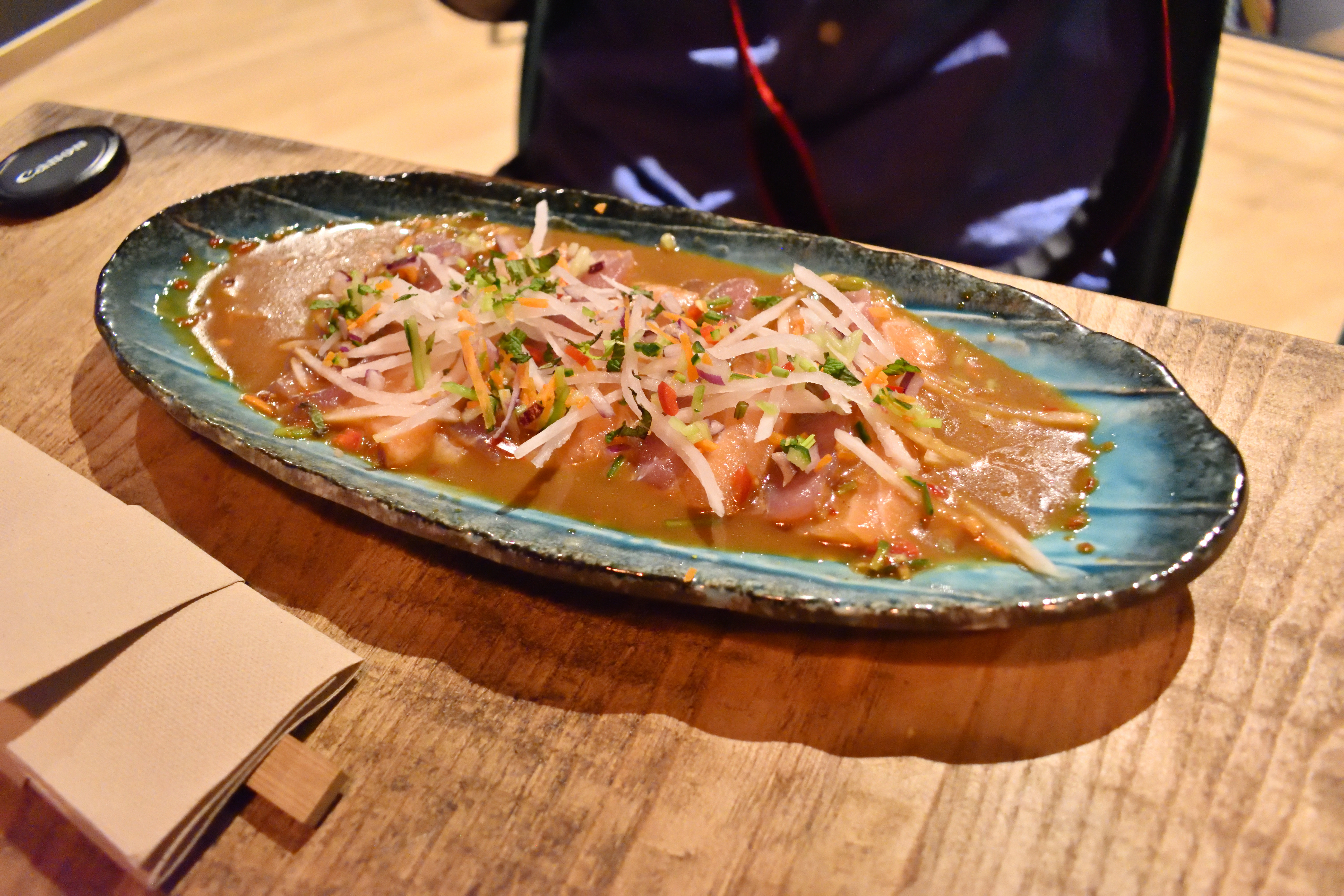 そしてこちらはクリスピーサーモン巻きだ。 サーモンの巻き寿司に衣をつけて揚げたもののようだ。 これは日本では食べられない。 味は周りがおかきのような味がして、机に置いてある甘口(ほんとに甘い)醤油をつけて食べると歌舞伎揚のような味になった。 寿司をジャンクにした感覚で、結構美味しかった。