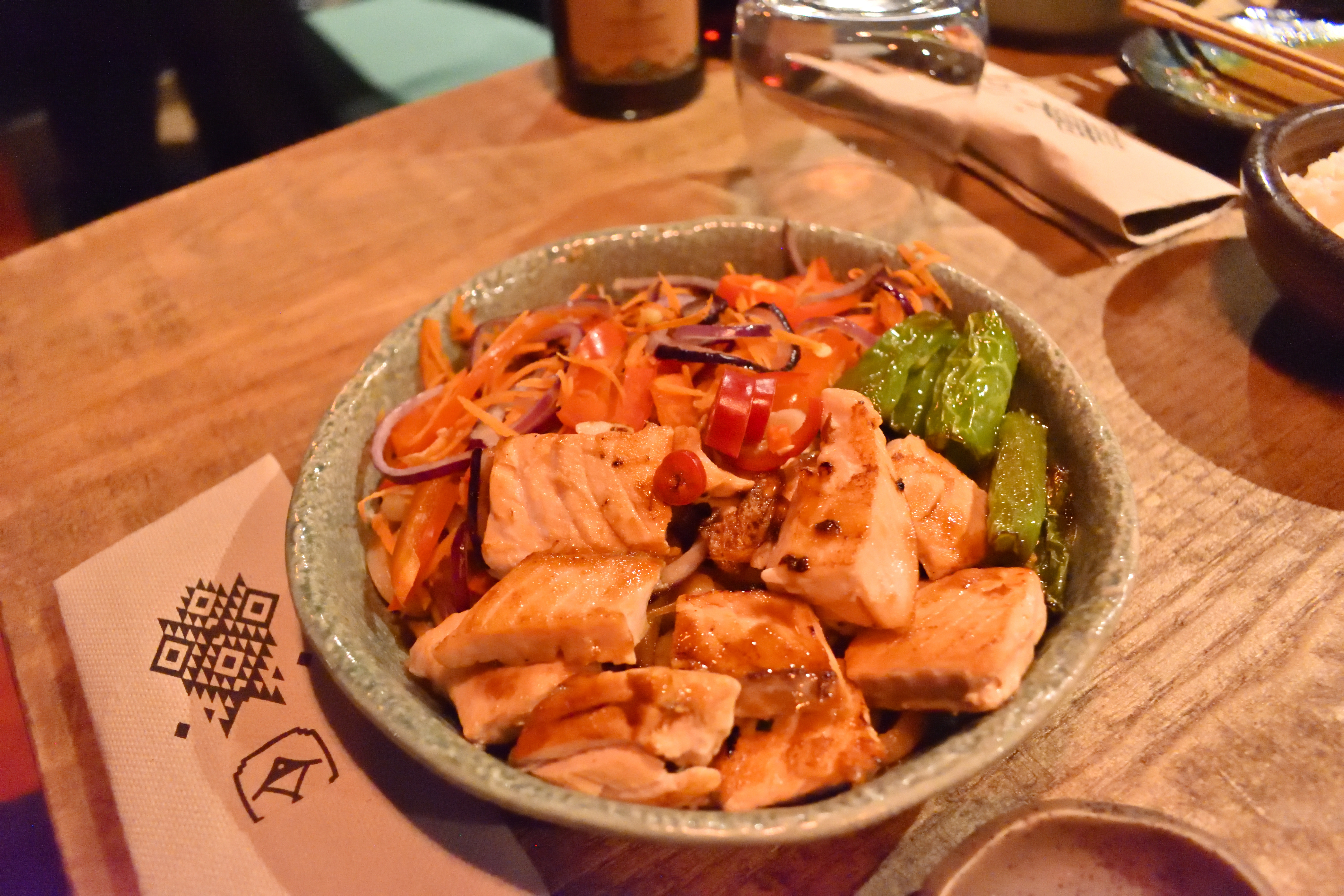私はお酒にロゼワインを注文し、”Yakitori” とクリスピー揚げと一緒に飲んだ。 頼んだメニューが洋風寄りだったので、ワインとよく合った。