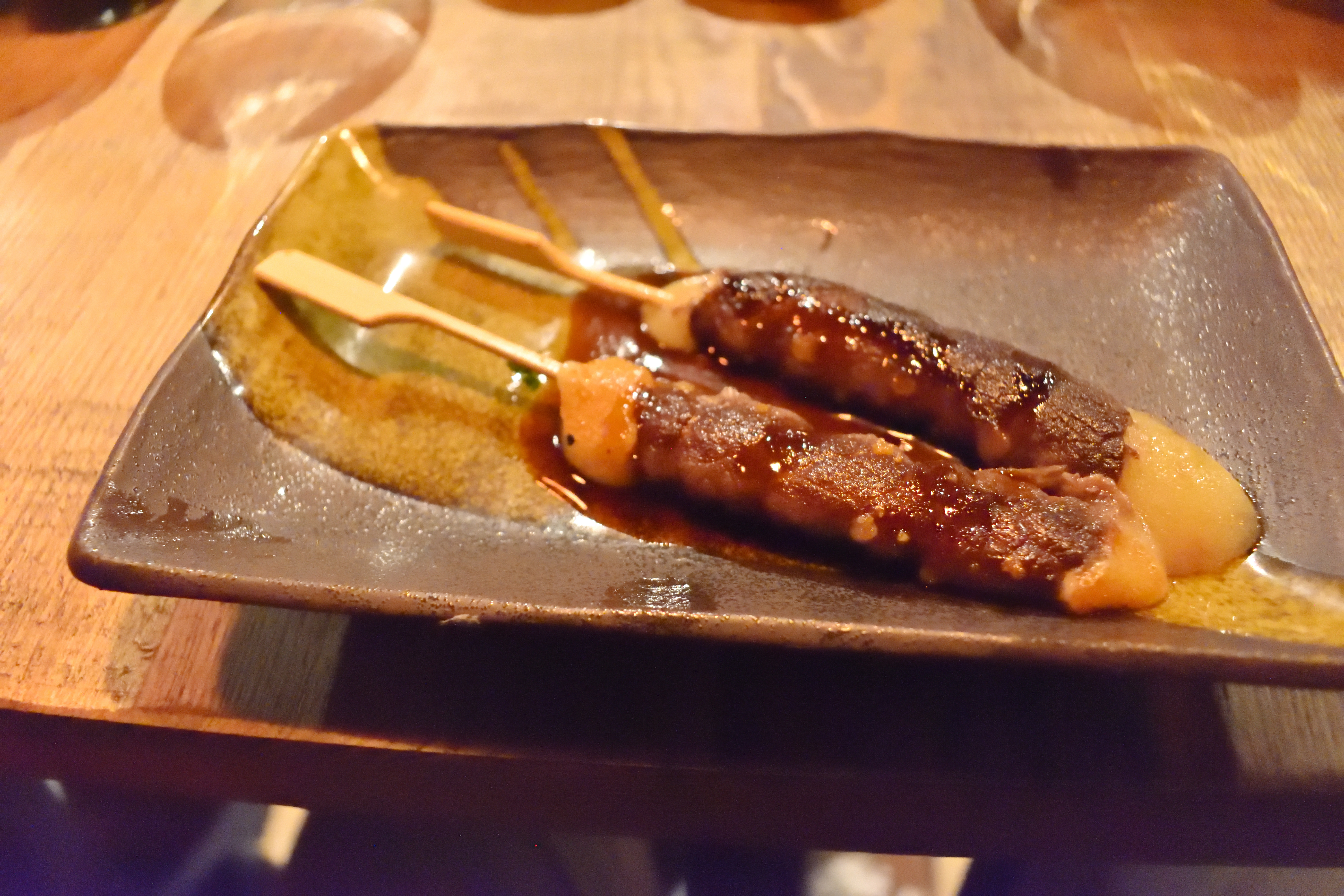 これは私が注文した “Yakitori” だ。 具材は牛肉とチーズである点がポイントだ。 味は屋台で売っている肉巻きおにぎりのような感じで美味しかった。