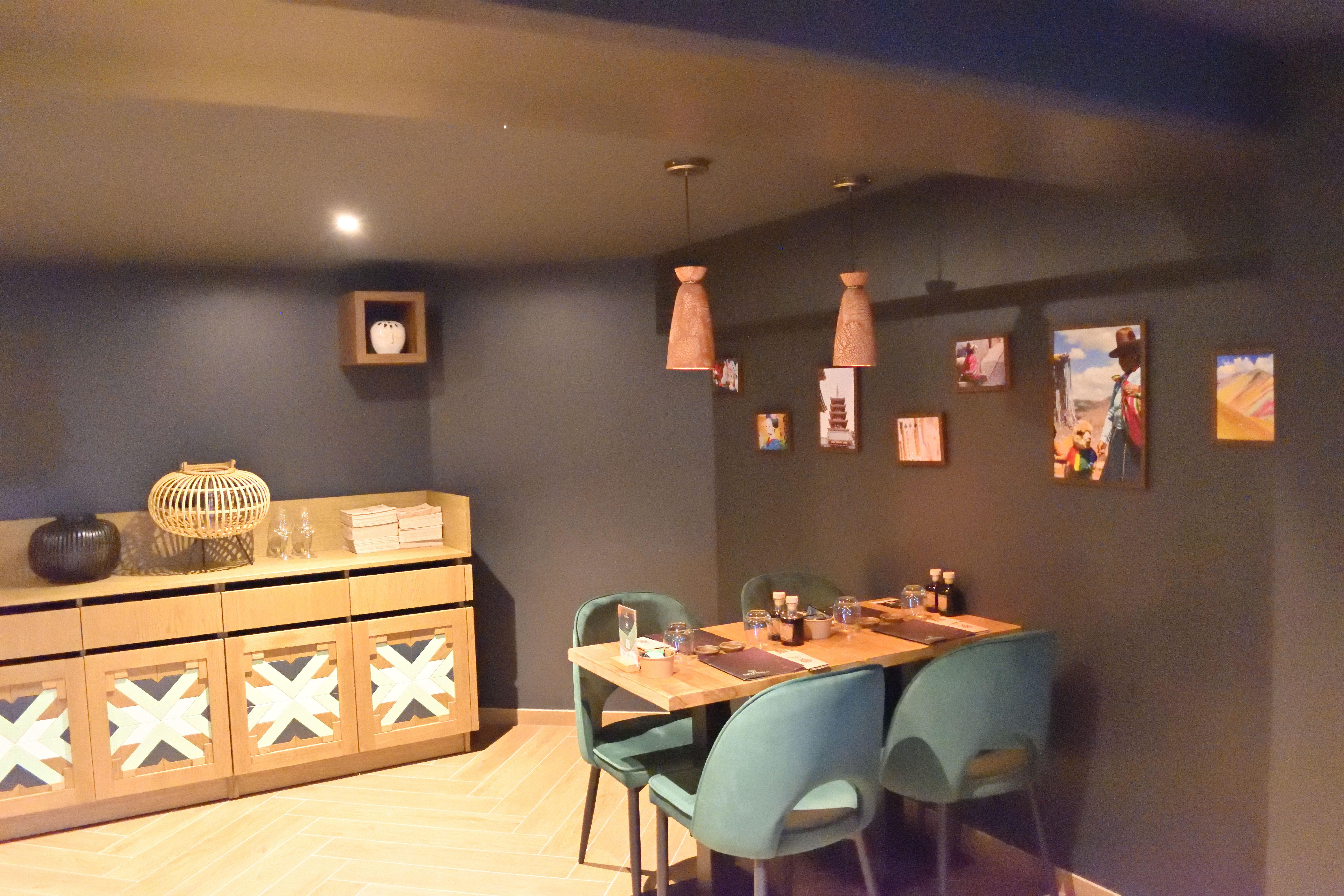 寿司屋へ入ると、和風ではないが木を基調とした飾り付けがされており、不思議な雰囲気だった。 調度品の模様はネイティブアメリカンの柄を連想させるし、壁に飾られている写真はカウボーイのような雰囲気がある。