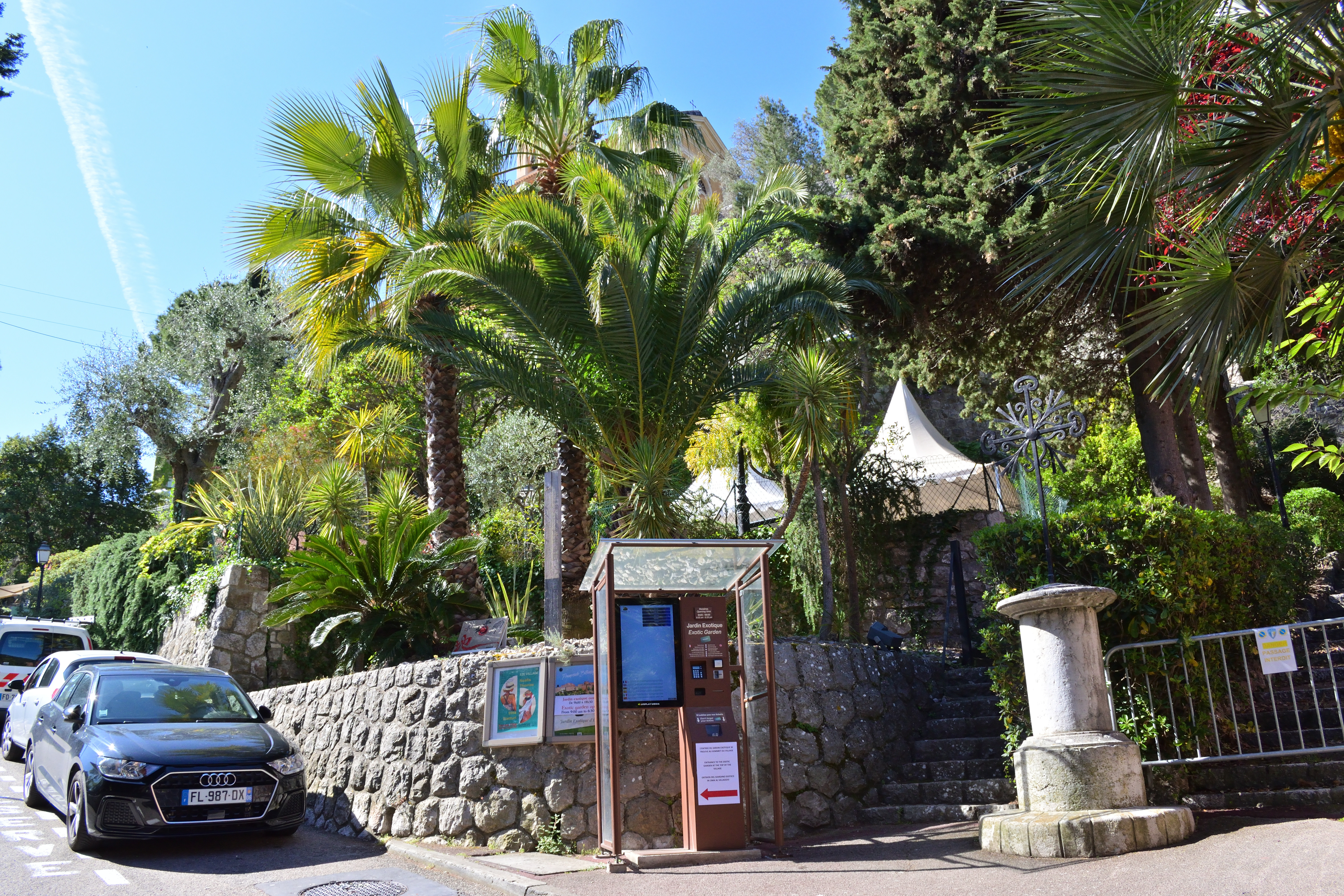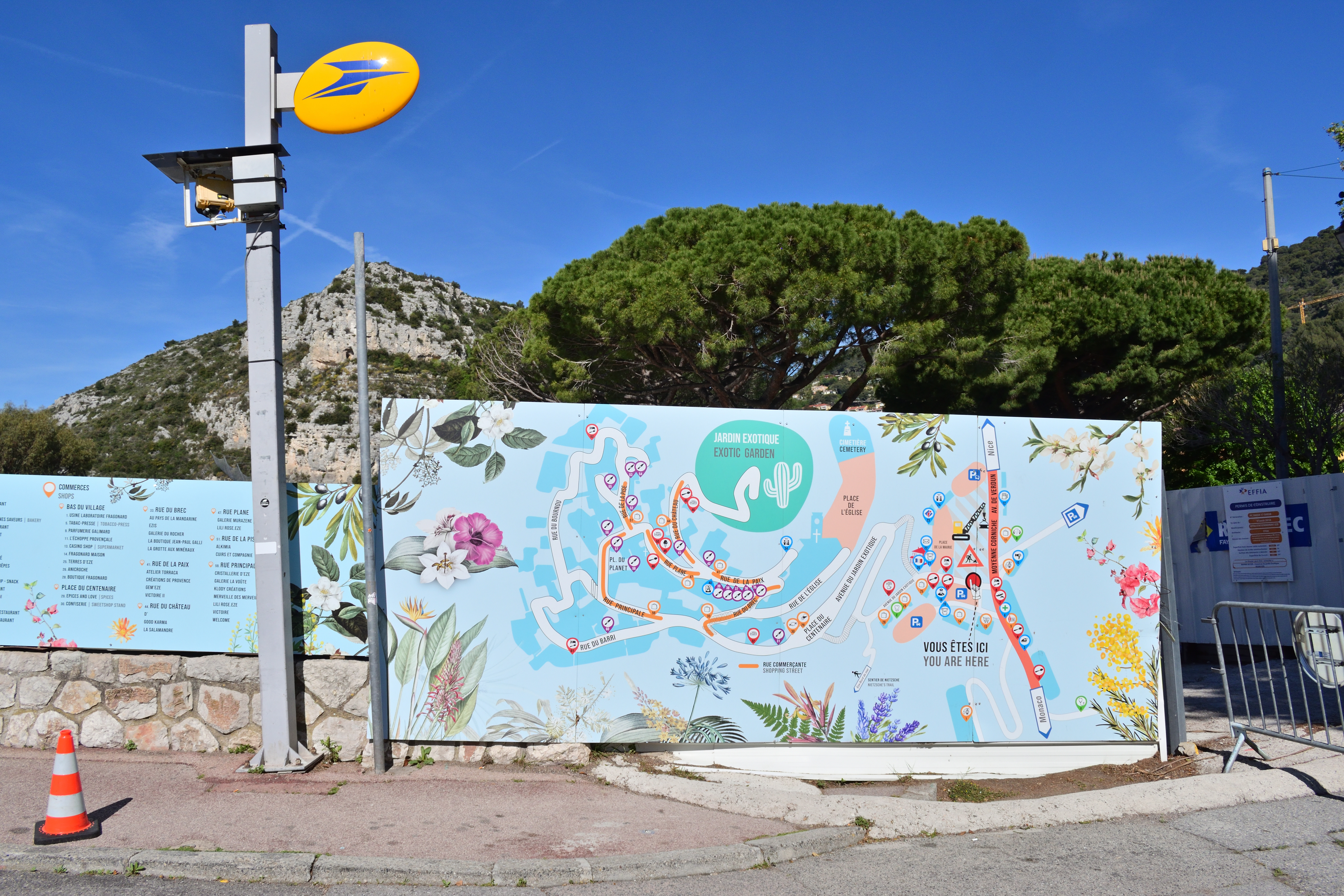 入り口にあった村全体の地図がわかりやすい。 南側にある水色の部分がエズ村の建物がある場所で、中央上側の緑色の丸が山の頂上にある植物園だ。 私たちは右側の赤丸の場所におり、今から左側へと進んでいこうというところだ。