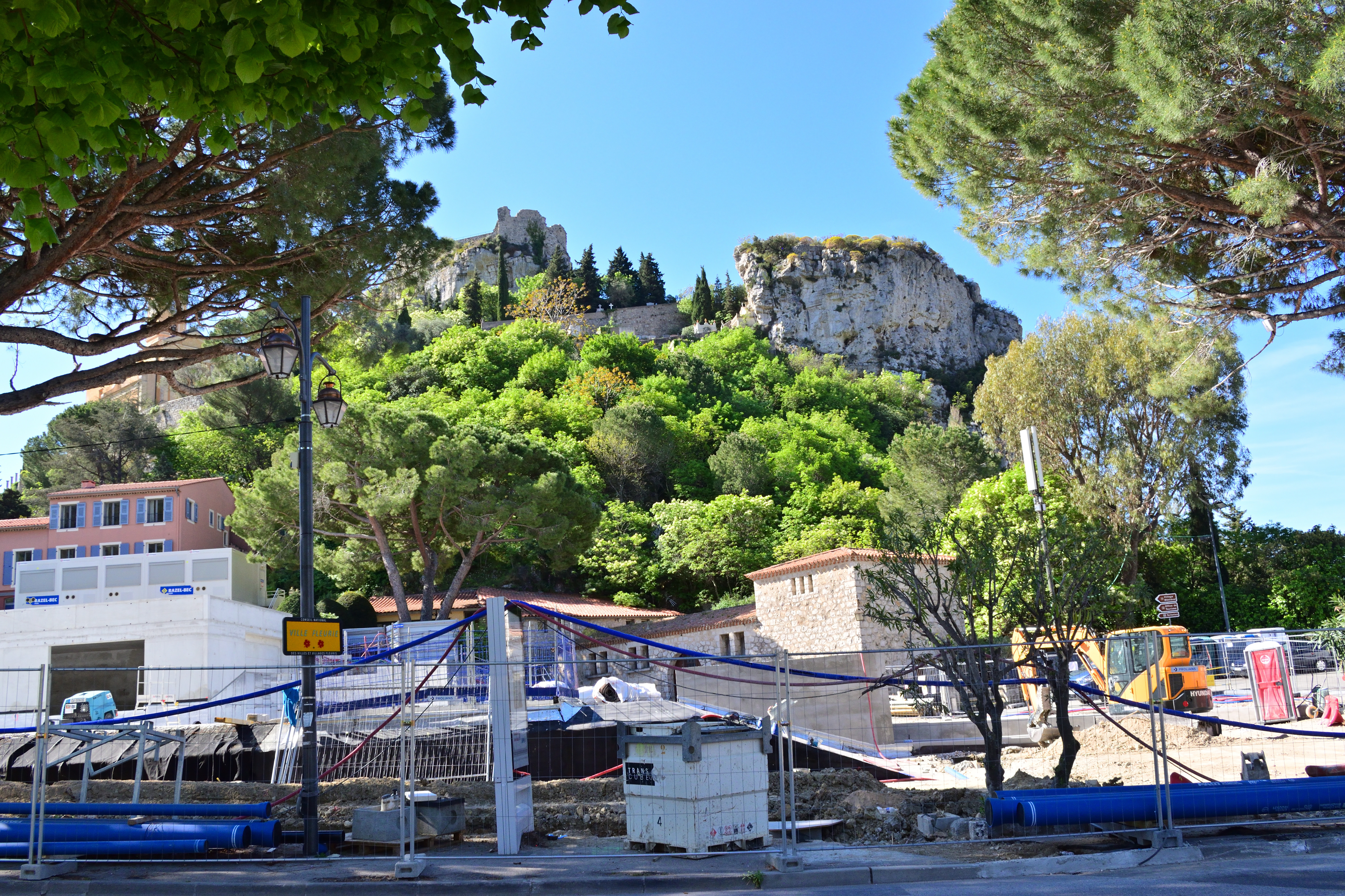 右手を見ると、村のふもとの入り口あたりは現在工事中のようだった。 そして工事をしている奥には、エズ村の中心がある山の岩肌が姿を見せていた。 エズ村は「鷲の巣村」と呼ばれる、山や崖の頂上に作られた村の代表的なものだということである。 山の頂上に村が造られた背景には、見晴らしの良さから敵を見つけやすいということと、山の南側の斜面に家を建てることで冬の北風から身を守ることができるというメリットがあるということだそうだ(ソース)。