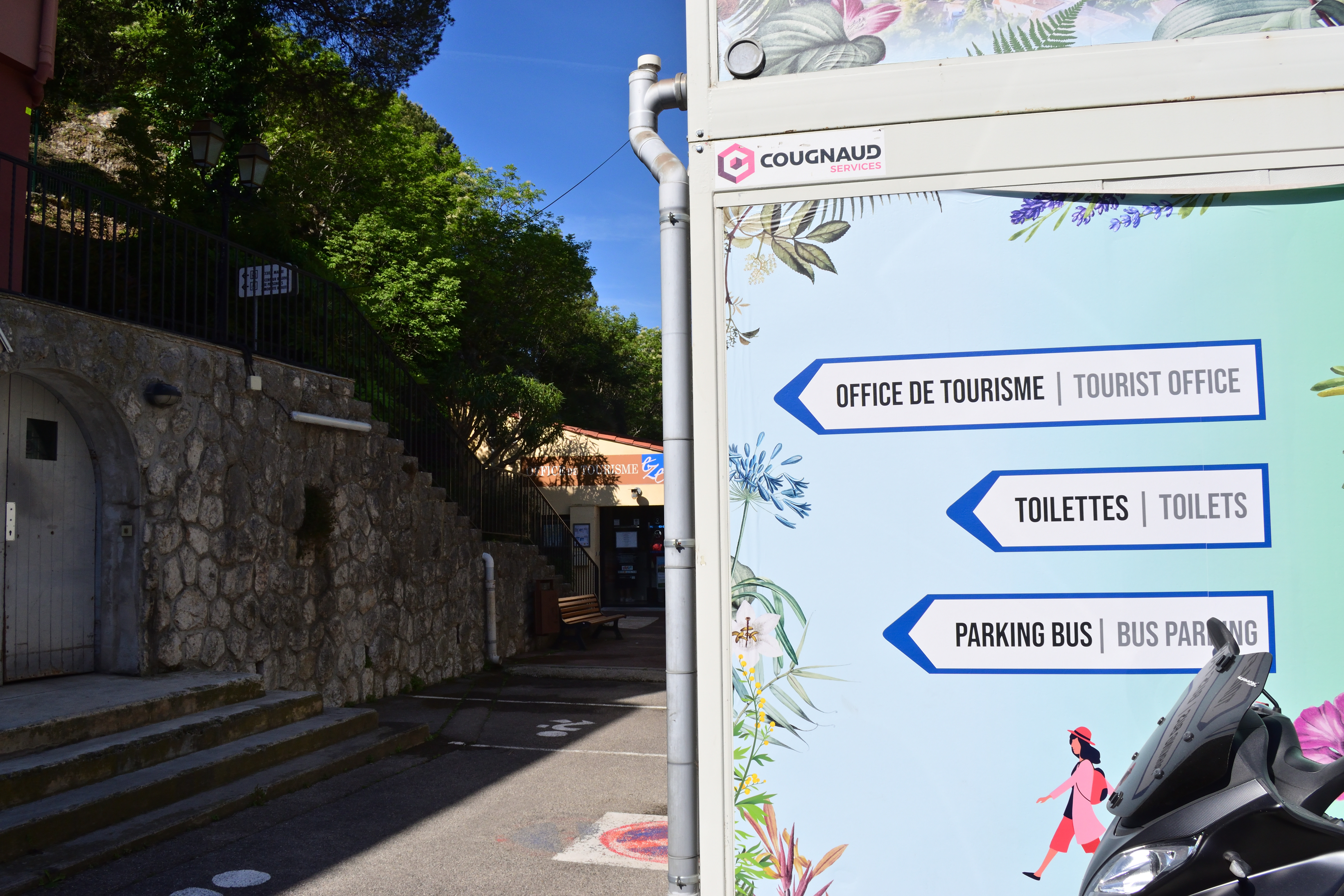 坂道の途中には観光案内所もあったので寄ってみた。 しかし小さな案内所で、スタッフの窓口が少々とパンフレットが少々置いてあるだけで、コルマールにあったような立派な観光案内パンフレットのようなものは見当たらなかった。 ついでにトイレに寄ってみたのだが、こちらのトイレは有料で、トイレの入り口に設置されている窓口の人にお金を払い、改札のようなゲートを通るとトイレが利用できるというものだった。