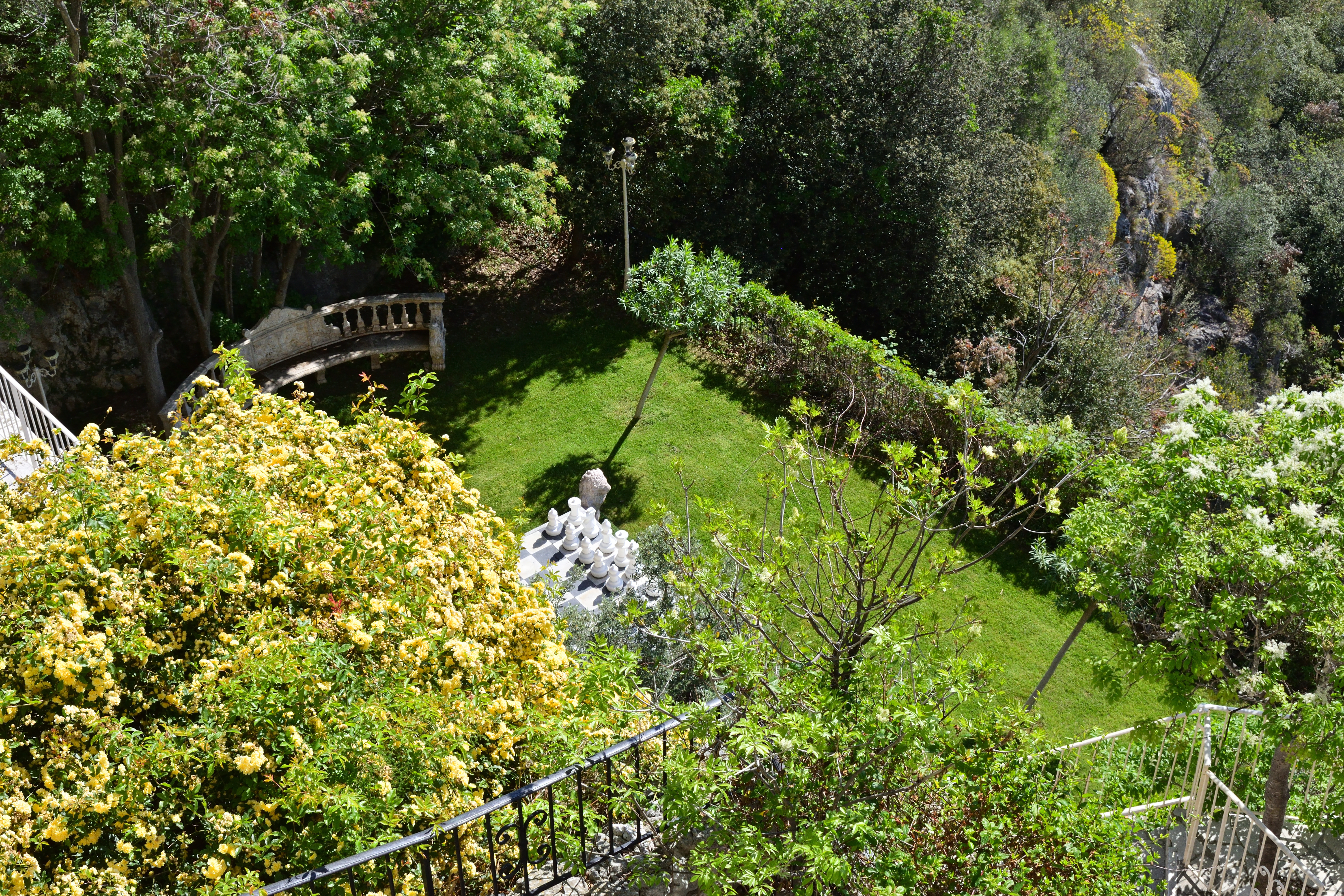 入り口から下の方を覗いてみると、大きな石造りのチェス盤が置かれた中庭があった。 ファンタジーで出てきそうな趣だ。