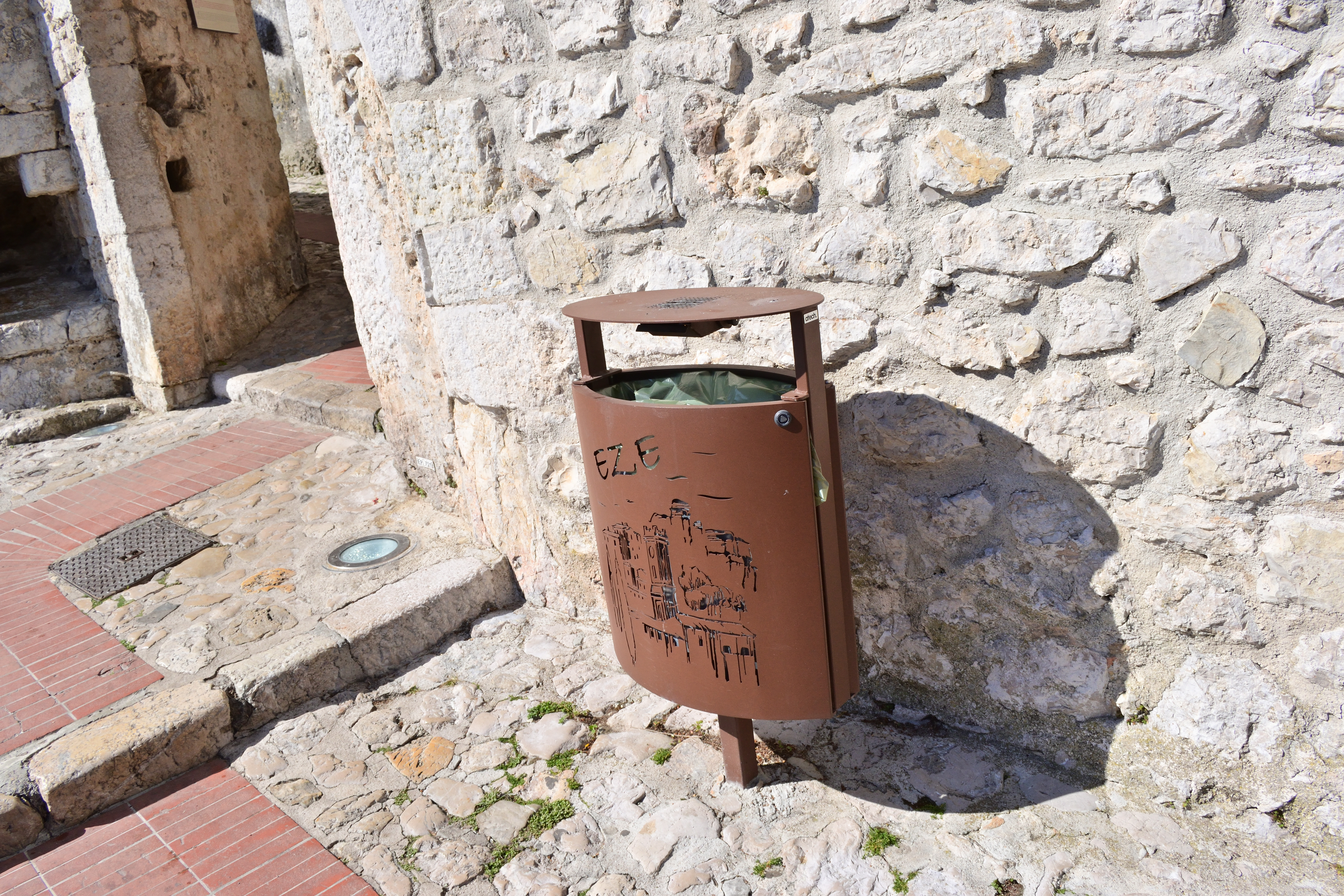 入り口の付近にはエズ村の文字と絵がくり抜かれたオシャレなゴミ箱が置かれていた。