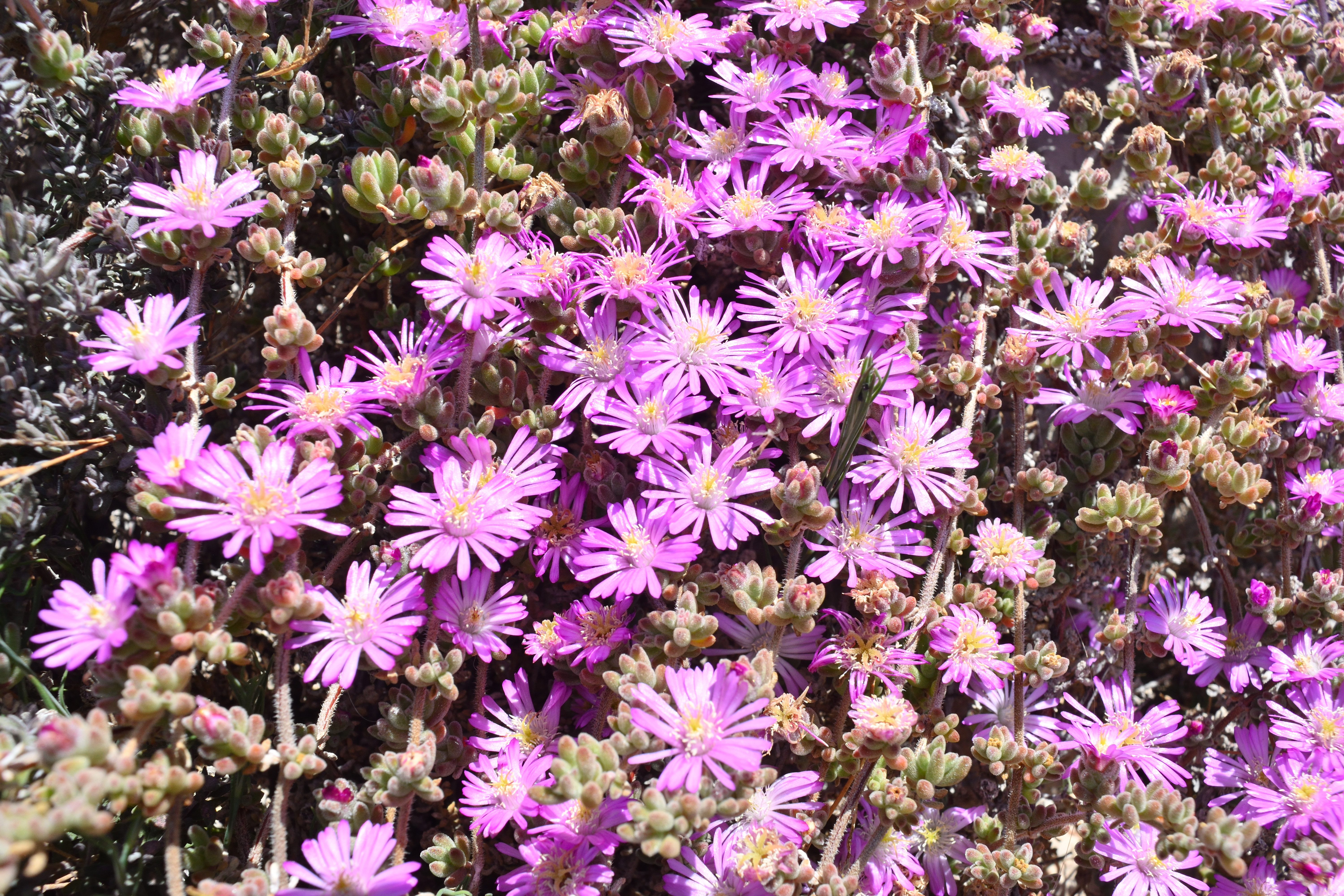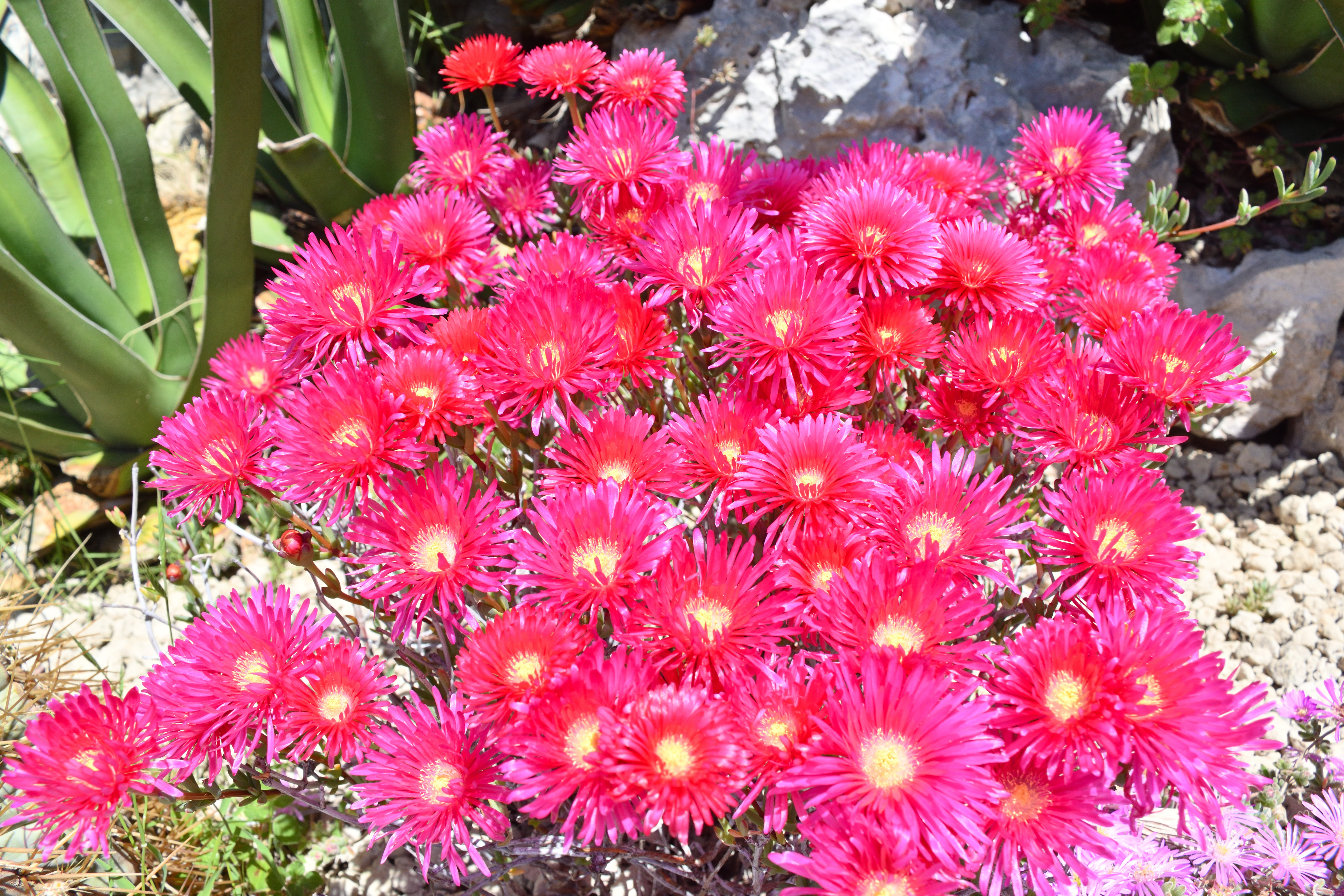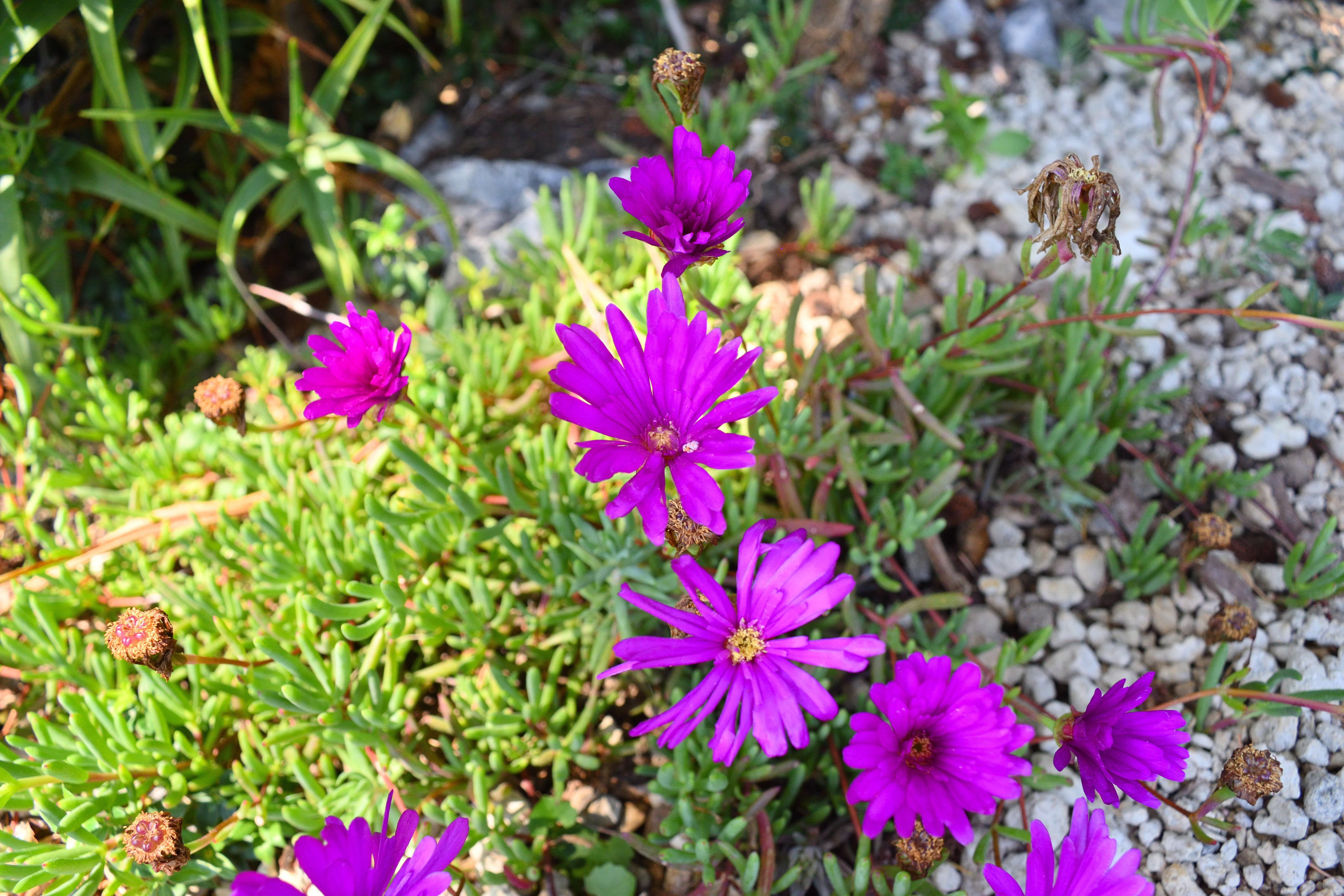 これは南アフリカ原産の、耐寒マツバギクという植物のようだ。 濃いピンク色の花がとても美しい。