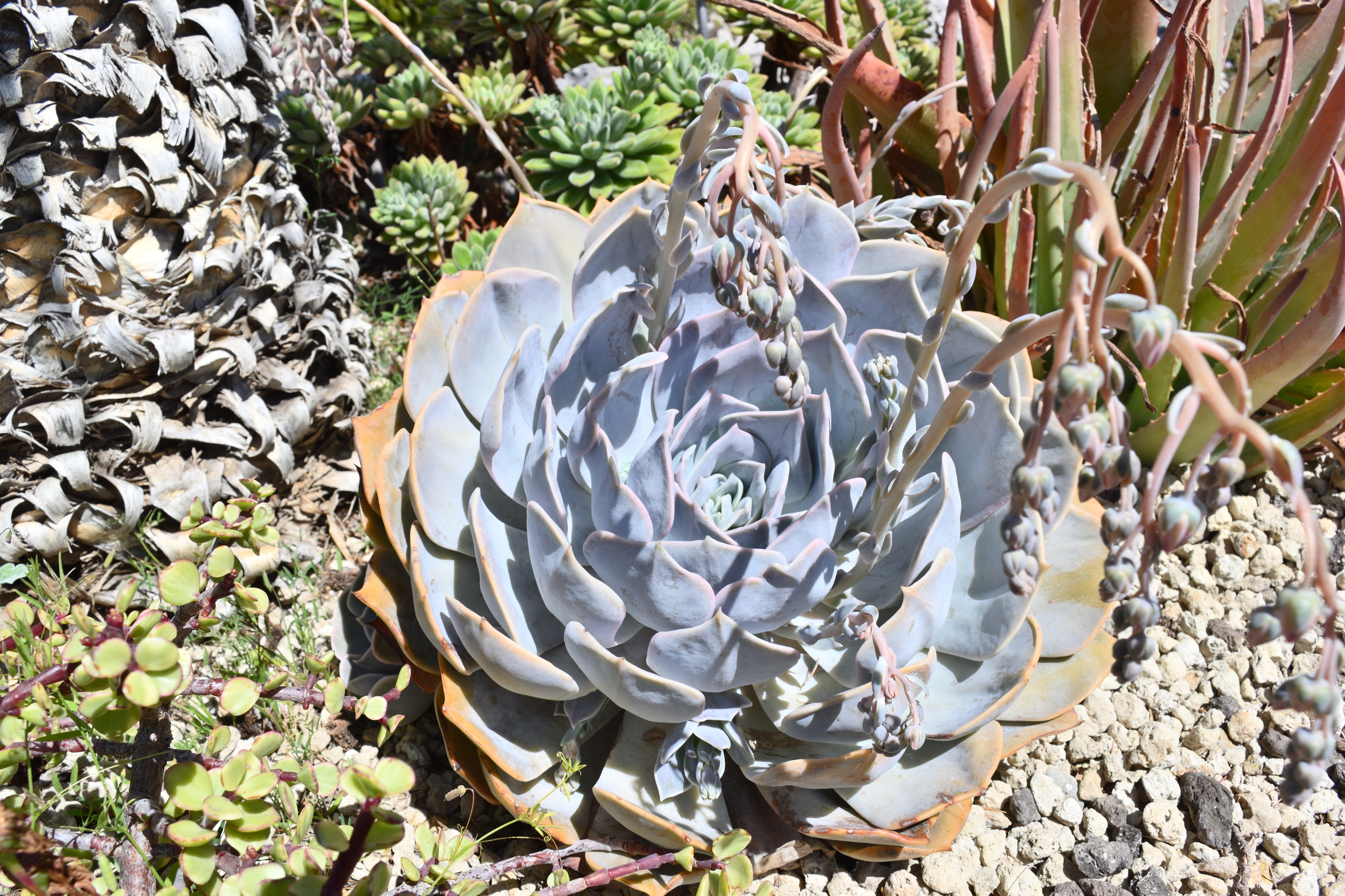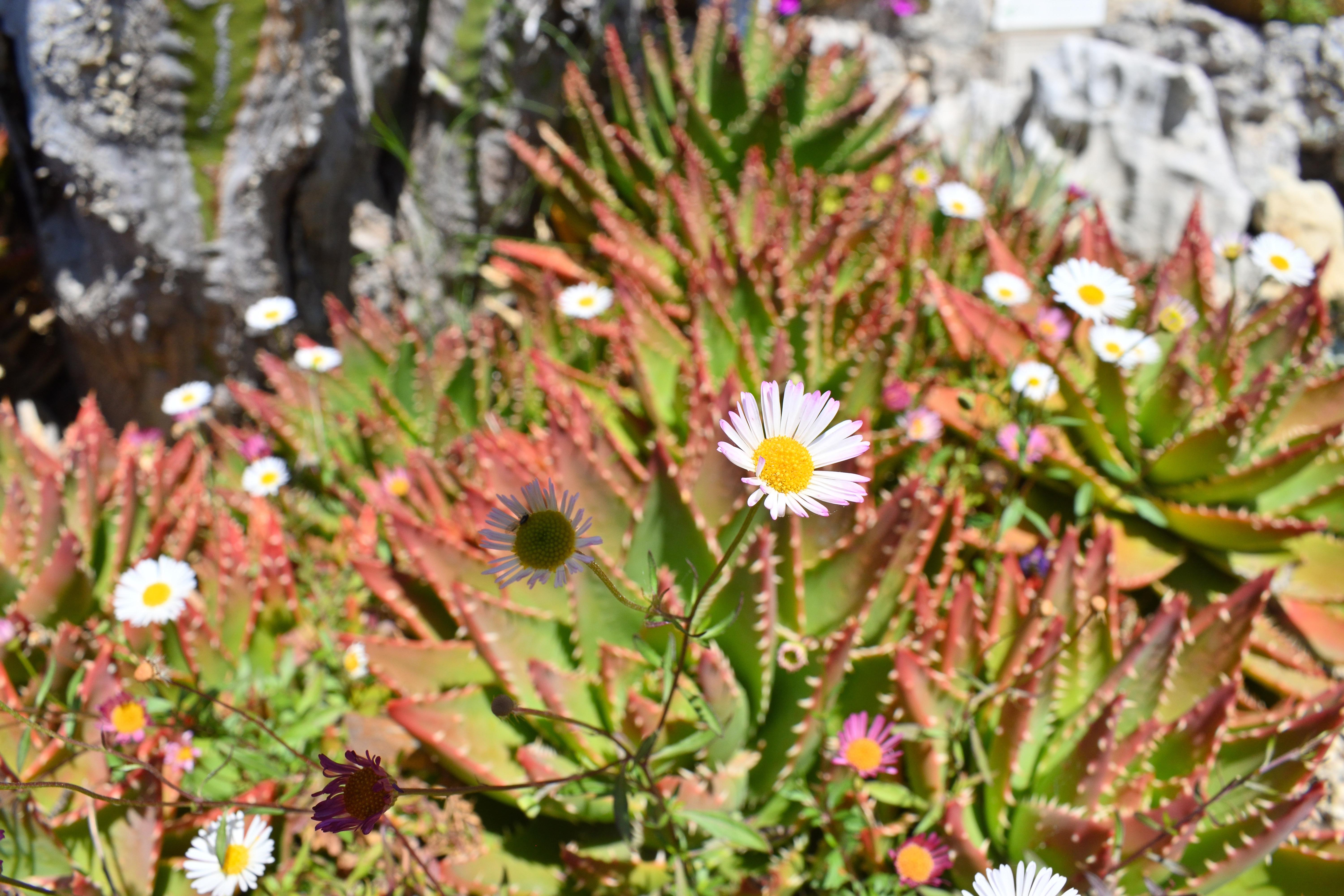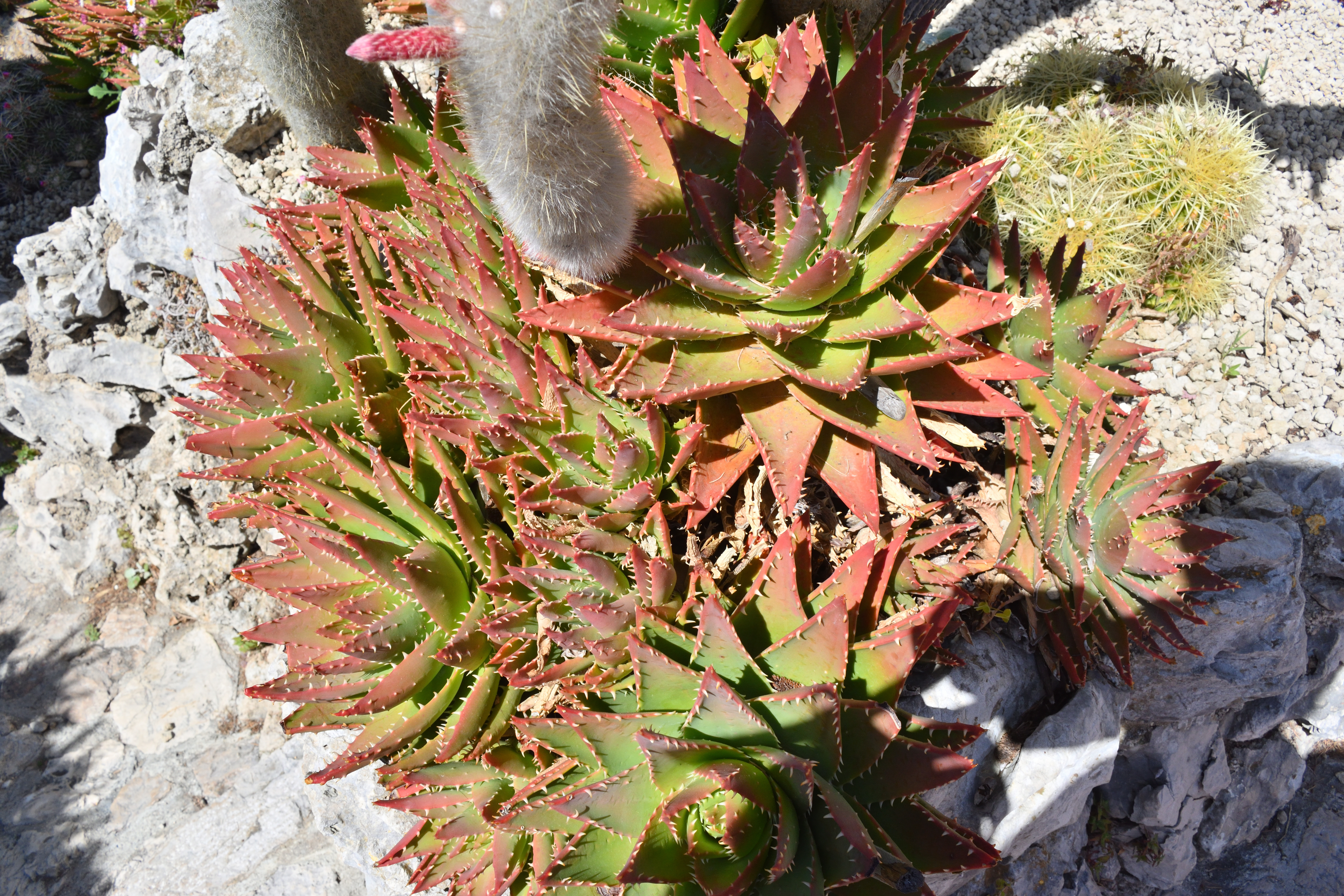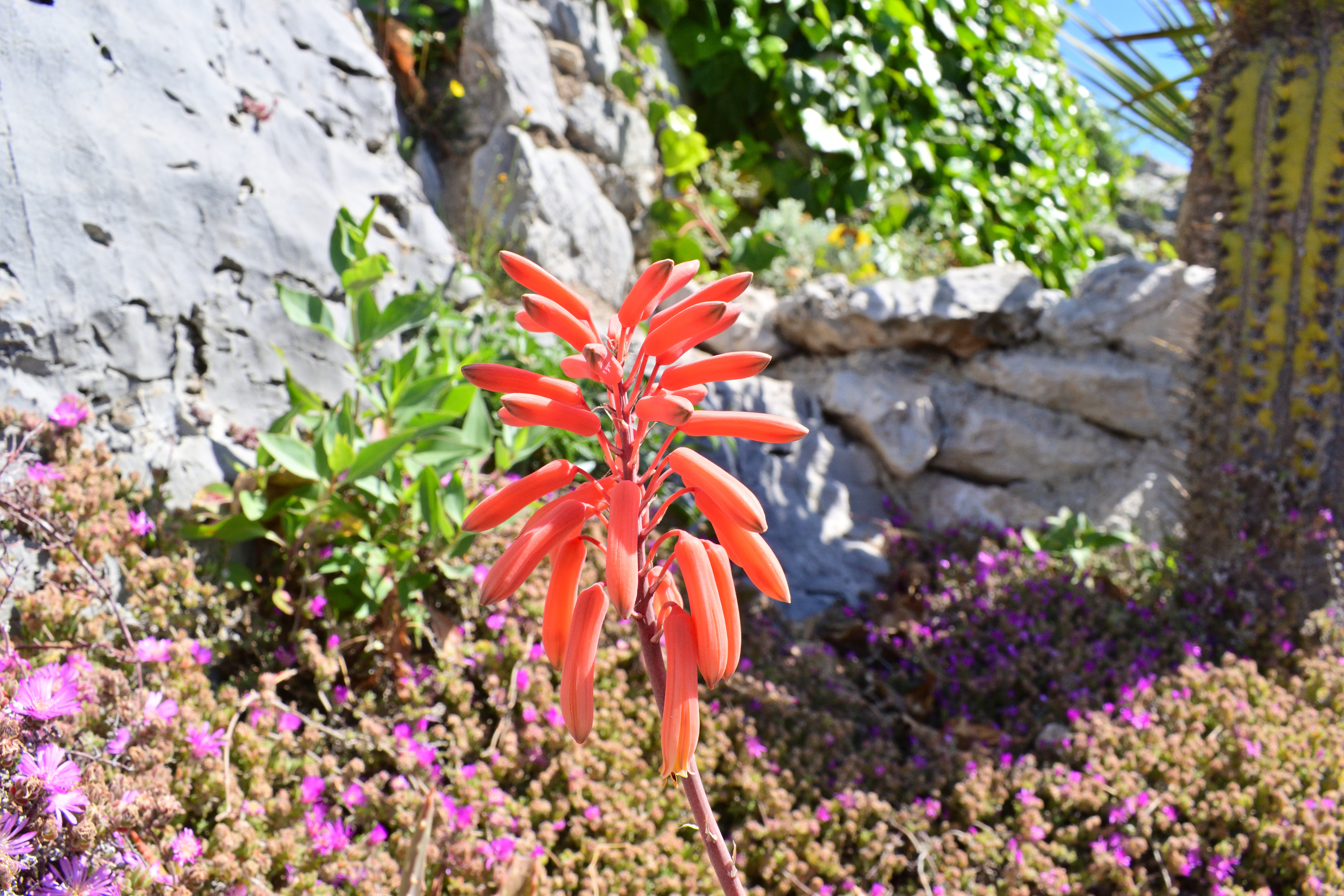 真ん中にある赤い花をつけた植物は「キダチアロエ」だ。 南アフリカ原産で、葉は食用すると胃薬としての効果や、火傷を癒す効果があるそうだ。
