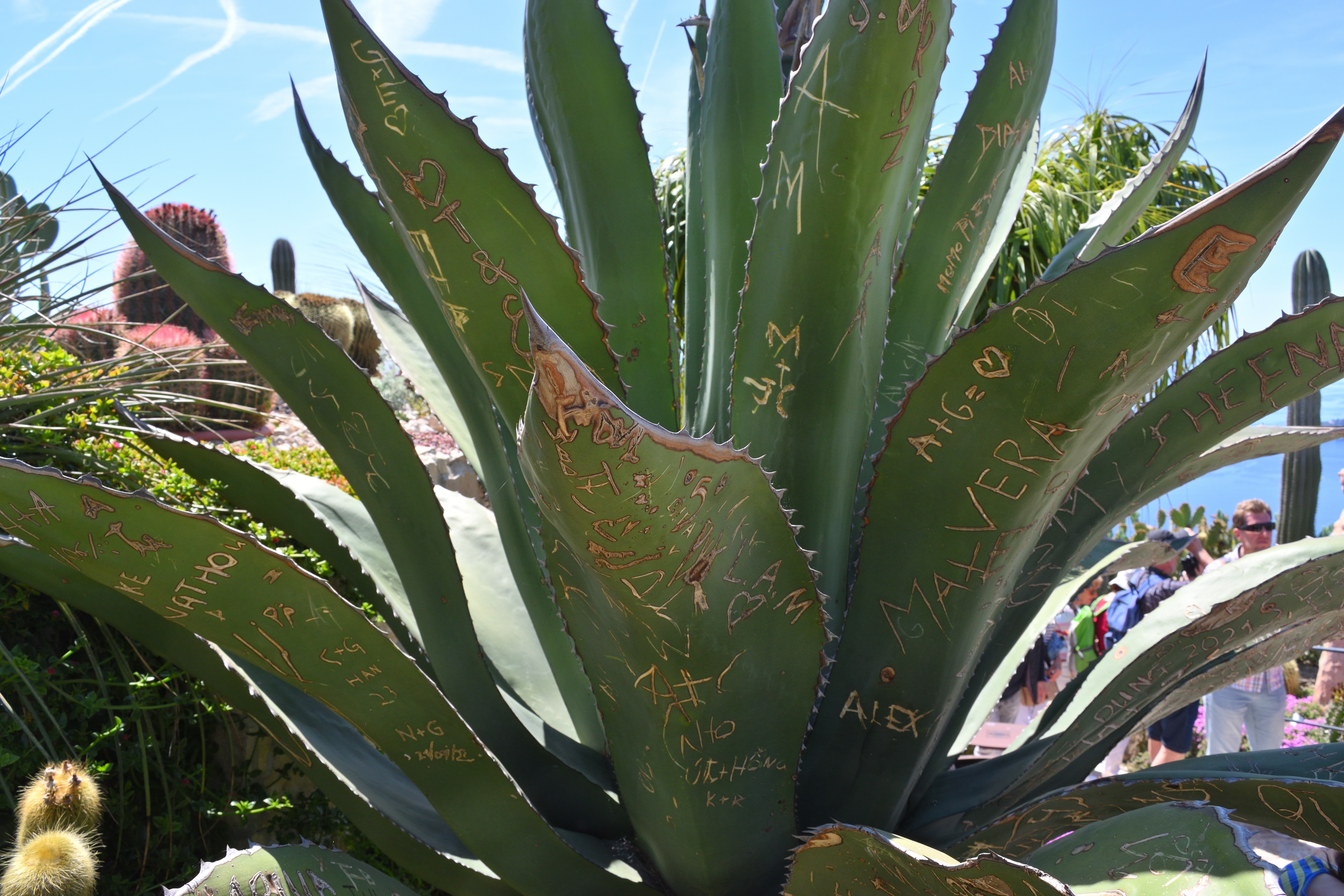 そしてこちらの観光客にタトゥーを彫られてしまった植物は、アガベ・サルミアナと言うメキシコ原産のサボテンだ。 アロエに似ているが、サボテンのようだ。 大きくなると 3~4m の大きさになるらしい。