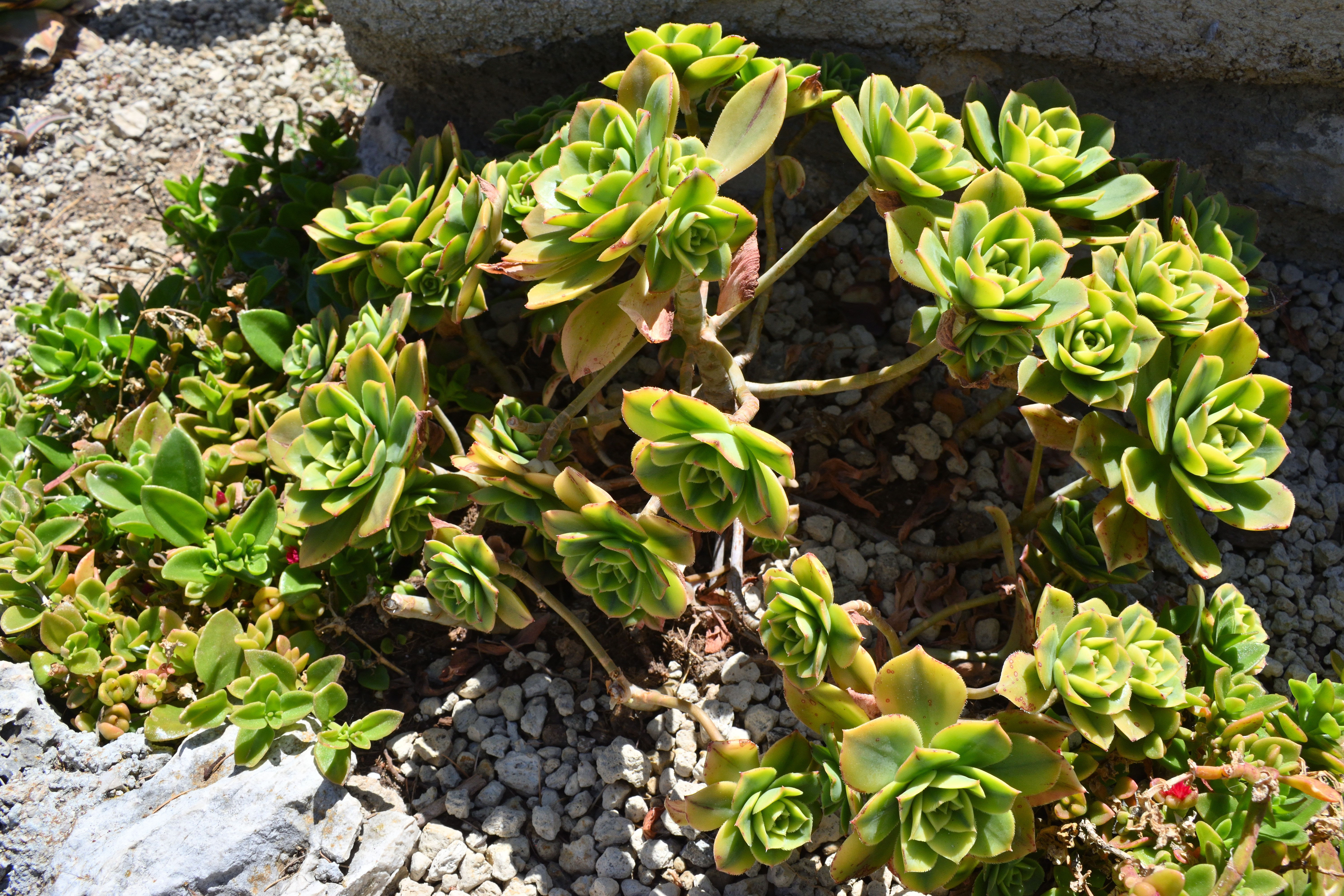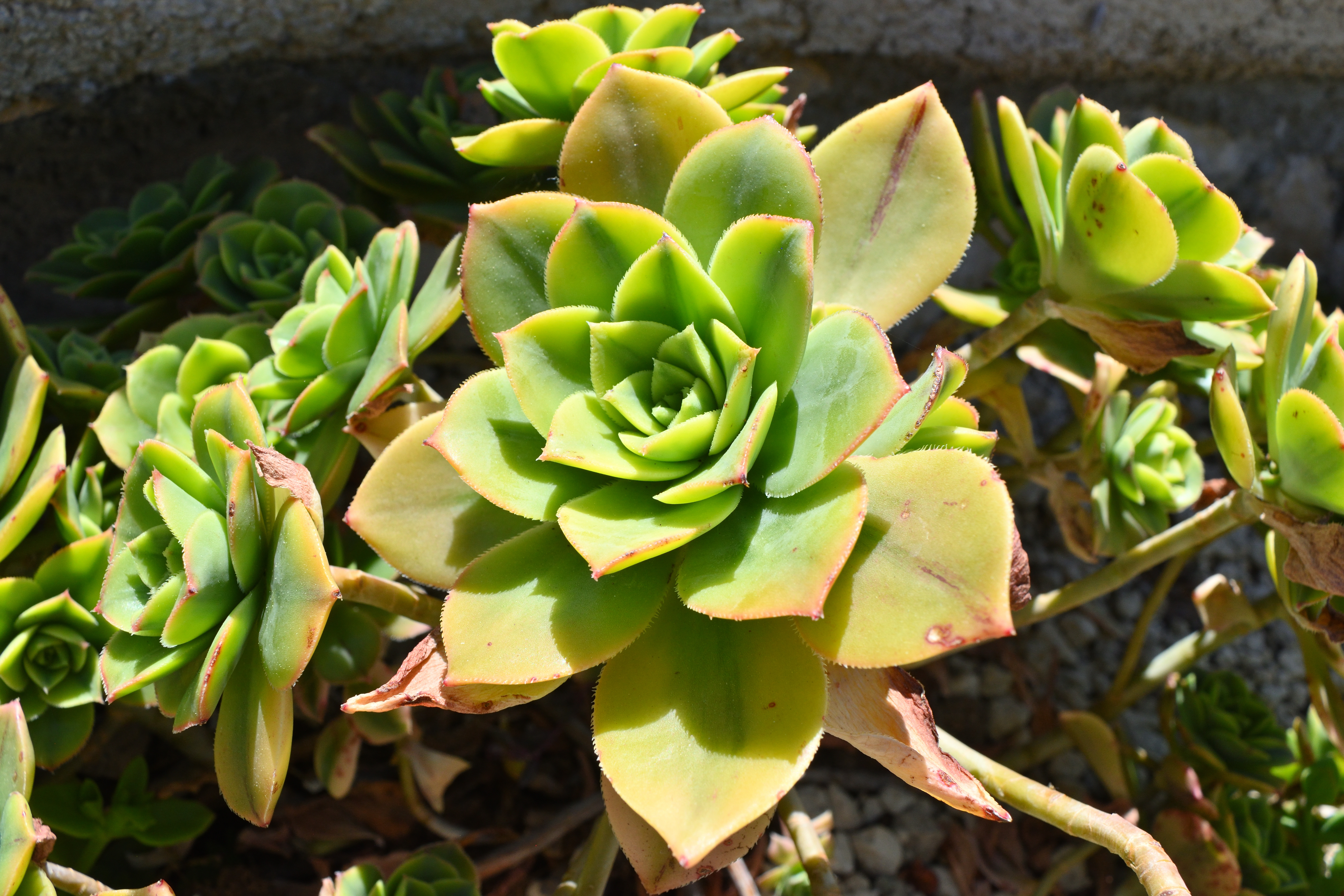 これは「夕映え」という和名がついた多肉植物で、アフリカ北西部のカナリア諸島が原産だ。 花のように広がった葉が綺麗だ。 葉の縁がピンク色に色付いているのも美しい。