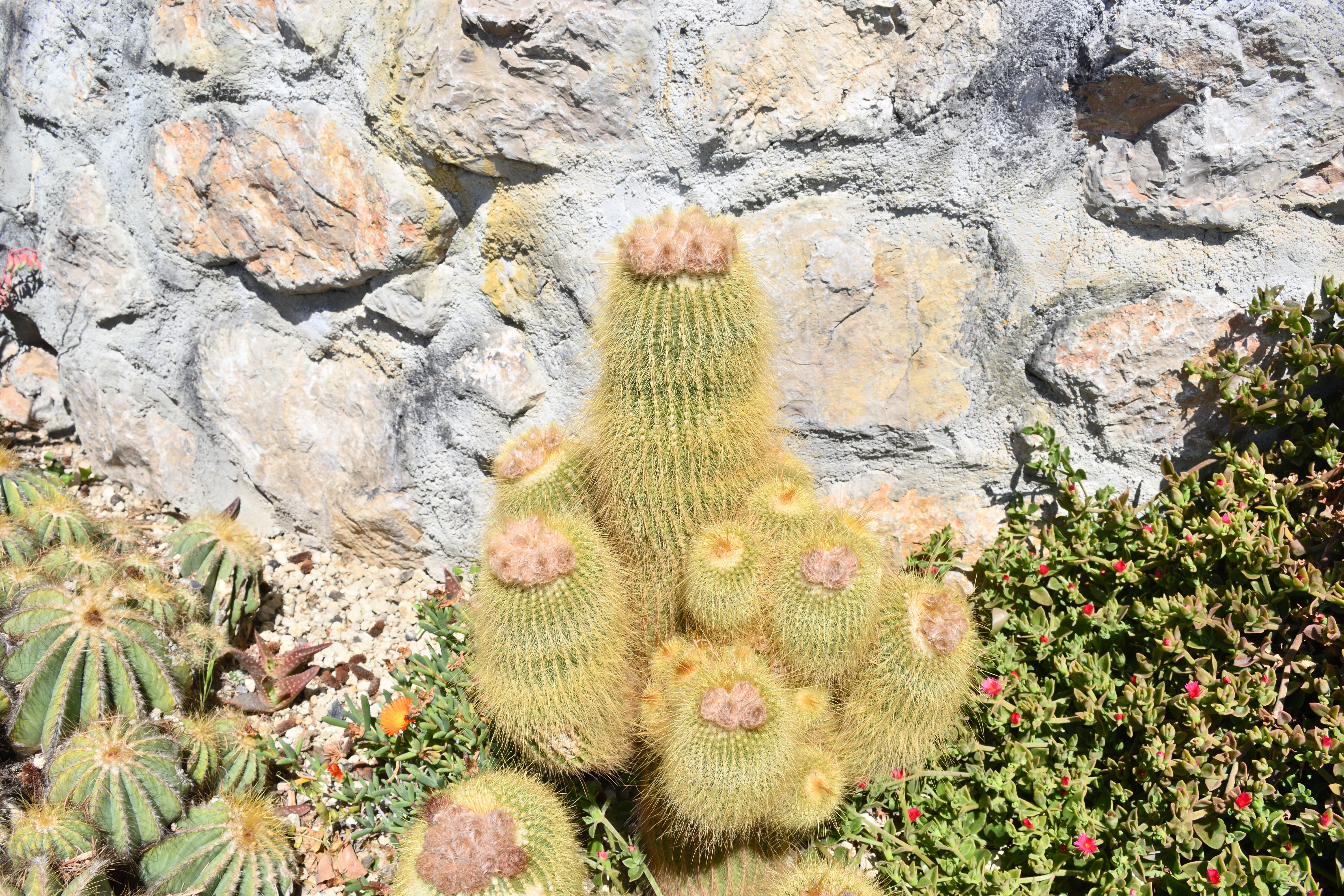 左側に立っている大きいサボテンは、ギリシャ語で「山のろうそく」を意味する「オレオセレウス・セルシアヌス」だ。 南アメリカ原産らしい。