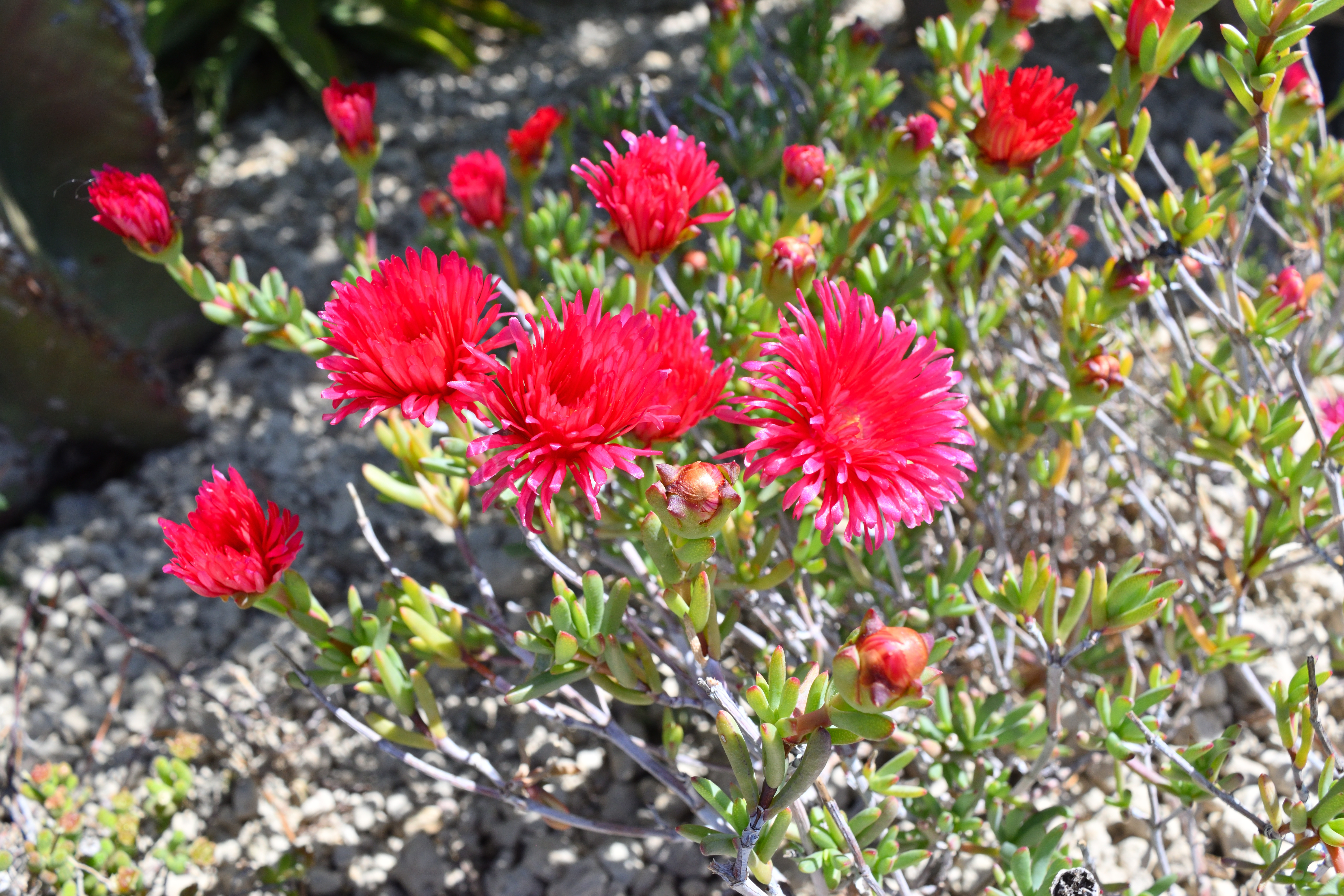 そしてこれは「マレフォラ・クロセア」、別名「レッド・アイス・プラント」と呼ばれるアフリカ原産の植物だ。 燃えるような赤色がとても綺麗だった。