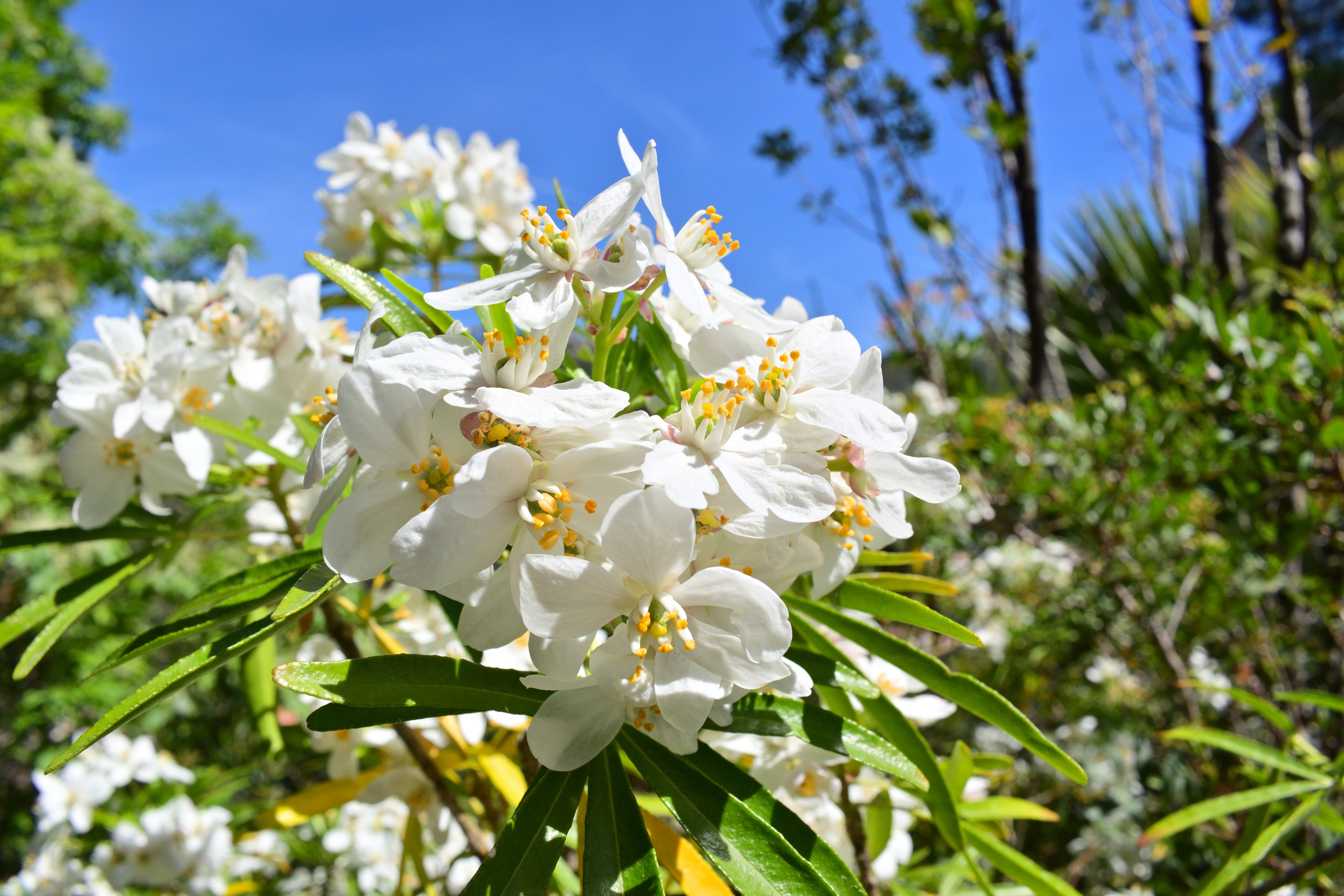 この白く綺麗な花は、「チョイシア・テルナータ」という名前の花で、メキシコが原産のようだ。 地中海ゾーンのはずなのだが、熱帯の植物も植えられているようだ。